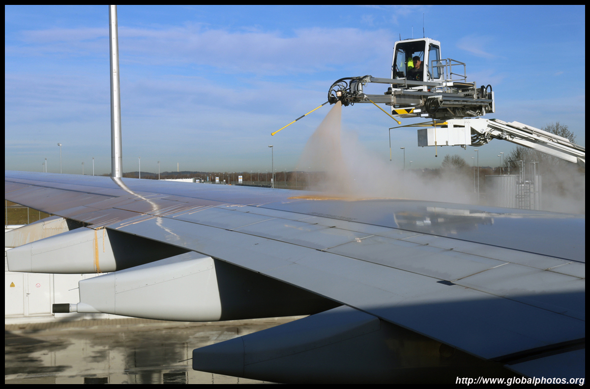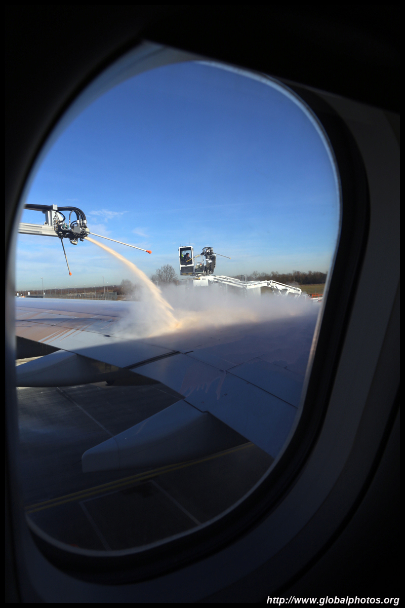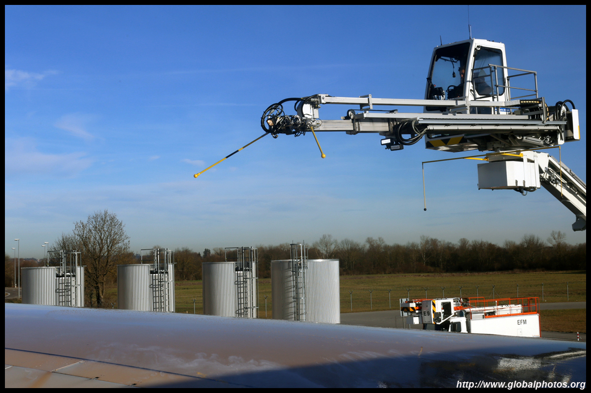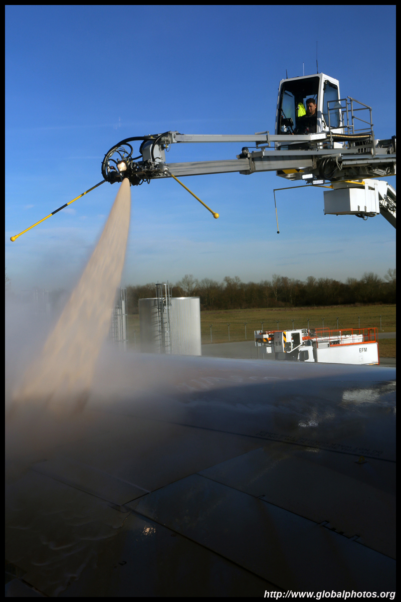 It was a bit chilly this morning, so the pilot decided to de-ice before we take off. We taxied to a spot near the take-off position and the sprayers arrived shortly.