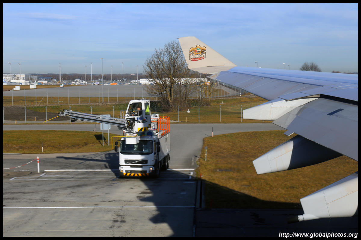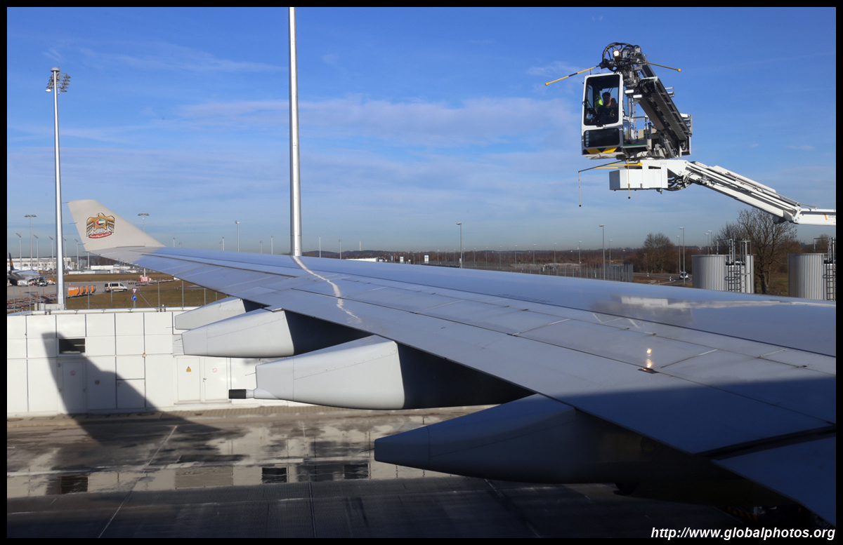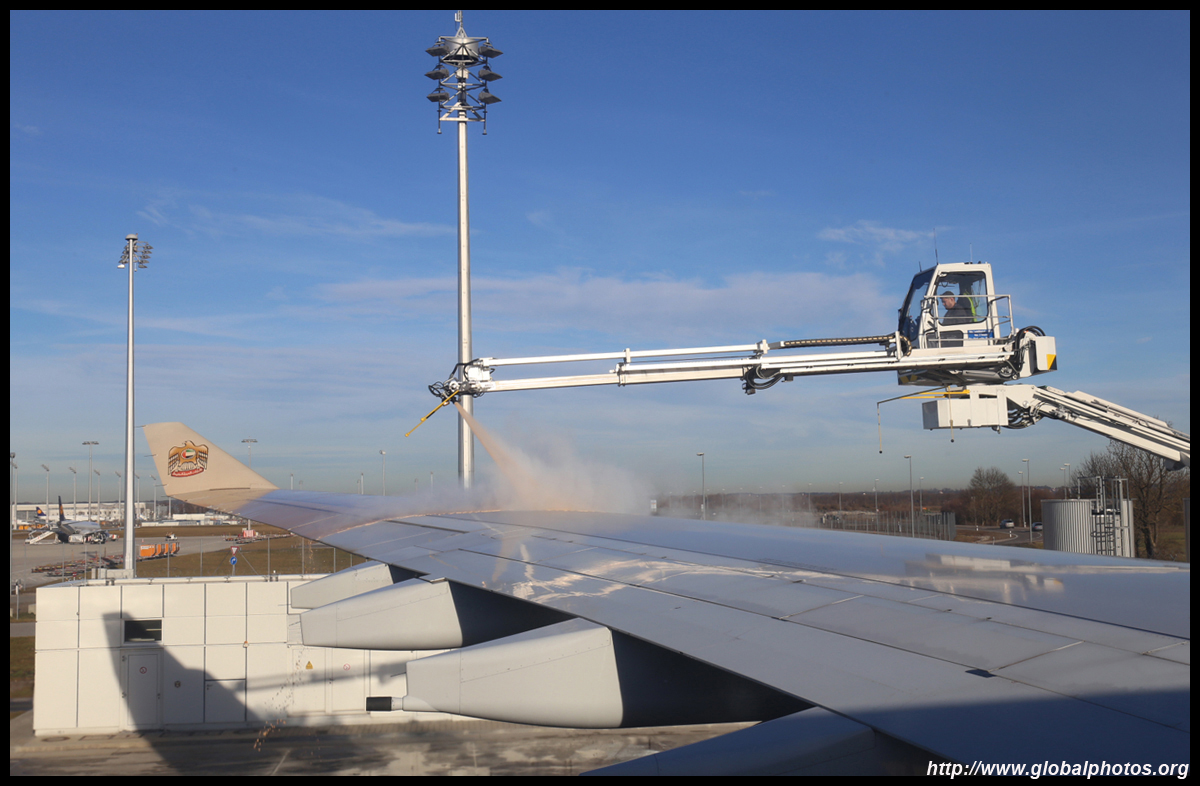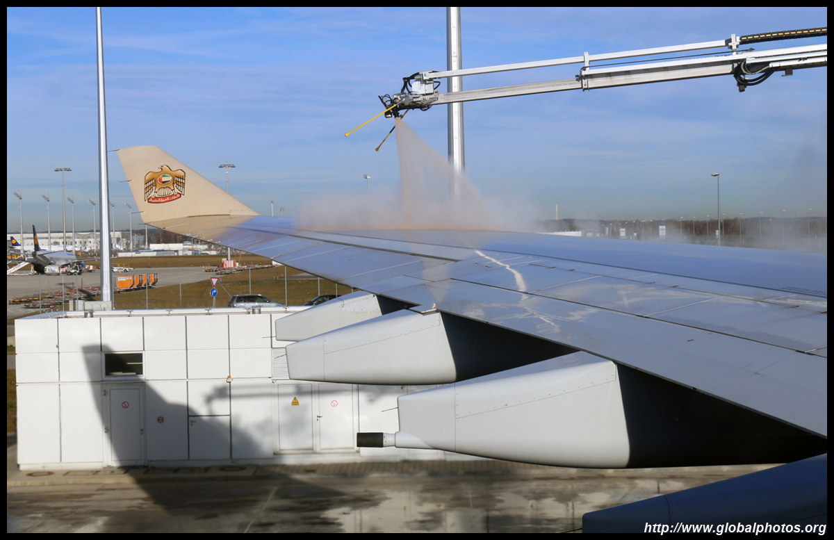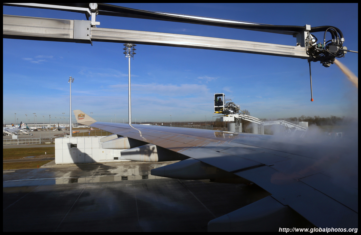 It was a bit chilly this morning, so the pilot decided to de-ice before we take off. We taxied to a spot near the take-off position and the sprayers arrived shortly.