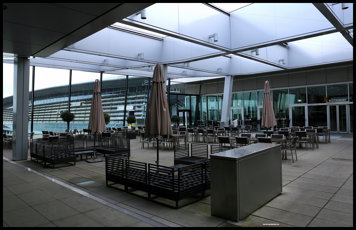 The airport authorities try to make the best of it by adding small amenities such as these tables and chairs with window views of the tarmac activity, but with so many people passing by getting to their flights, it's not really a nice place to linger around for too long.