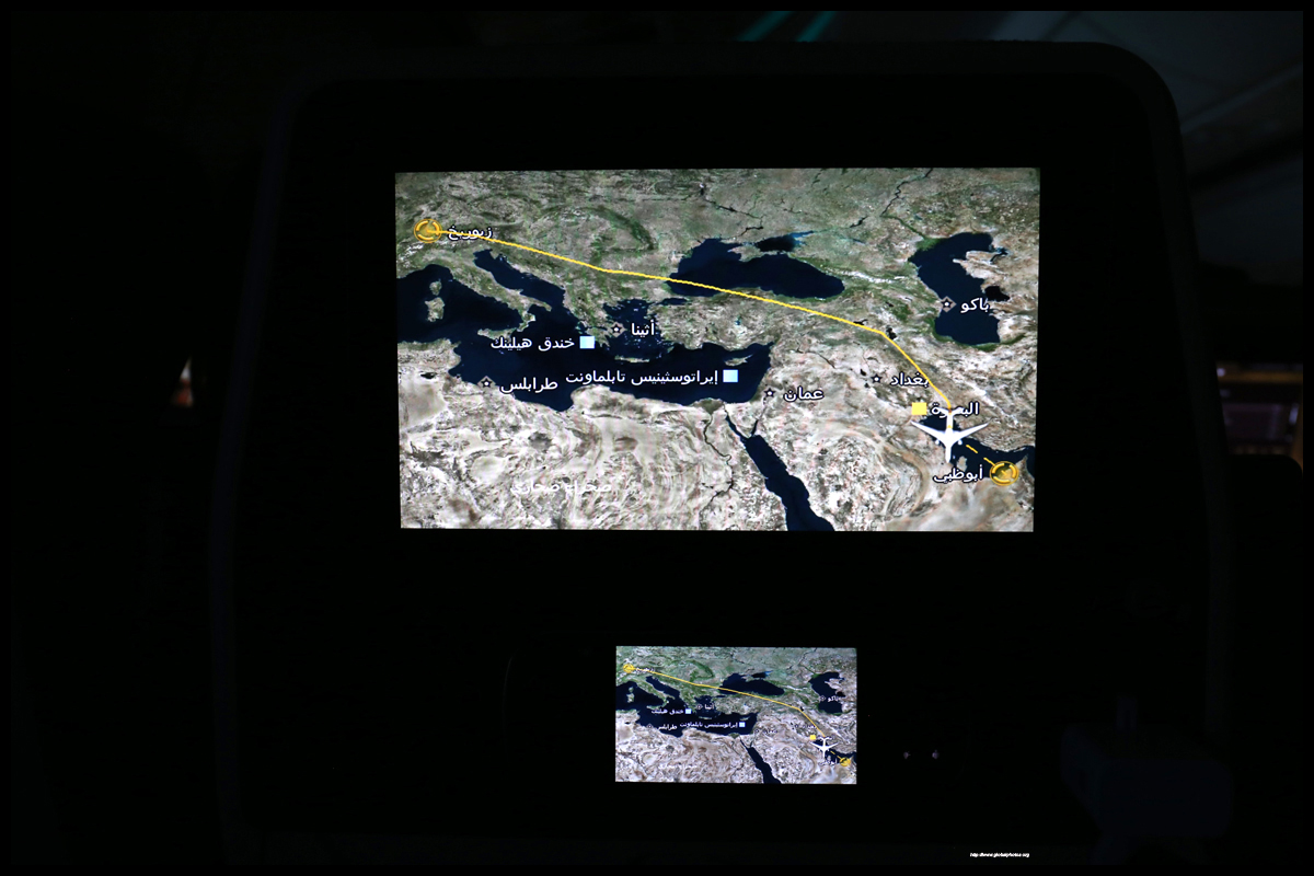 When flying a Middle Eastern airline, one of my least worries is to get hungry or to eat bad-tasting food. They tend to get the catering right. I picked the chicken with mashed potatoes for lunch, which included a good portion of vegetables, a large salad, and prepackaged cheesecake. Notice the metal cutlery, which many other legacy airlines have gone to plastic these days.