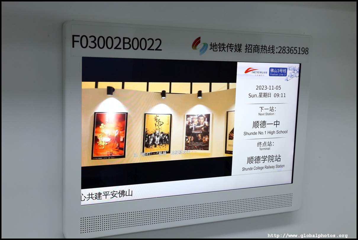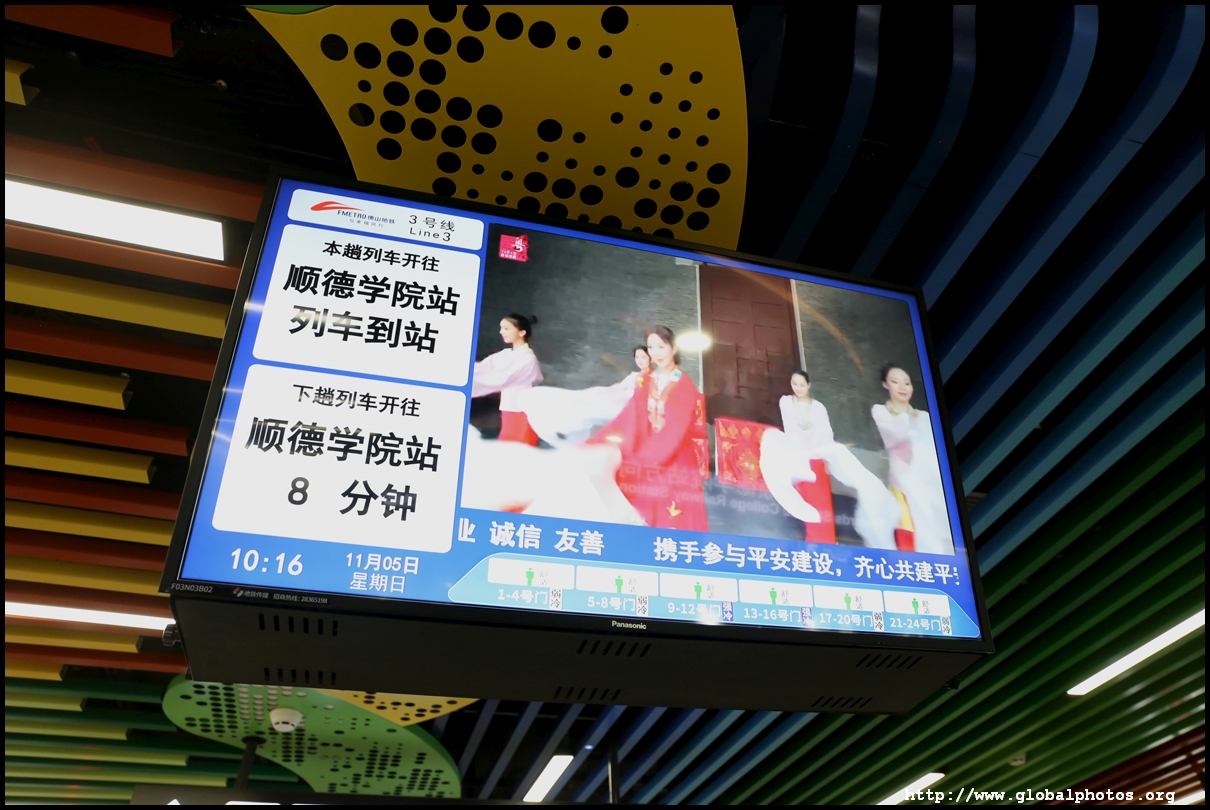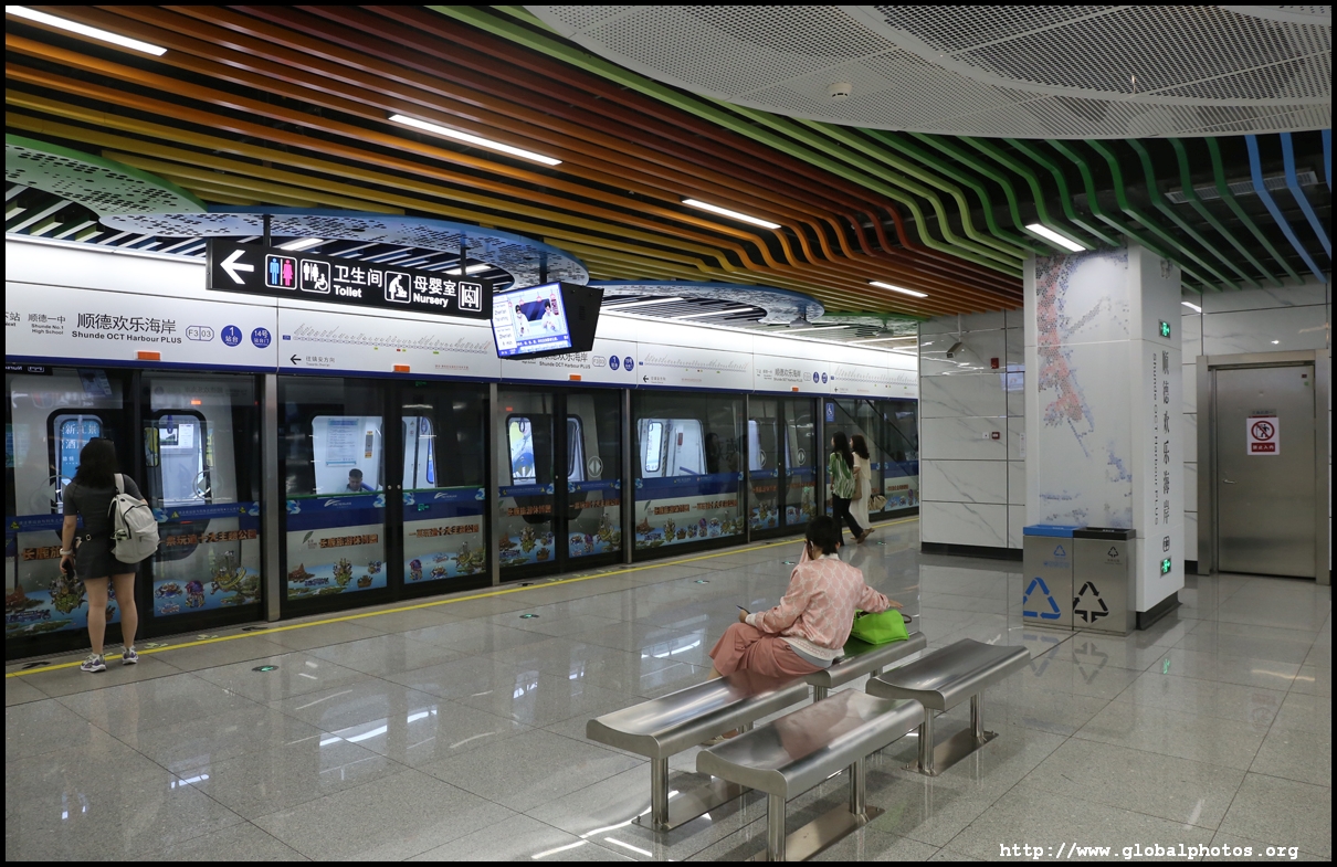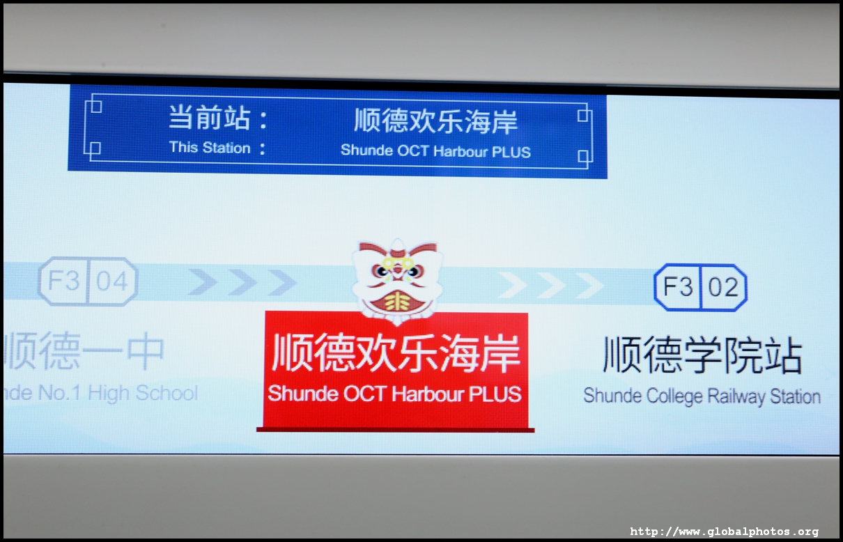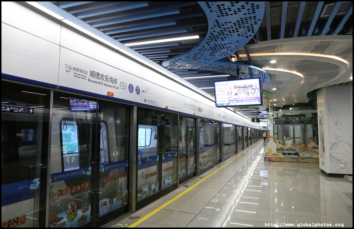 Foshan is located just south of Guangzhou and has its own metro network that is connected to Guangzhou's system. It has 3 lines with this page featuring line 3, which runs through Shunde and opened in late 2022.Service is not too frequent at 8 minute intervals during the off peak. Monitors on the platform show how crowded train cars are as well as the standard next arrival details.