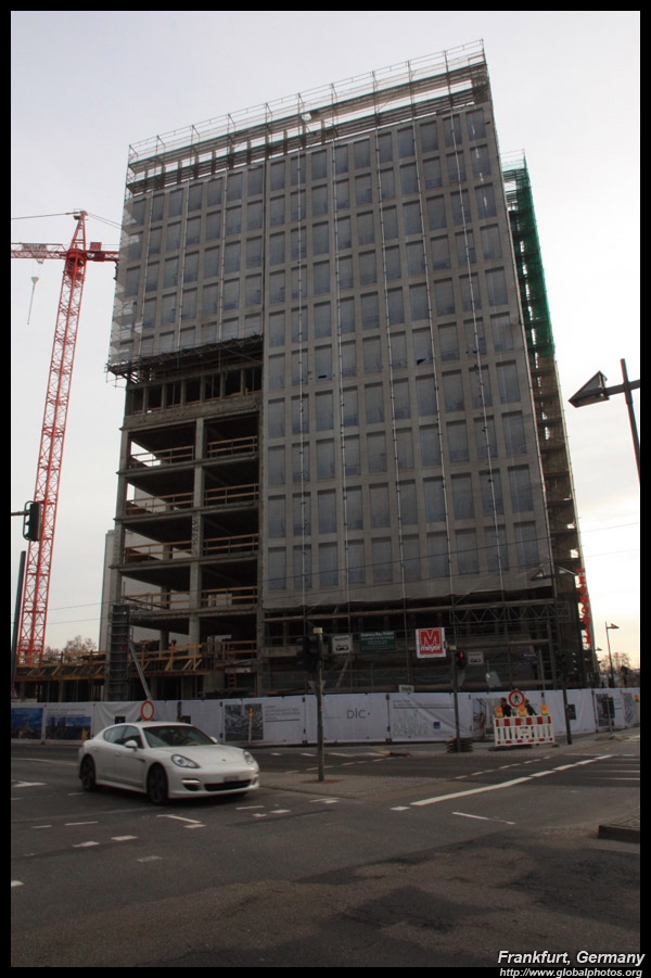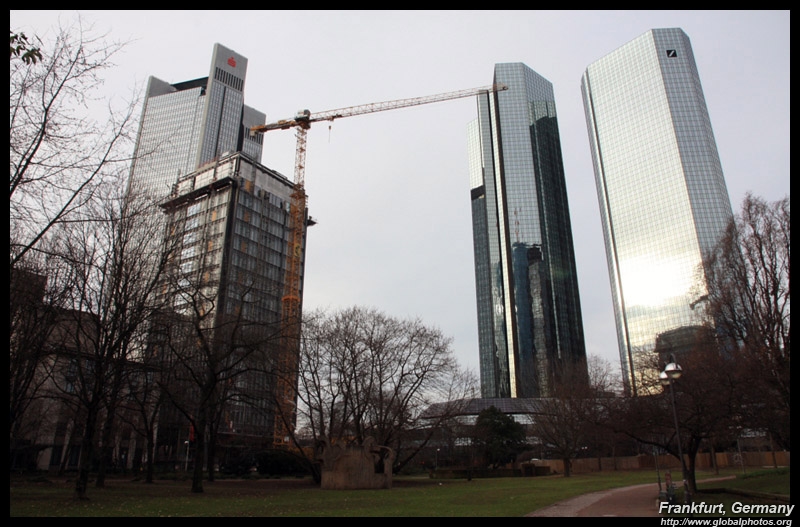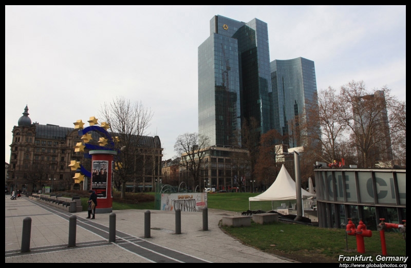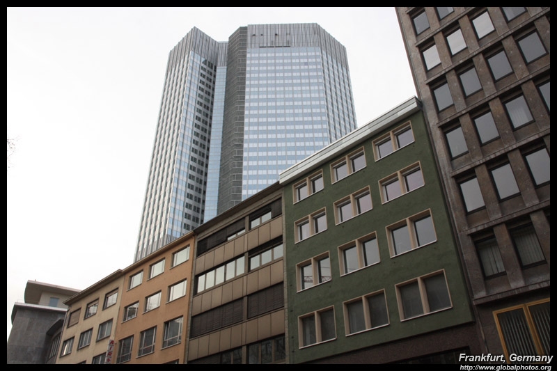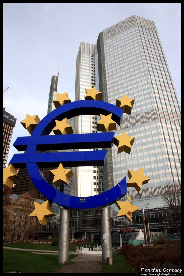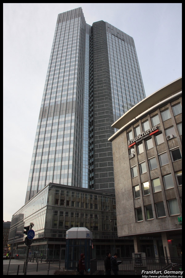The 149m Eurotower is the headquarters of the European Central Bank. The euro logo is eeringly on display in the lawn outside as several member countries were on the verge of economic collapse at the time.