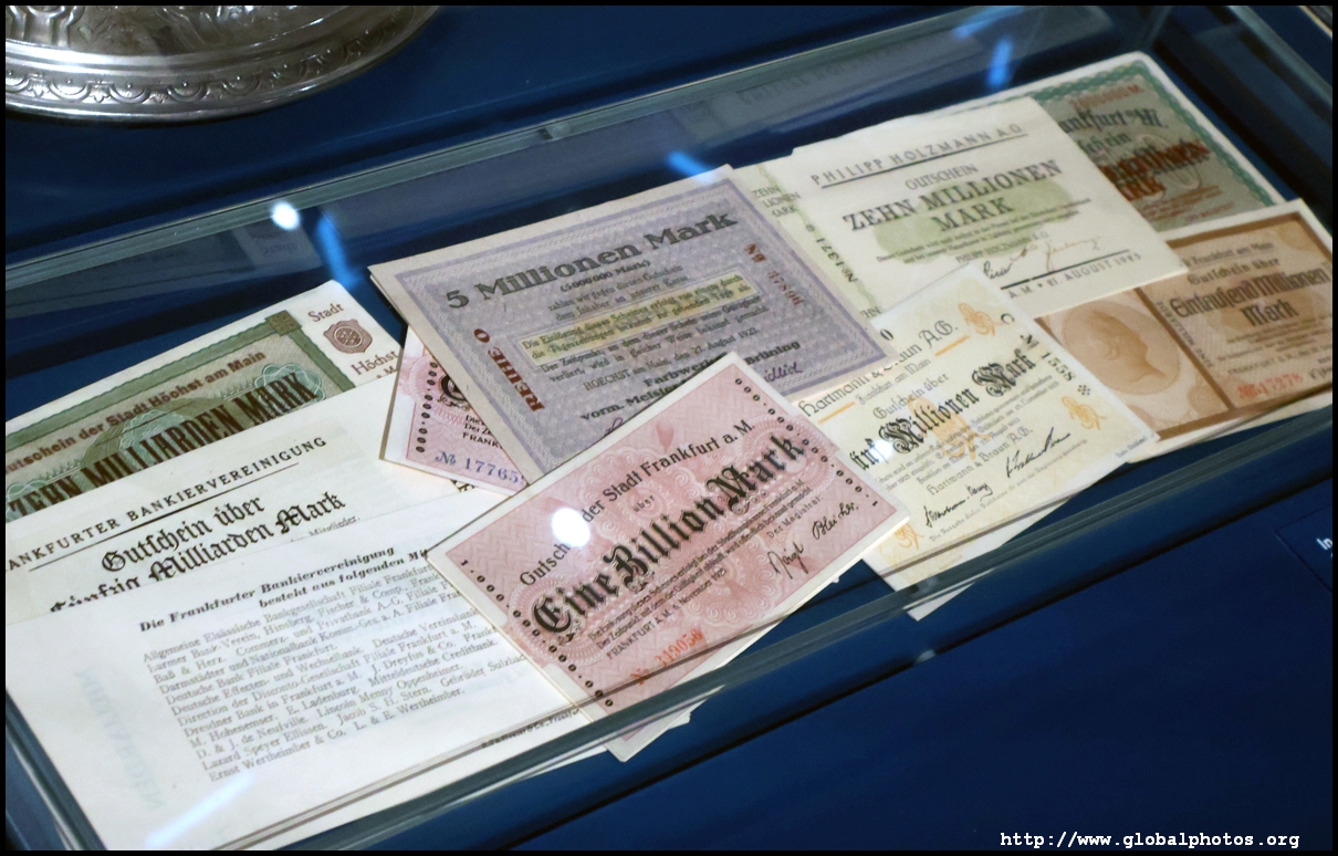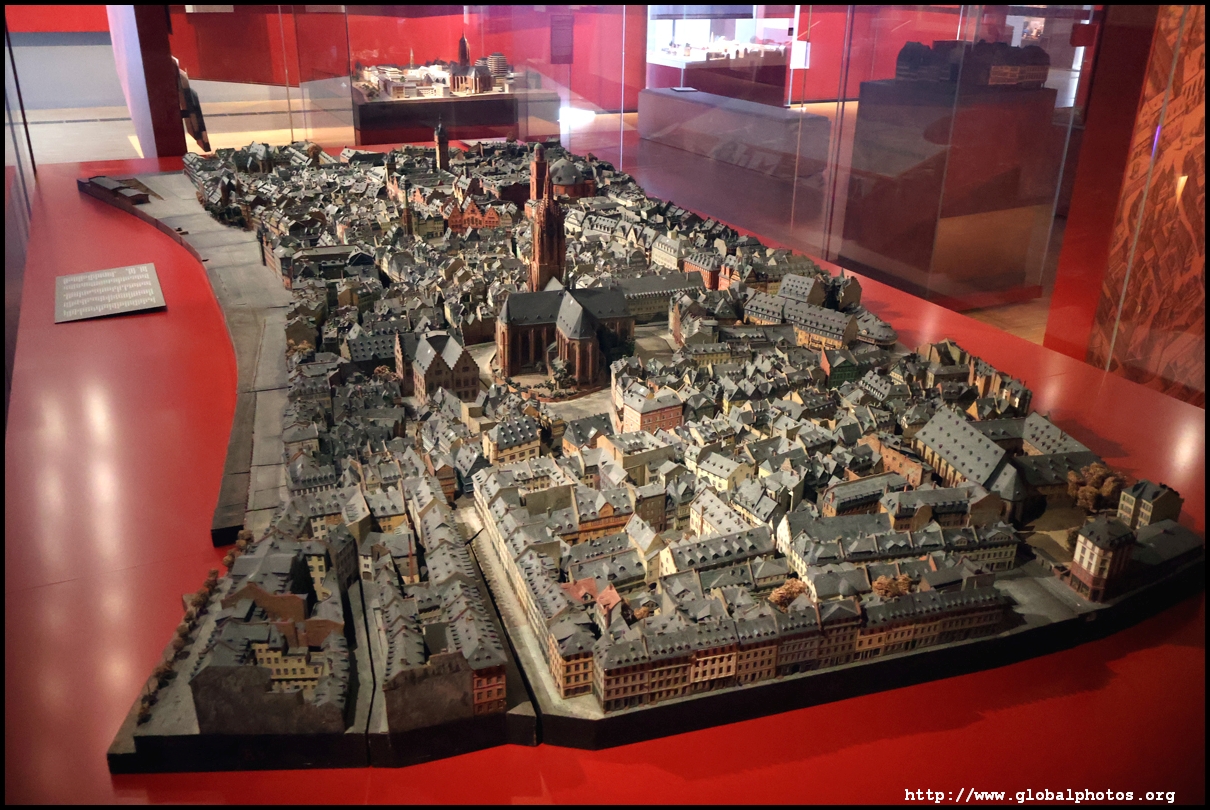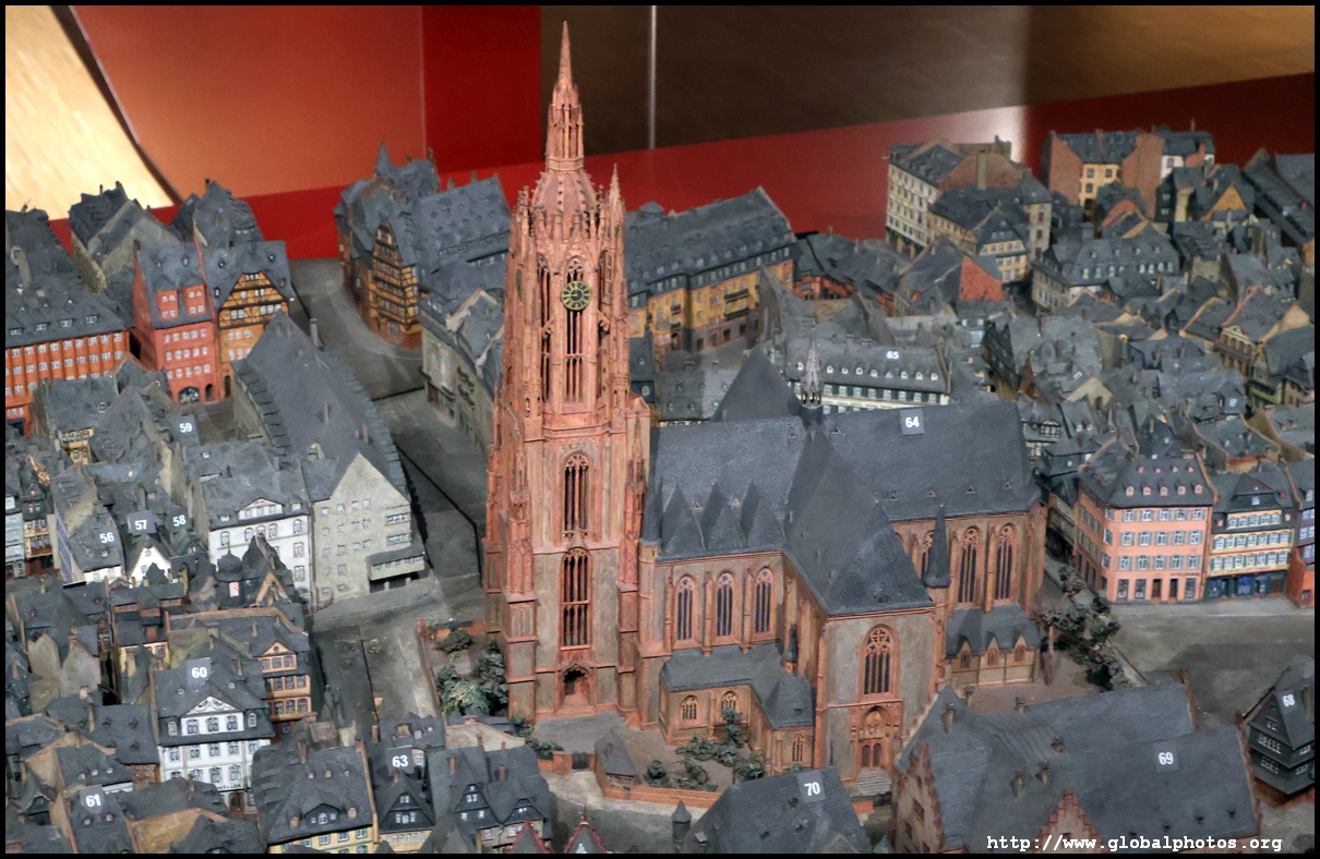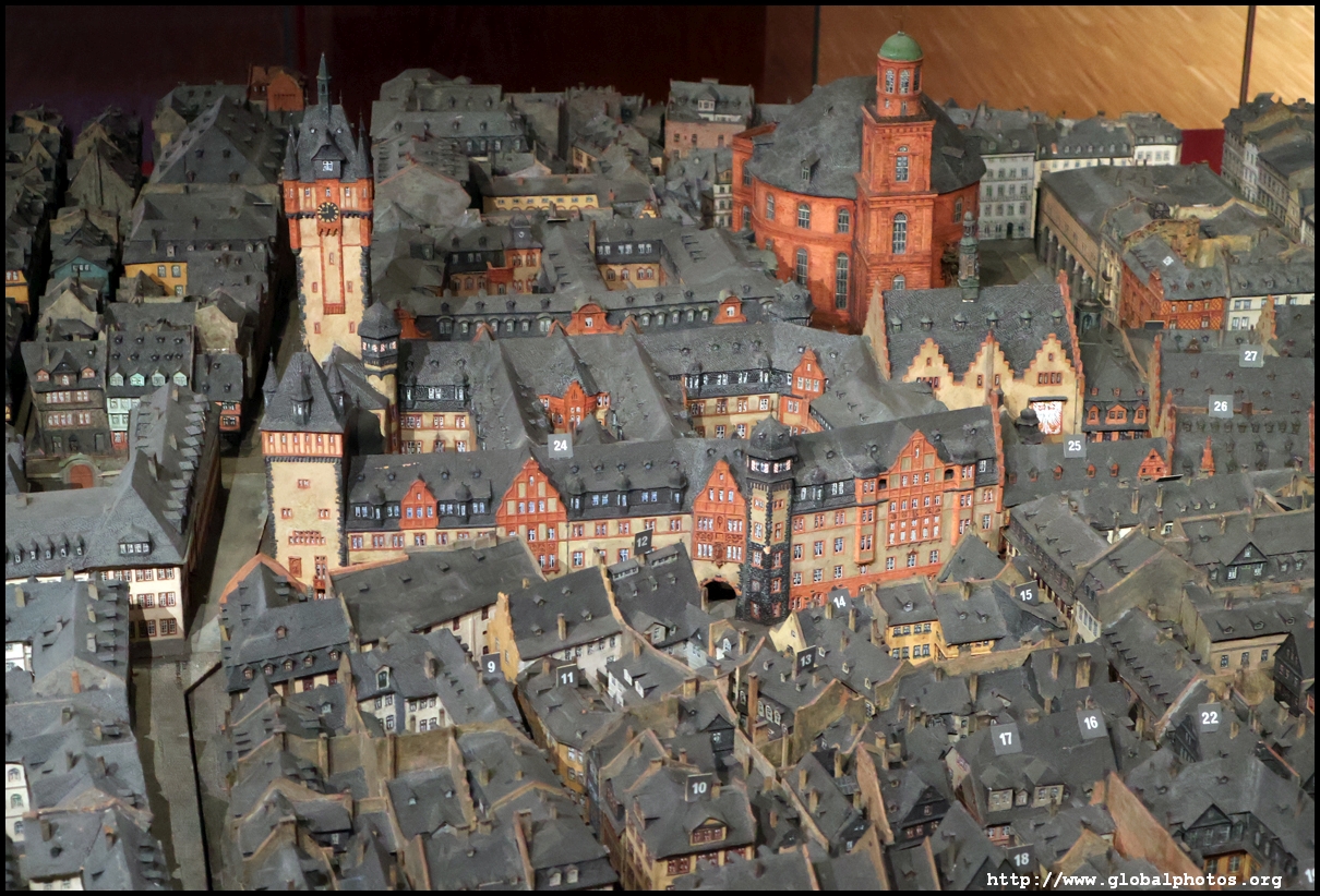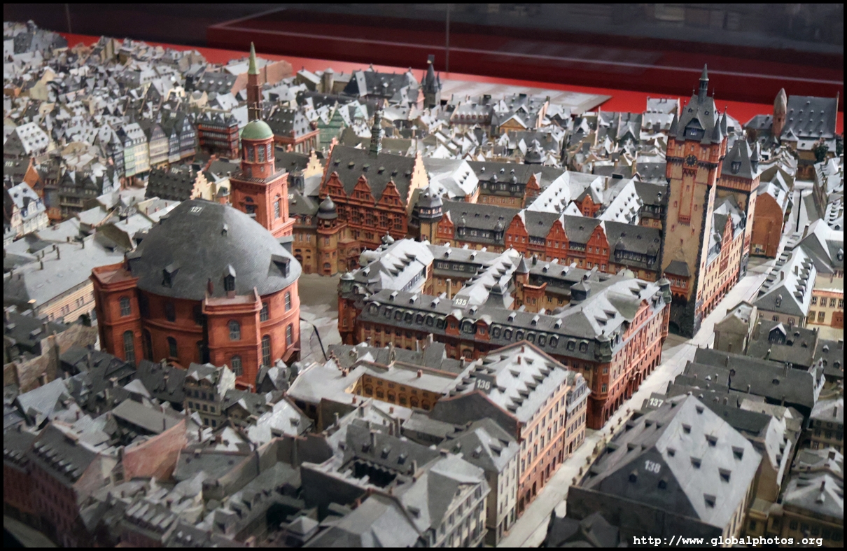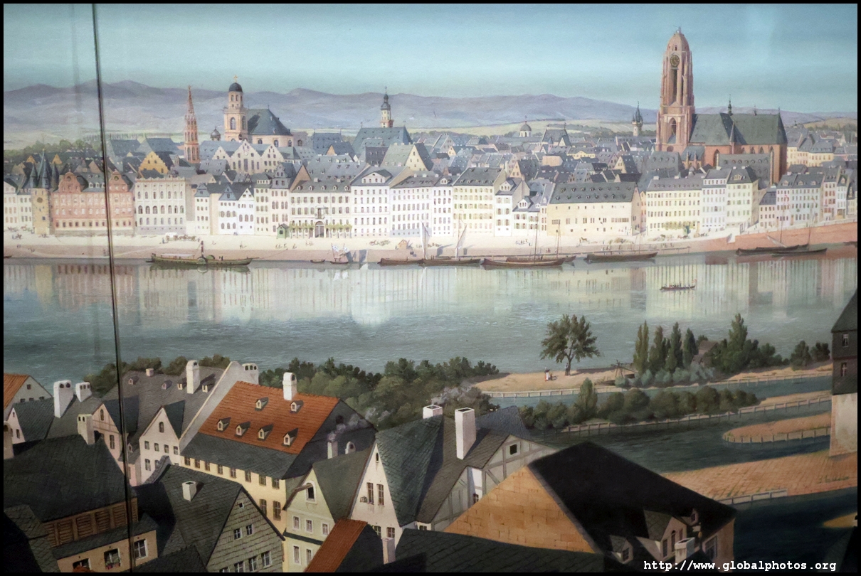 In the 1764 coronation of Joseph II, the ox was roasted for the festive banquet in the town hall. The emperor hosted a public celebration in the Romerberg with a ritual piece of the ox. On the left is the ox head that was won by the wine merchants and was donated to the museum in 1879. To the right is the bridge rooster from the Alte Brucke that dates from repairs in the 18th century, although the first written account of this rooster goes further back to 1401, marking the deepest point in the river and the spot to hold executions by drowning. The English first connected cholera and contaminated water and developed sewage systems to prevent epidemics. In 1864, Frankfurt decided to build a gravity-based system of sewers, with the waste water being directed to a newly-built sewage plant. The first sewage treatment plant in Europe opened in Franfurt in 1887. This drove a boom in the toilet business, with the item on the right imported from England. These panels were used from 1898 to 1927 at a factory to control the charge of the accumulator batteries. These are guild emblems for the "Fountain of German Crafts", which came about after Hitler awarded the city the title of "City of German Crafts" in 1935. This fountain was never fully realized due to World War II, and these pieces ended up here at the museum. These protest placards ere aimed at IG Farben's annual meetings. Holocaust survivors, antifascist organizations, and the like campaigned for proper compensation and breaking up the company, which had used forced labour at concentraton camps and their products helped kill Jews in the gas chambers. On the left is the flag of the 14th quarter. Frankfurt was divided into 14 quarters in 1614. A new flag was devised to celebrate Leopold II's coronation in 1790. This is a model of Deutsche Bank's headquarters, which consist of 2 towers reaching 155m that opened in 1985. While the bank was originally founded in Berlin in 1870, it was divided into regional banks after World War II, with the final successor based in Frankfurt in 1957. Hyperinflation in 1923 prompted cities and municipalities to print emergency money, which made things worse. The Alte Brucke directed traffic into the city and was repaired many times since the 13th century.
