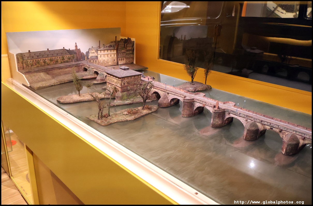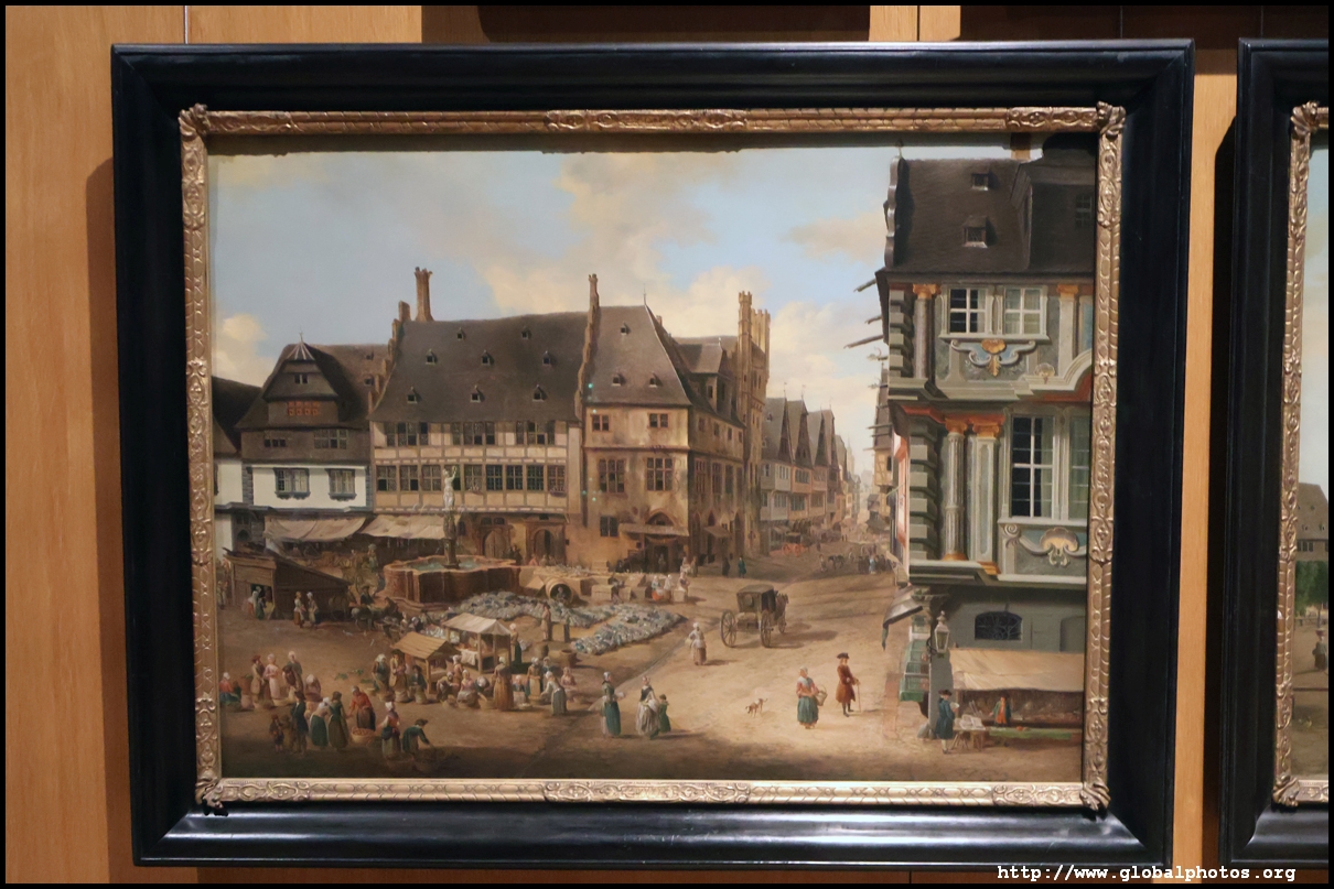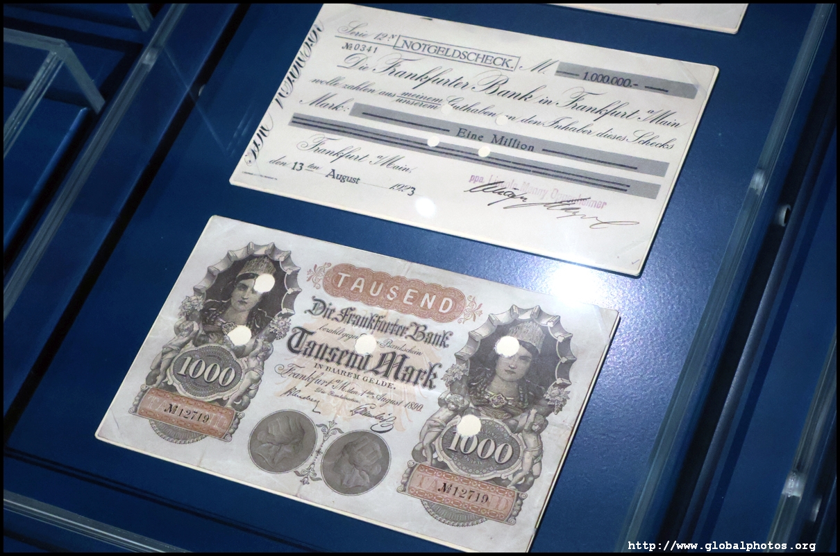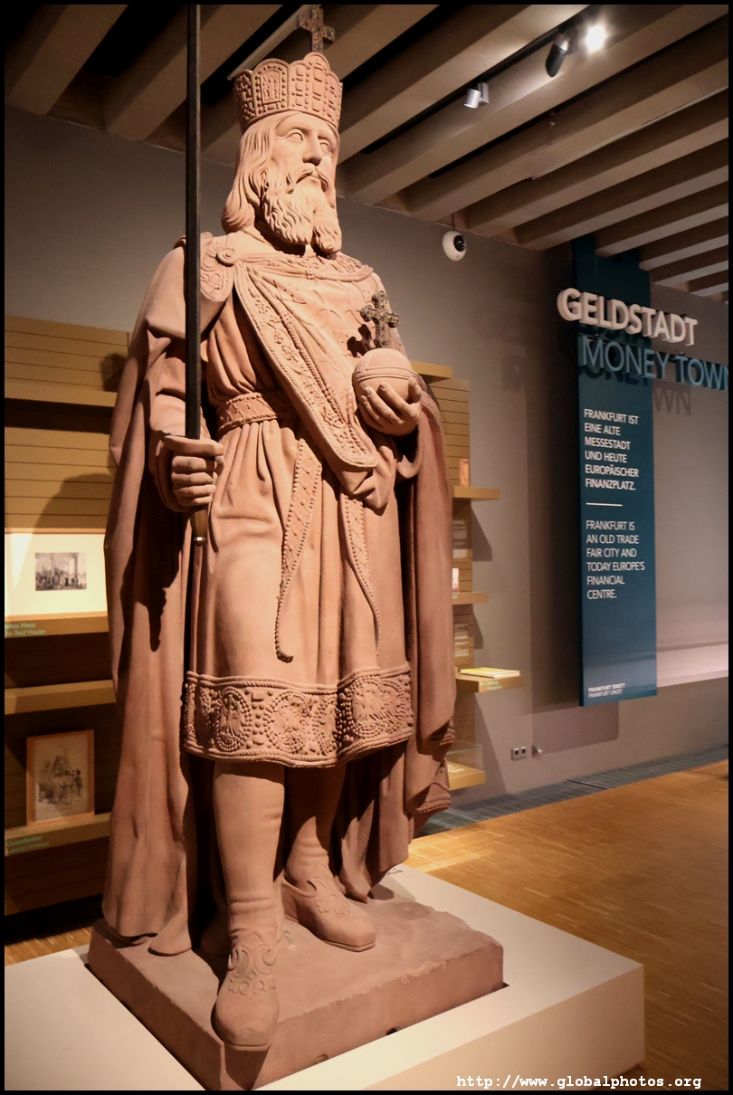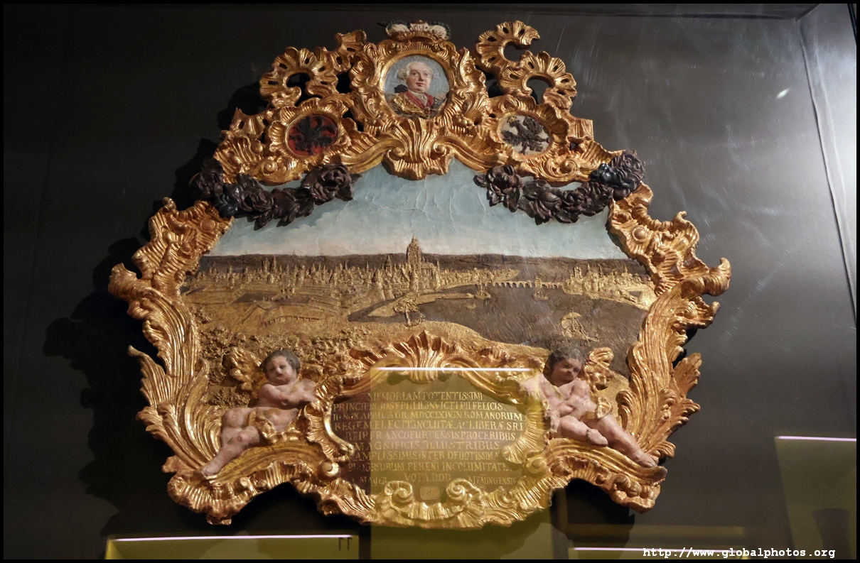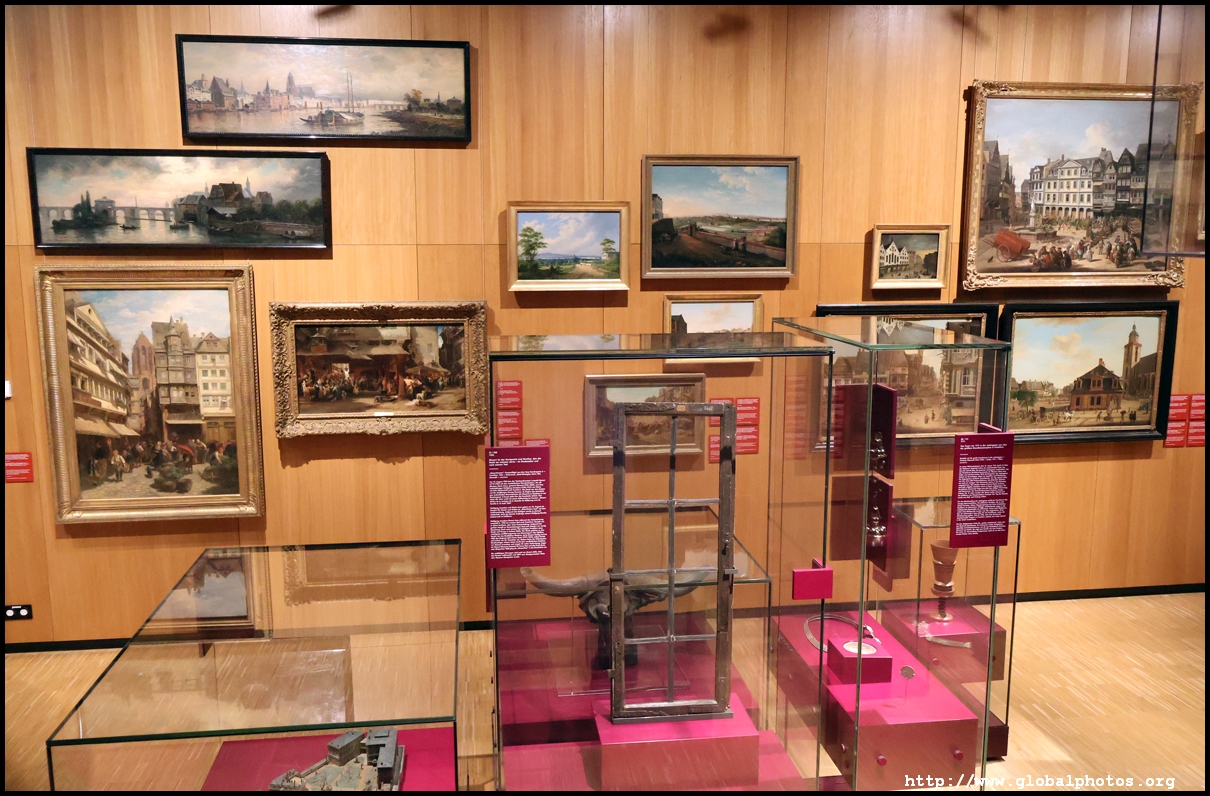 In the 1764 coronation of Joseph II, the ox was roasted for the festive banquet in the town hall. The emperor hosted a public celebration in the Romerberg with a ritual piece of the ox. On the left is the ox head that was won by the wine merchants and was donated to the museum in 1879. To the right is the bridge rooster from the Alte Brucke that dates from repairs in the 18th century, although the first written account of this rooster goes further back to 1401, marking the deepest point in the river and the spot to hold executions by drowning. The English first connected cholera and contaminated water and developed sewage systems to prevent epidemics. In 1864, Frankfurt decided to build a gravity-based system of sewers, with the waste water being directed to a newly-built sewage plant. The first sewage treatment plant in Europe opened in Franfurt in 1887. This drove a boom in the toilet business, with the item on the right imported from England. These panels were used from 1898 to 1927 at a factory to control the charge of the accumulator batteries. These are guild emblems for the "Fountain of German Crafts", which came about after Hitler awarded the city the title of "City of German Crafts" in 1935. This fountain was never fully realized due to World War II, and these pieces ended up here at the museum. These protest placards ere aimed at IG Farben's annual meetings. Holocaust survivors, antifascist organizations, and the like campaigned for proper compensation and breaking up the company, which had used forced labour at concentraton camps and their products helped kill Jews in the gas chambers. On the left is the flag of the 14th quarter. Frankfurt was divided into 14 quarters in 1614. A new flag was devised to celebrate Leopold II's coronation in 1790. This is a model of Deutsche Bank's headquarters, which consist of 2 towers reaching 155m that opened in 1985. While the bank was originally founded in Berlin in 1870, it was divided into regional banks after World War II, with the final successor based in Frankfurt in 1957. Hyperinflation in 1923 prompted cities and municipalities to print emergency money, which made things worse. The Alte Brucke directed traffic into the city and was repaired many times since the 13th century.