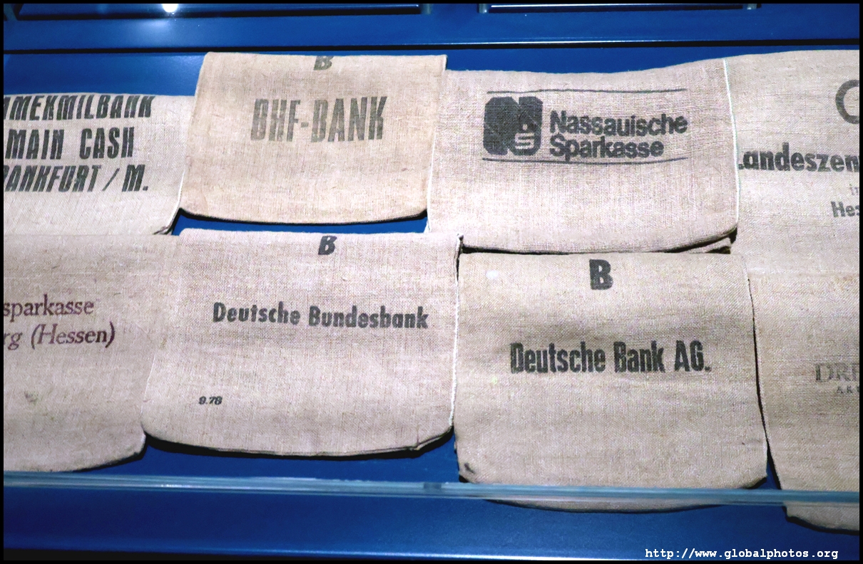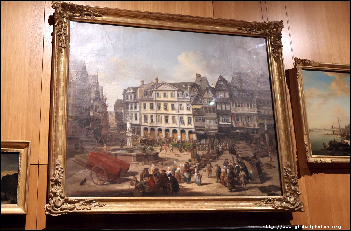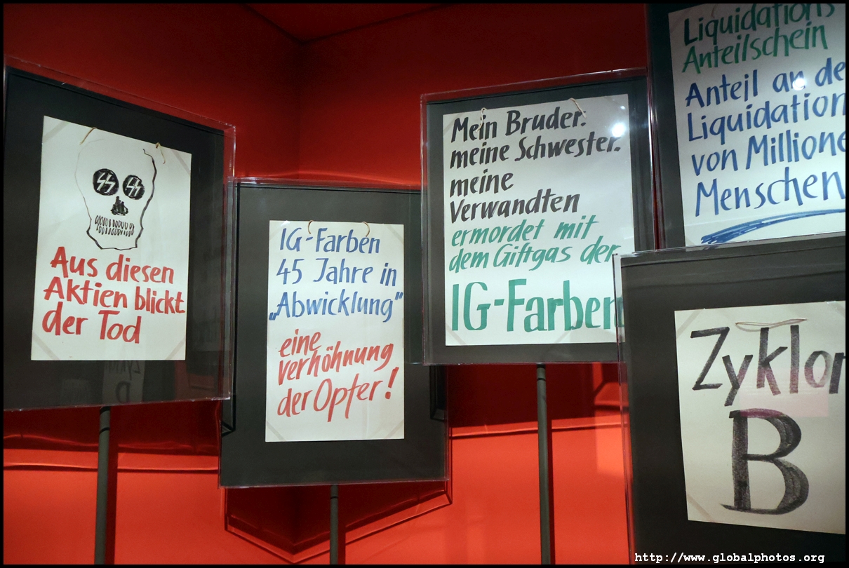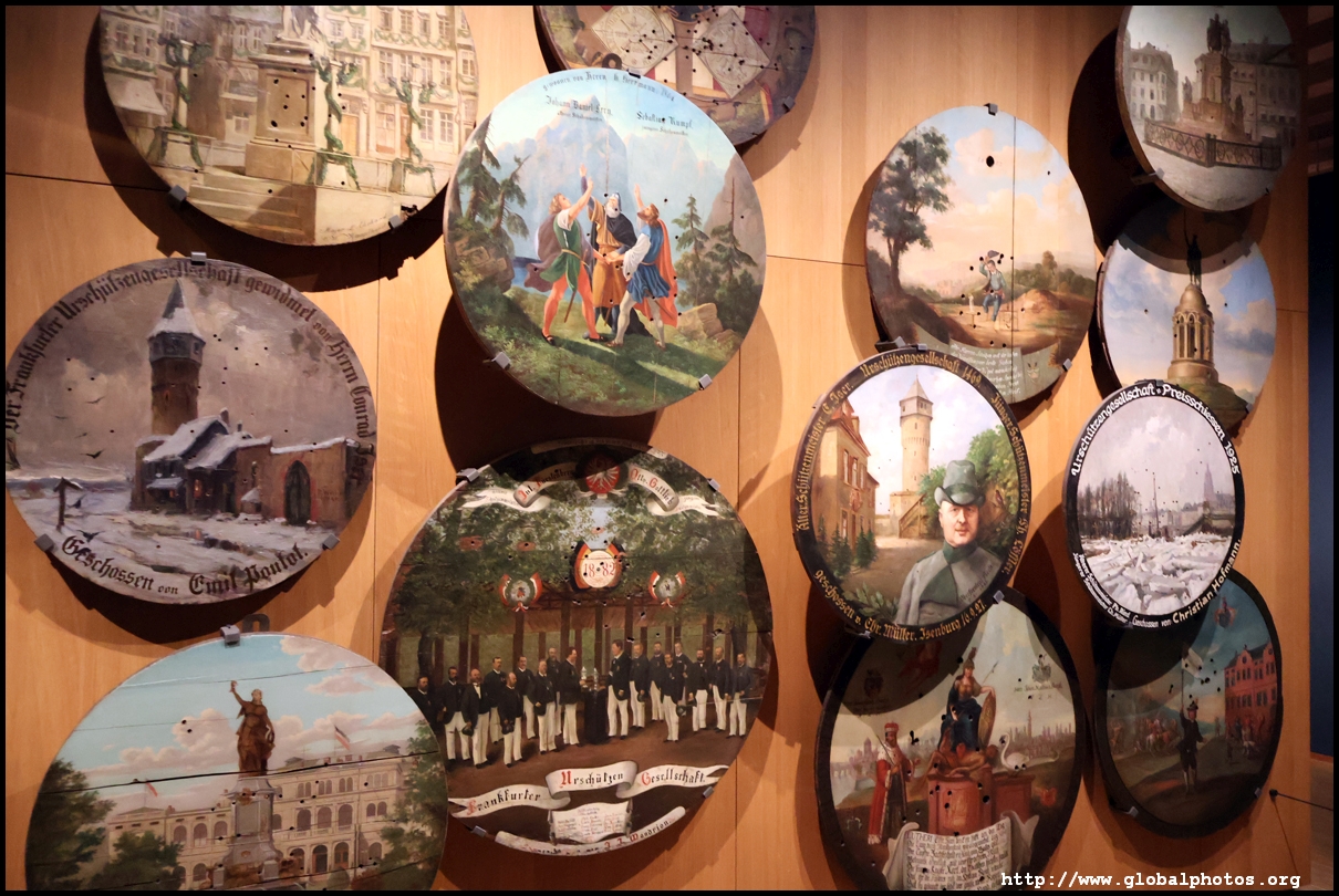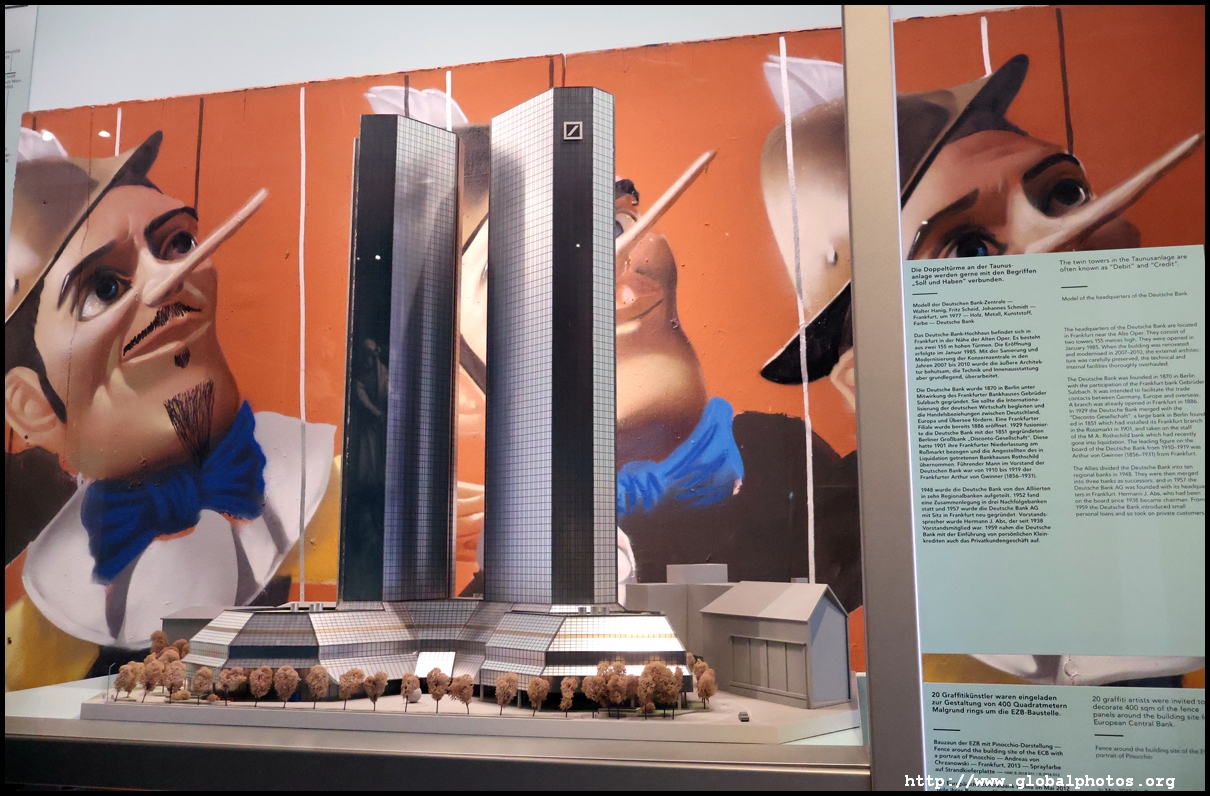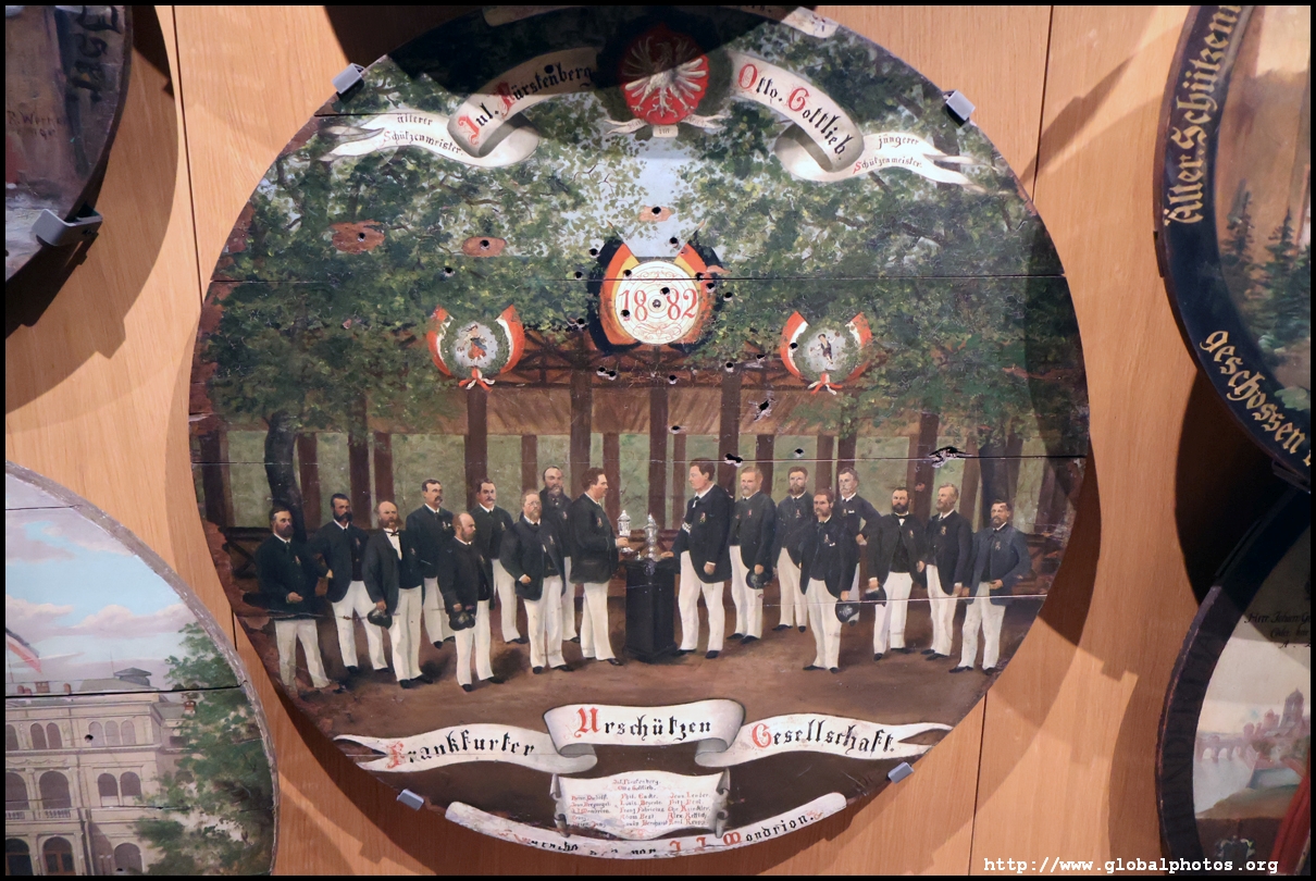 In the 1764 coronation of Joseph II, the ox was roasted for the festive banquet in the town hall. The emperor hosted a public celebration in the Romerberg with a ritual piece of the ox. On the left is the ox head that was won by the wine merchants and was donated to the museum in 1879. To the right is the bridge rooster from the Alte Brucke that dates from repairs in the 18th century, although the first written account of this rooster goes further back to 1401, marking the deepest point in the river and the spot to hold executions by drowning. The English first connected cholera and contaminated water and developed sewage systems to prevent epidemics. In 1864, Frankfurt decided to build a gravity-based system of sewers, with the waste water being directed to a newly-built sewage plant. The first sewage treatment plant in Europe opened in Franfurt in 1887. This drove a boom in the toilet business, with the item on the right imported from England. These panels were used from 1898 to 1927 at a factory to control the charge of the accumulator batteries. These are guild emblems for the "Fountain of German Crafts", which came about after Hitler awarded the city the title of "City of German Crafts" in 1935. This fountain was never fully realized due to World War II, and these pieces ended up here at the museum. These protest placards ere aimed at IG Farben's annual meetings. Holocaust survivors, antifascist organizations, and the like campaigned for proper compensation and breaking up the company, which had used forced labour at concentraton camps and their products helped kill Jews in the gas chambers. On the left is the flag of the 14th quarter. Frankfurt was divided into 14 quarters in 1614. A new flag was devised to celebrate Leopold II's coronation in 1790. This is a model of Deutsche Bank's headquarters, which consist of 2 towers reaching 155m that opened in 1985. While the bank was originally founded in Berlin in 1870, it was divided into regional banks after World War II, with the final successor based in Frankfurt in 1957. Hyperinflation in 1923 prompted cities and municipalities to print emergency money, which made things worse. The Alte Brucke directed traffic into the city and was repaired many times since the 13th century.
