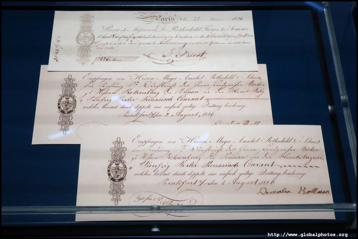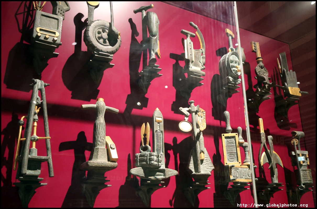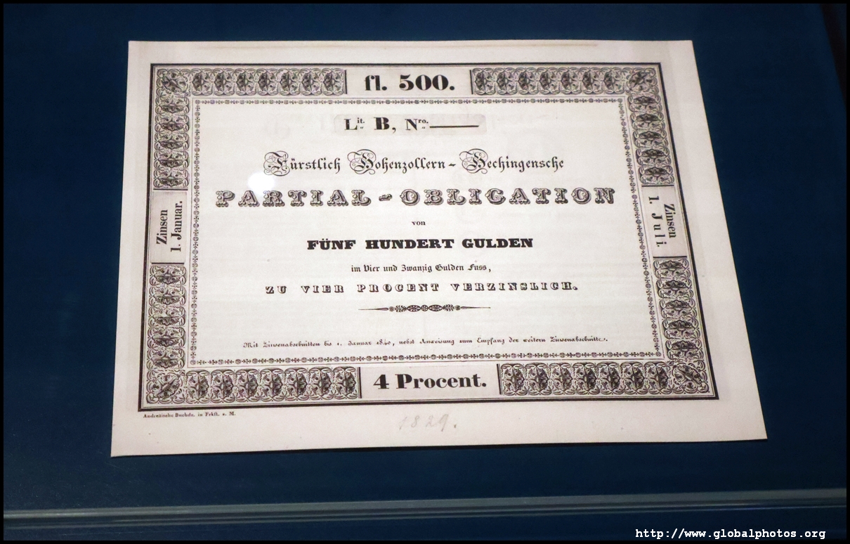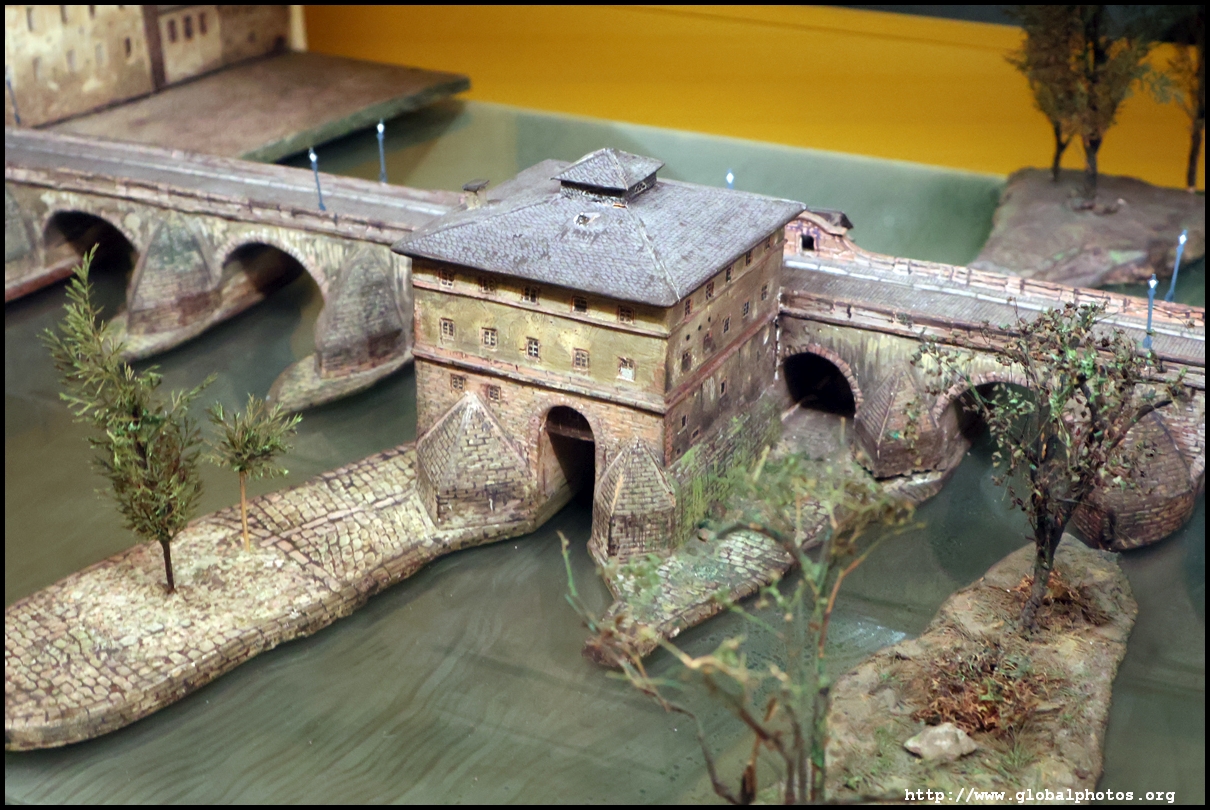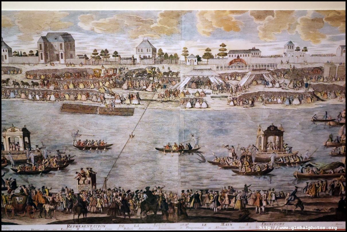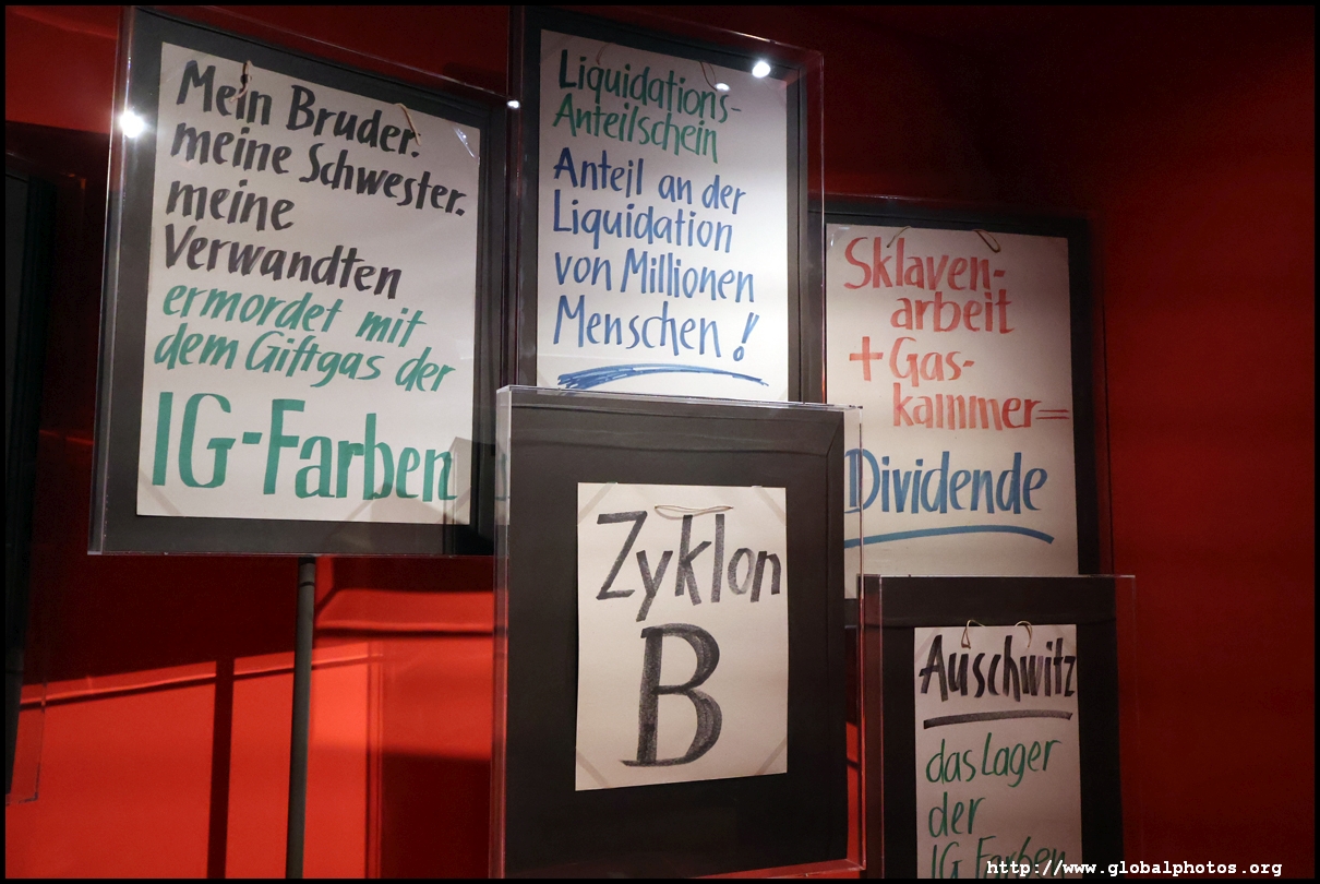 In the 1764 coronation of Joseph II, the ox was roasted for the festive banquet in the town hall. The emperor hosted a public celebration in the Romerberg with a ritual piece of the ox. On the left is the ox head that was won by the wine merchants and was donated to the museum in 1879. To the right is the bridge rooster from the Alte Brucke that dates from repairs in the 18th century, although the first written account of this rooster goes further back to 1401, marking the deepest point in the river and the spot to hold executions by drowning. The English first connected cholera and contaminated water and developed sewage systems to prevent epidemics. In 1864, Frankfurt decided to build a gravity-based system of sewers, with the waste water being directed to a newly-built sewage plant. The first sewage treatment plant in Europe opened in Franfurt in 1887. This drove a boom in the toilet business, with the item on the right imported from England. These panels were used from 1898 to 1927 at a factory to control the charge of the accumulator batteries. These are guild emblems for the "Fountain of German Crafts", which came about after Hitler awarded the city the title of "City of German Crafts" in 1935. This fountain was never fully realized due to World War II, and these pieces ended up here at the museum. These protest placards ere aimed at IG Farben's annual meetings. Holocaust survivors, antifascist organizations, and the like campaigned for proper compensation and breaking up the company, which had used forced labour at concentraton camps and their products helped kill Jews in the gas chambers. On the left is the flag of the 14th quarter. Frankfurt was divided into 14 quarters in 1614. A new flag was devised to celebrate Leopold II's coronation in 1790. This is a model of Deutsche Bank's headquarters, which consist of 2 towers reaching 155m that opened in 1985. While the bank was originally founded in Berlin in 1870, it was divided into regional banks after World War II, with the final successor based in Frankfurt in 1957. Hyperinflation in 1923 prompted cities and municipalities to print emergency money, which made things worse. The Alte Brucke directed traffic into the city and was repaired many times since the 13th century.
