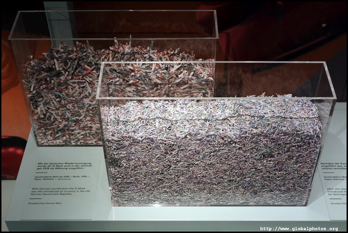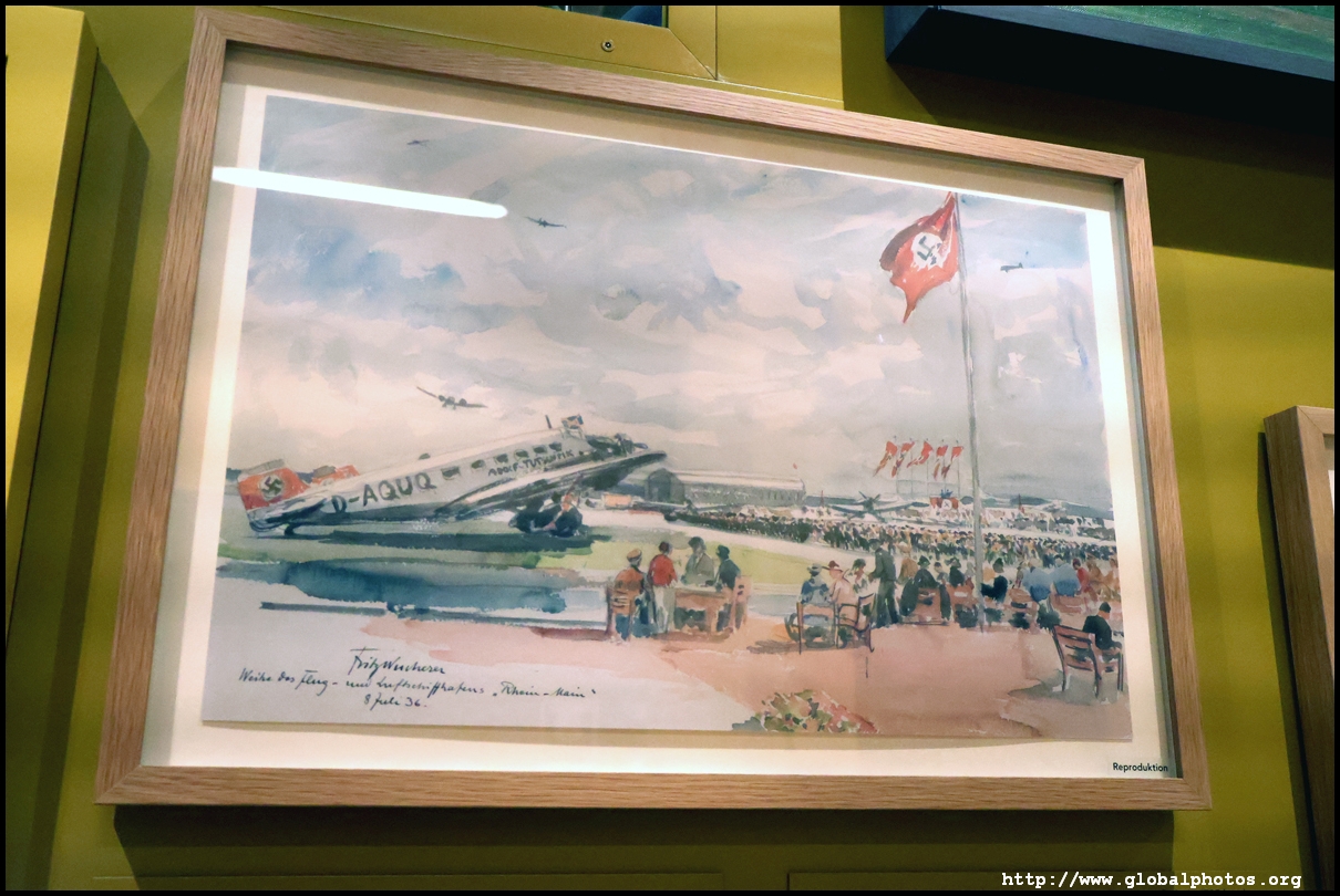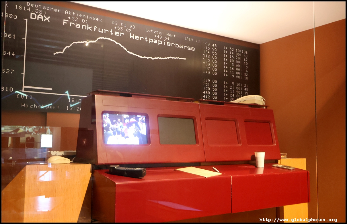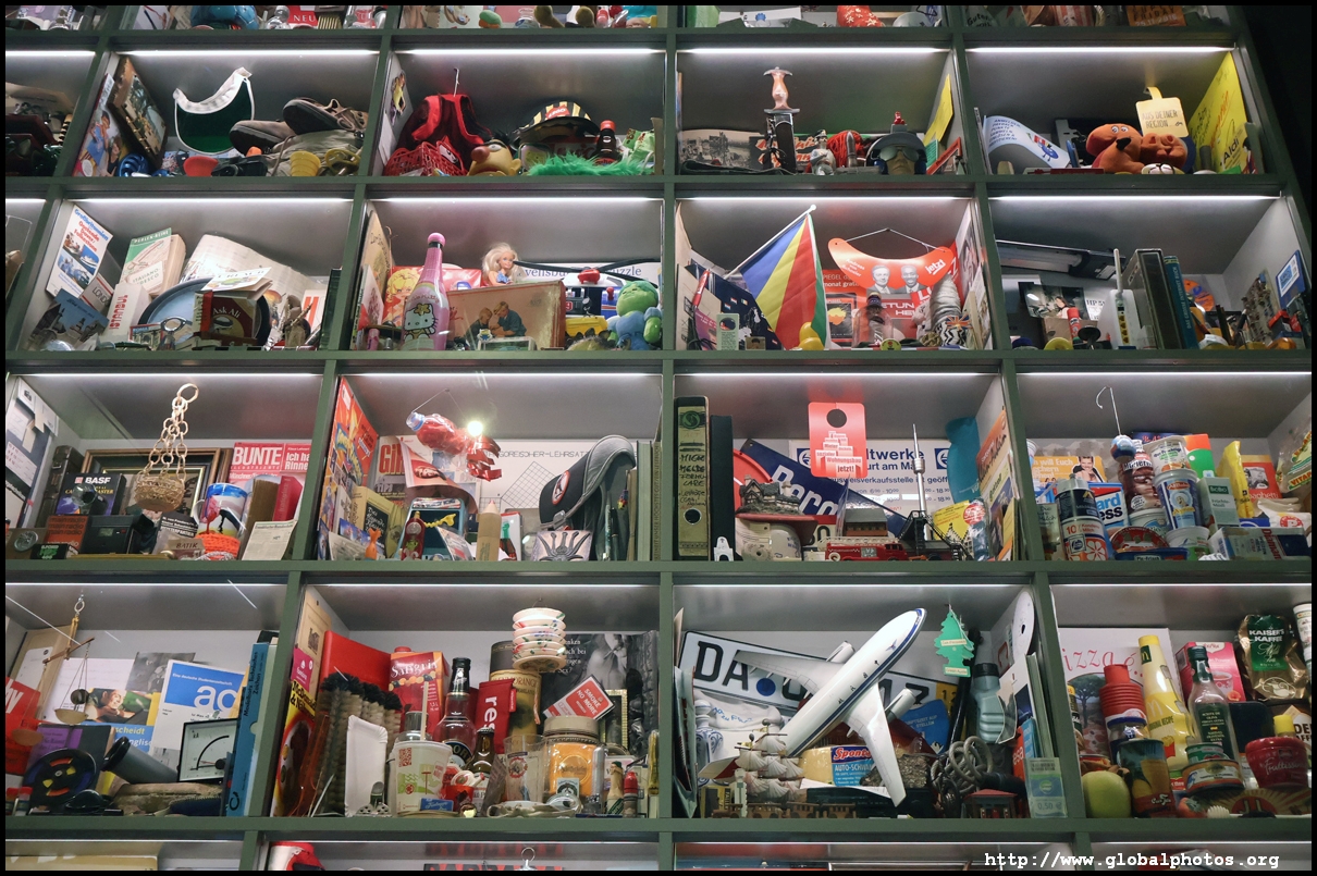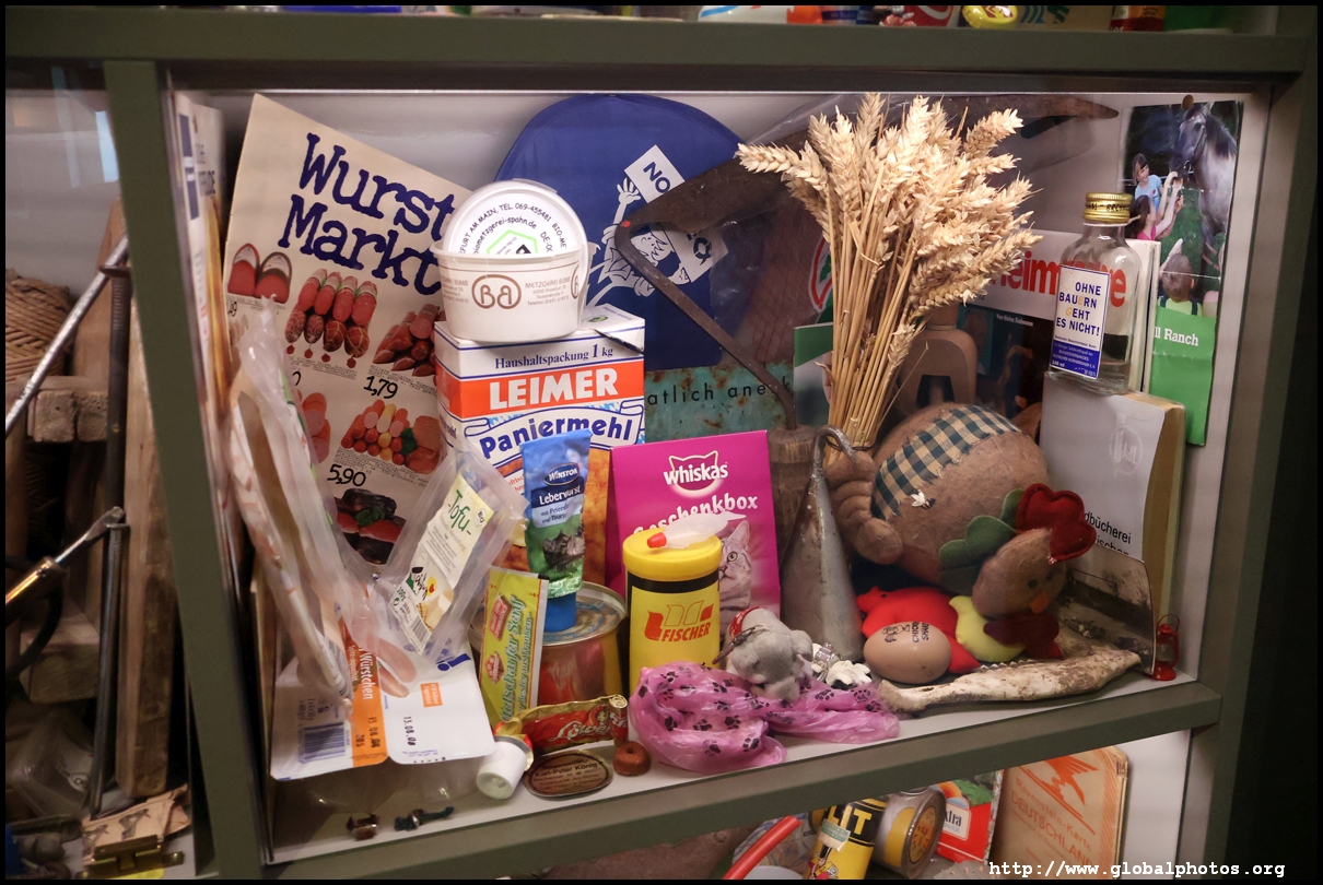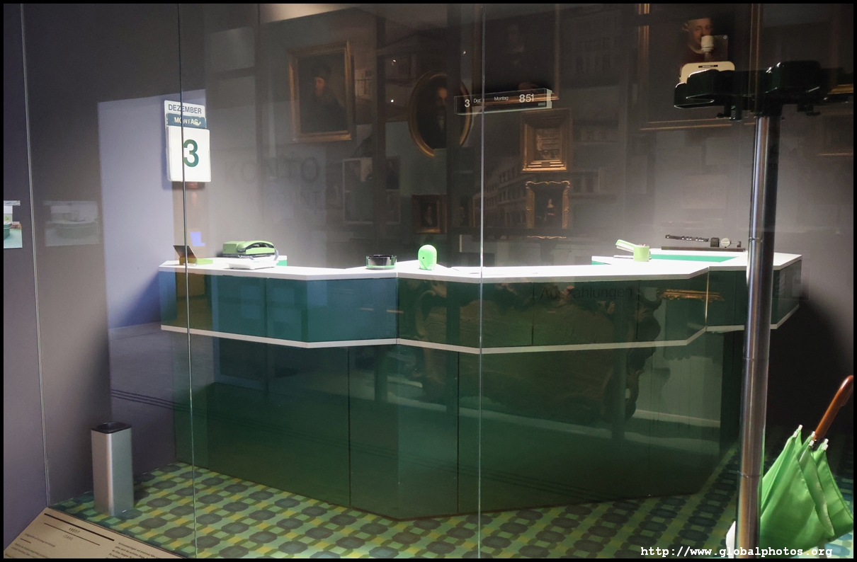 In the 1764 coronation of Joseph II, the ox was roasted for the festive banquet in the town hall. The emperor hosted a public celebration in the Romerberg with a ritual piece of the ox. On the left is the ox head that was won by the wine merchants and was donated to the museum in 1879. To the right is the bridge rooster from the Alte Brucke that dates from repairs in the 18th century, although the first written account of this rooster goes further back to 1401, marking the deepest point in the river and the spot to hold executions by drowning. The English first connected cholera and contaminated water and developed sewage systems to prevent epidemics. In 1864, Frankfurt decided to build a gravity-based system of sewers, with the waste water being directed to a newly-built sewage plant. The first sewage treatment plant in Europe opened in Franfurt in 1887. This drove a boom in the toilet business, with the item on the right imported from England. These panels were used from 1898 to 1927 at a factory to control the charge of the accumulator batteries. These are guild emblems for the "Fountain of German Crafts", which came about after Hitler awarded the city the title of "City of German Crafts" in 1935. This fountain was never fully realized due to World War II, and these pieces ended up here at the museum. These protest placards ere aimed at IG Farben's annual meetings. Holocaust survivors, antifascist organizations, and the like campaigned for proper compensation and breaking up the company, which had used forced labour at concentraton camps and their products helped kill Jews in the gas chambers. On the left is the flag of the 14th quarter. Frankfurt was divided into 14 quarters in 1614. A new flag was devised to celebrate Leopold II's coronation in 1790. This is a model of Deutsche Bank's headquarters, which consist of 2 towers reaching 155m that opened in 1985. While the bank was originally founded in Berlin in 1870, it was divided into regional banks after World War II, with the final successor based in Frankfurt in 1957. Hyperinflation in 1923 prompted cities and municipalities to print emergency money, which made things worse. The Alte Brucke directed traffic into the city and was repaired many times since the 13th century.