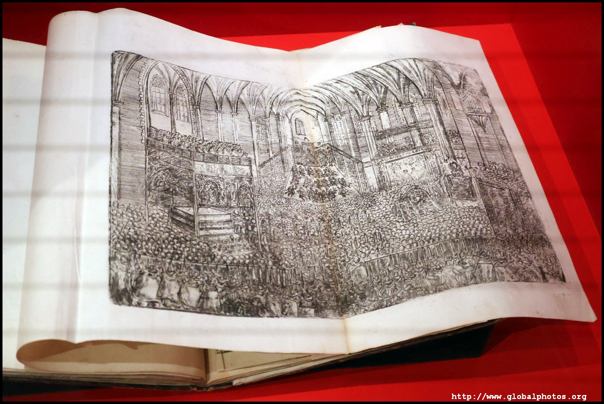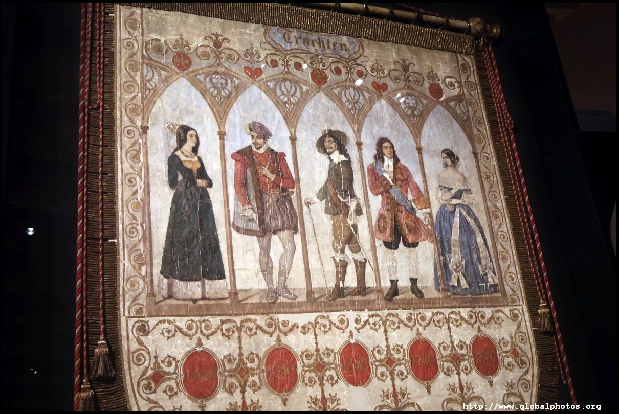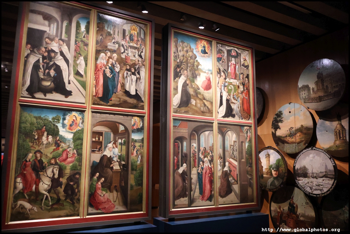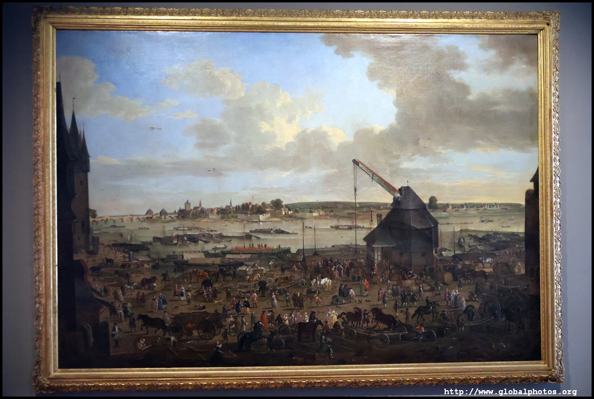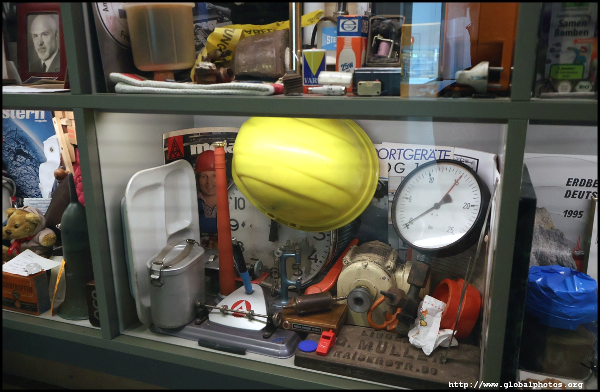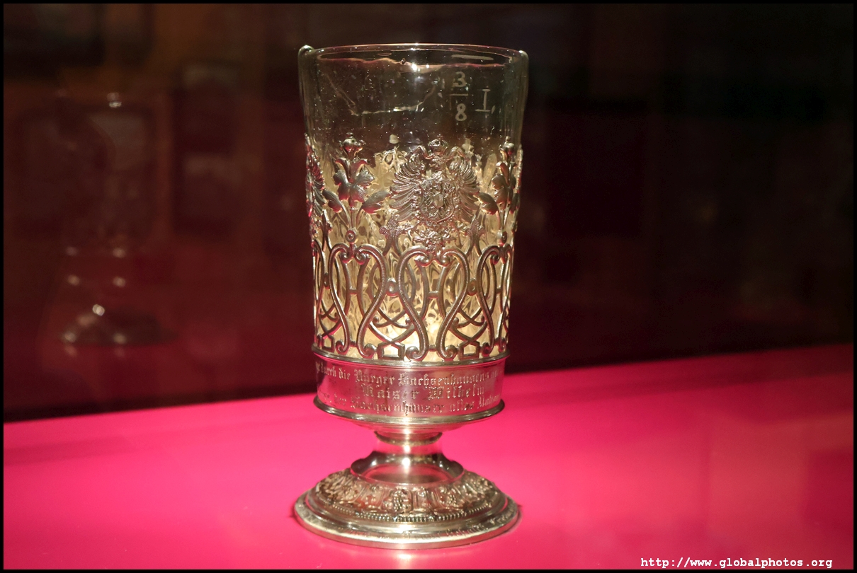 In the 1764 coronation of Joseph II, the ox was roasted for the festive banquet in the town hall. The emperor hosted a public celebration in the Romerberg with a ritual piece of the ox. On the left is the ox head that was won by the wine merchants and was donated to the museum in 1879. To the right is the bridge rooster from the Alte Brucke that dates from repairs in the 18th century, although the first written account of this rooster goes further back to 1401, marking the deepest point in the river and the spot to hold executions by drowning. The English first connected cholera and contaminated water and developed sewage systems to prevent epidemics. In 1864, Frankfurt decided to build a gravity-based system of sewers, with the waste water being directed to a newly-built sewage plant. The first sewage treatment plant in Europe opened in Franfurt in 1887. This drove a boom in the toilet business, with the item on the right imported from England. These panels were used from 1898 to 1927 at a factory to control the charge of the accumulator batteries. These are guild emblems for the "Fountain of German Crafts", which came about after Hitler awarded the city the title of "City of German Crafts" in 1935. This fountain was never fully realized due to World War II, and these pieces ended up here at the museum. These protest placards ere aimed at IG Farben's annual meetings. Holocaust survivors, antifascist organizations, and the like campaigned for proper compensation and breaking up the company, which had used forced labour at concentraton camps and their products helped kill Jews in the gas chambers. On the left is the flag of the 14th quarter. Frankfurt was divided into 14 quarters in 1614. A new flag was devised to celebrate Leopold II's coronation in 1790. This is a model of Deutsche Bank's headquarters, which consist of 2 towers reaching 155m that opened in 1985. While the bank was originally founded in Berlin in 1870, it was divided into regional banks after World War II, with the final successor based in Frankfurt in 1957. Hyperinflation in 1923 prompted cities and municipalities to print emergency money, which made things worse. The Alte Brucke directed traffic into the city and was repaired many times since the 13th century.