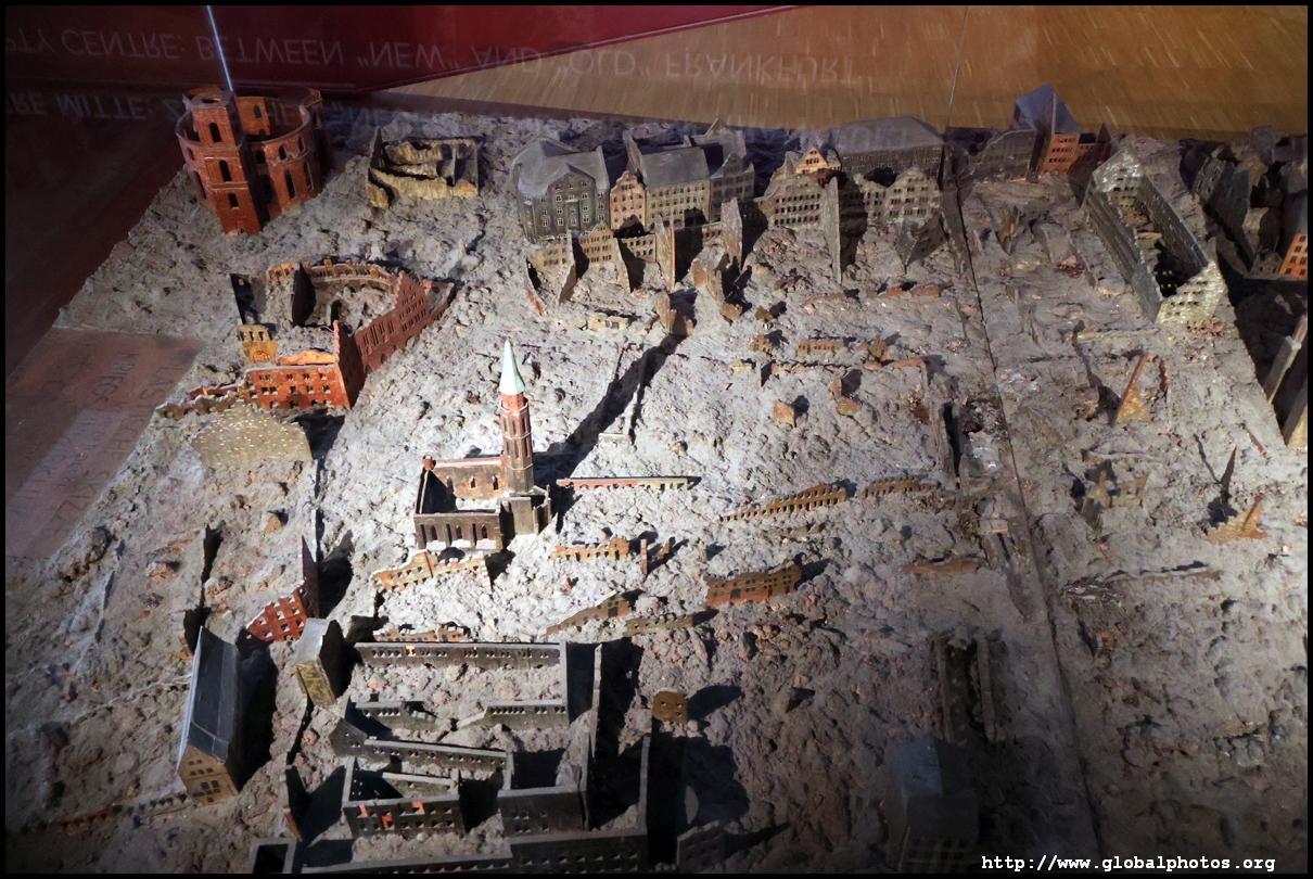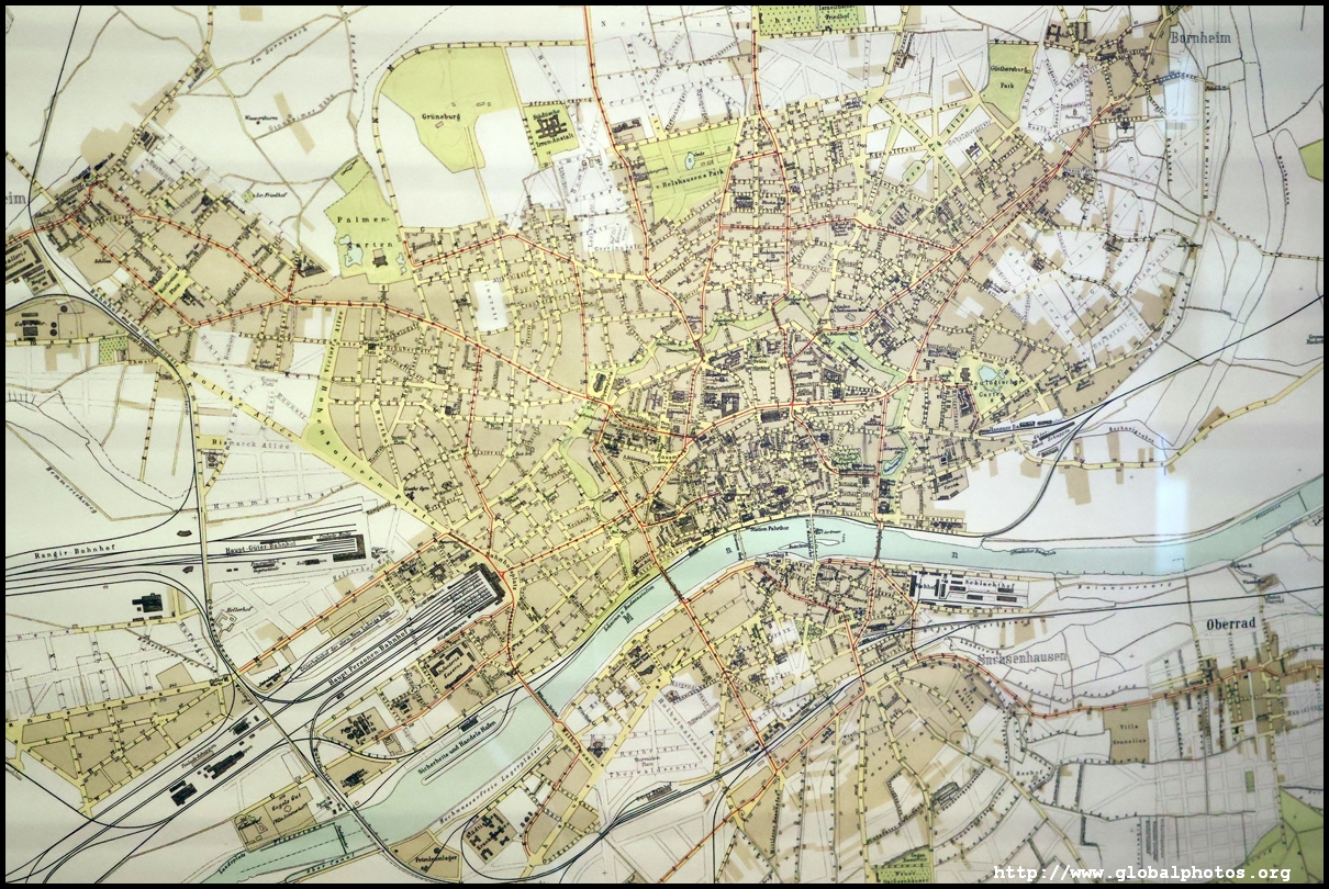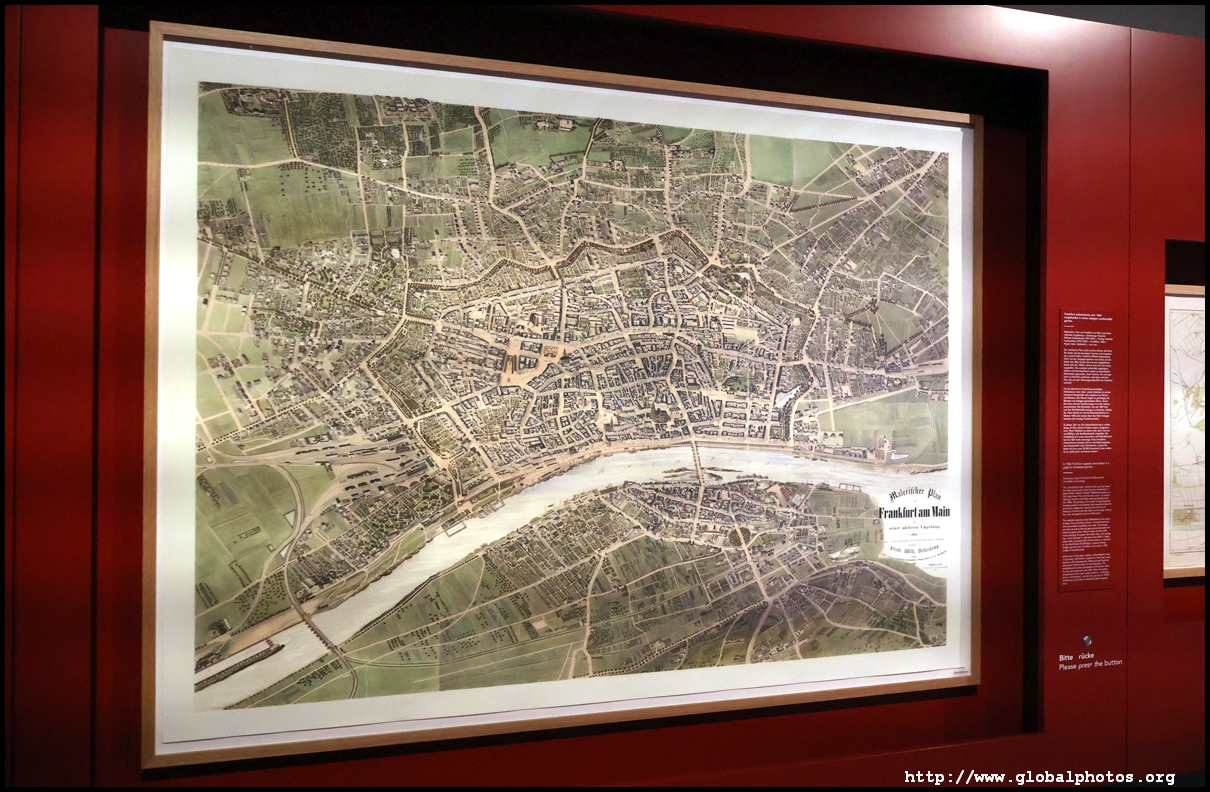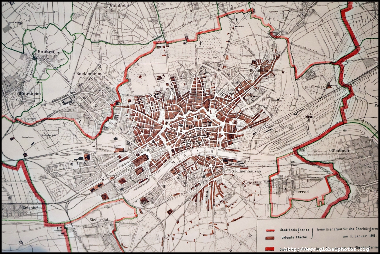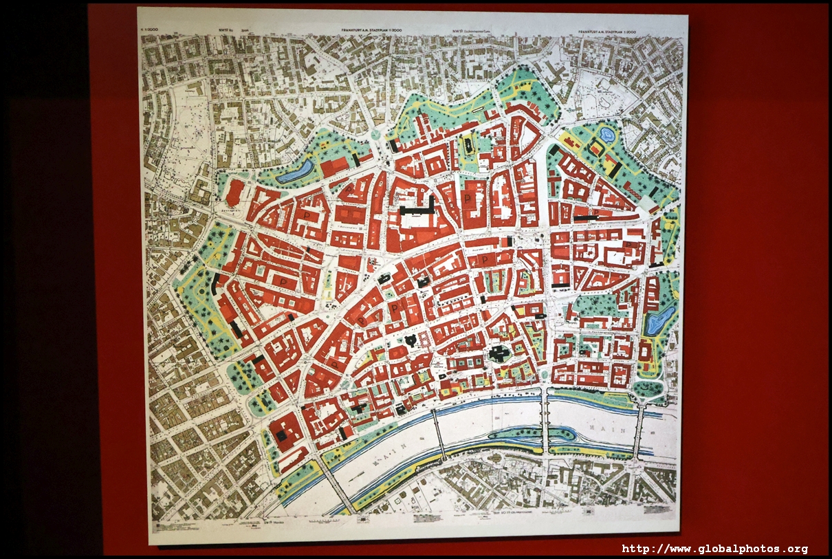 Behind it are maps of the city from various times - from 1864 to the 1950s. Factories were not allowed to be established within the town until 1864, keeping the appearance fairly green. The central railway station was built in 1888, and the town soon expanded into the periphery with a ring of avenues built and more residential districts to the north. Much of Frankfurt's centre was destroyed in World War II, and skyscrapers starting rising afterwards, although no building could be higher than the cathedral, or 95m.