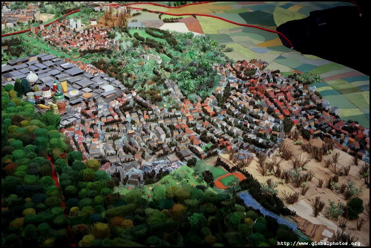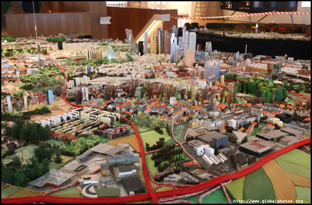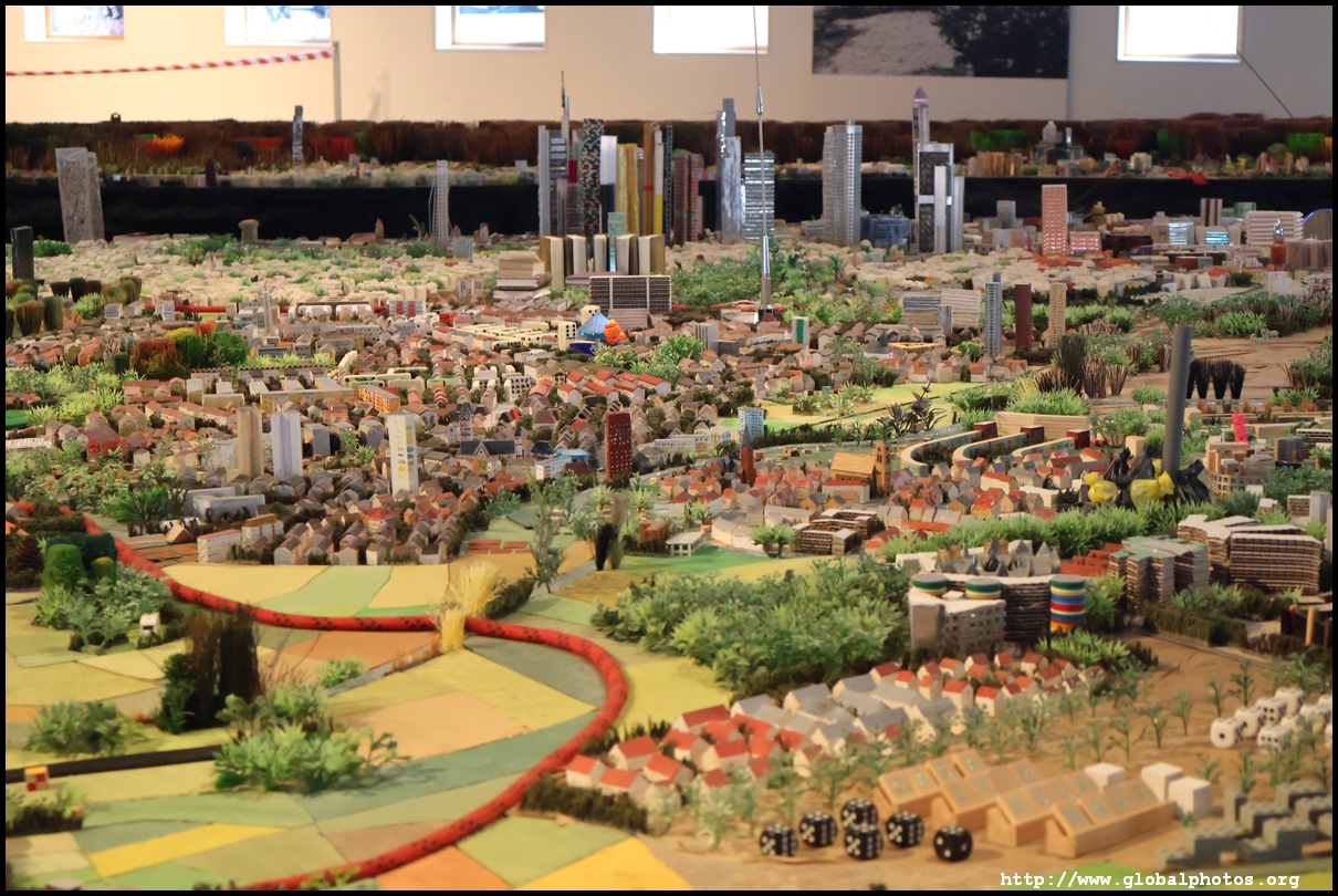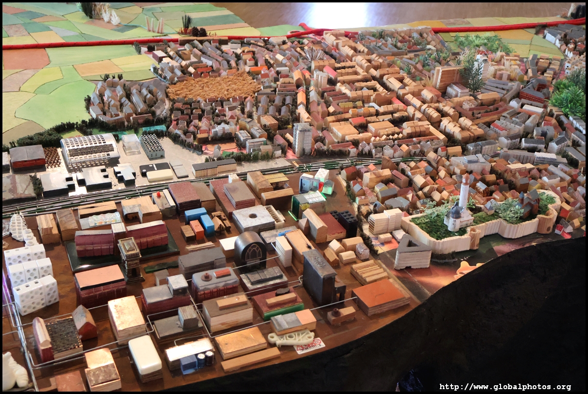 Stretching over 70 square m on the top floor, the city model shows Frankfurt as described by its residents in 2015. These were then given to Dutch artist Herman Helle and his team to create this model. Notice the variety of materials used, such as old cell phones for the airport and shredded euro banknotes for the European Central Bank.