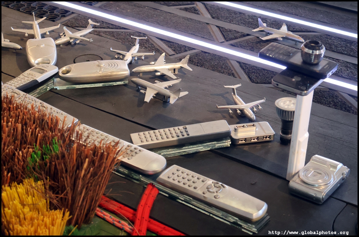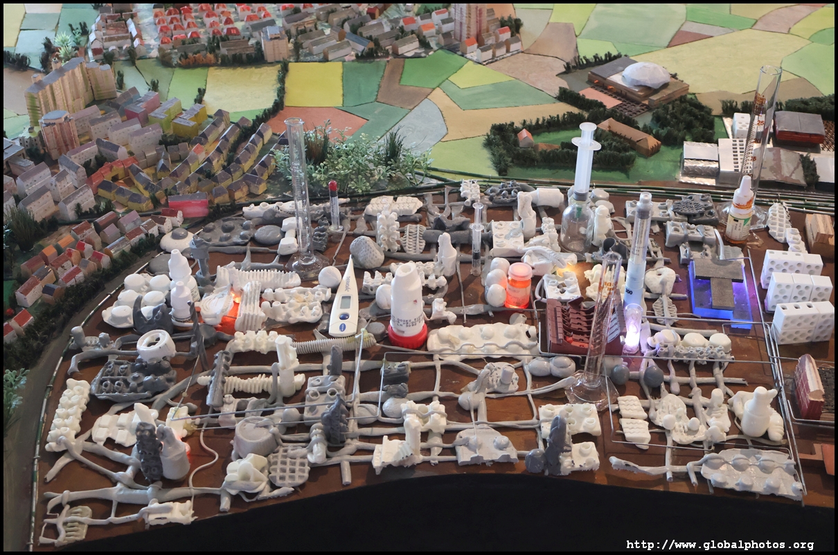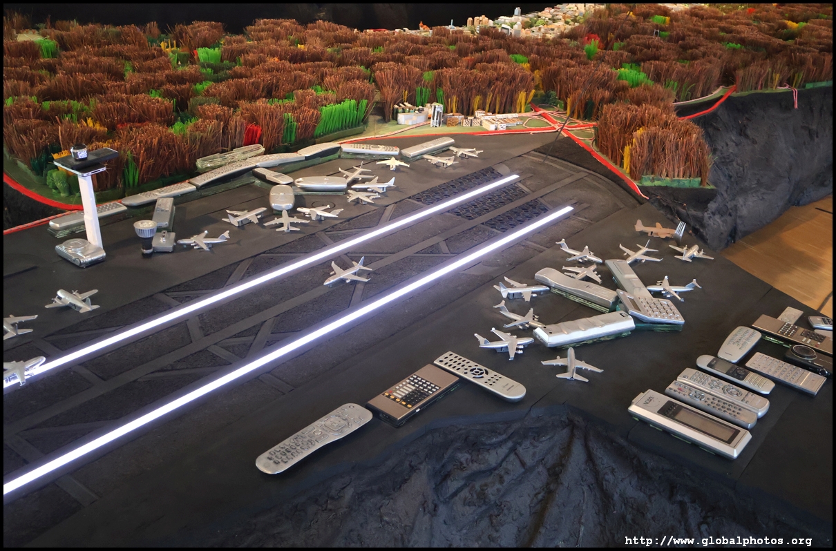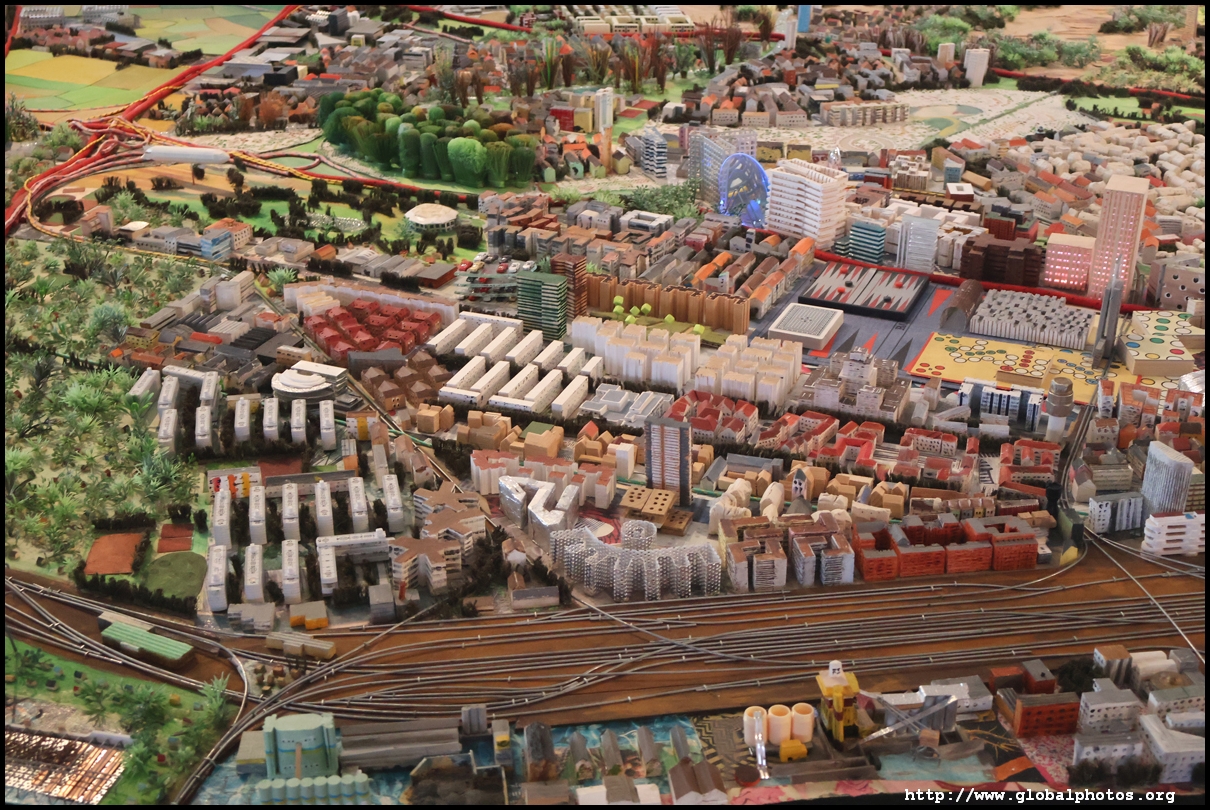Stretching over 70 square m on the top floor, the city model shows Frankfurt as described by its residents in 2015. These were then given to Dutch artist Herman Helle and his team to create this model. Notice the variety of materials used, such as old cell phones for the airport and shredded euro banknotes for the European Central Bank.