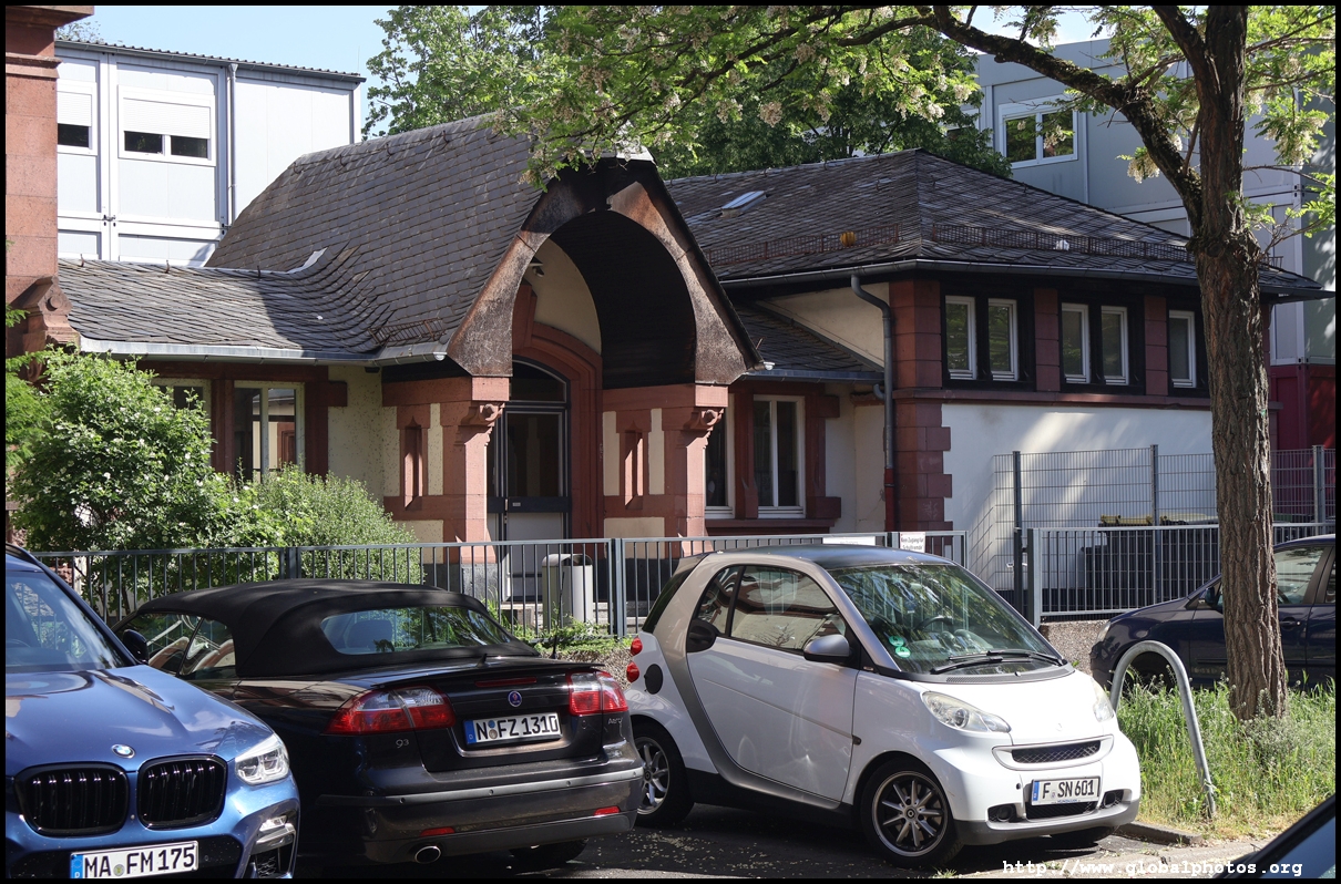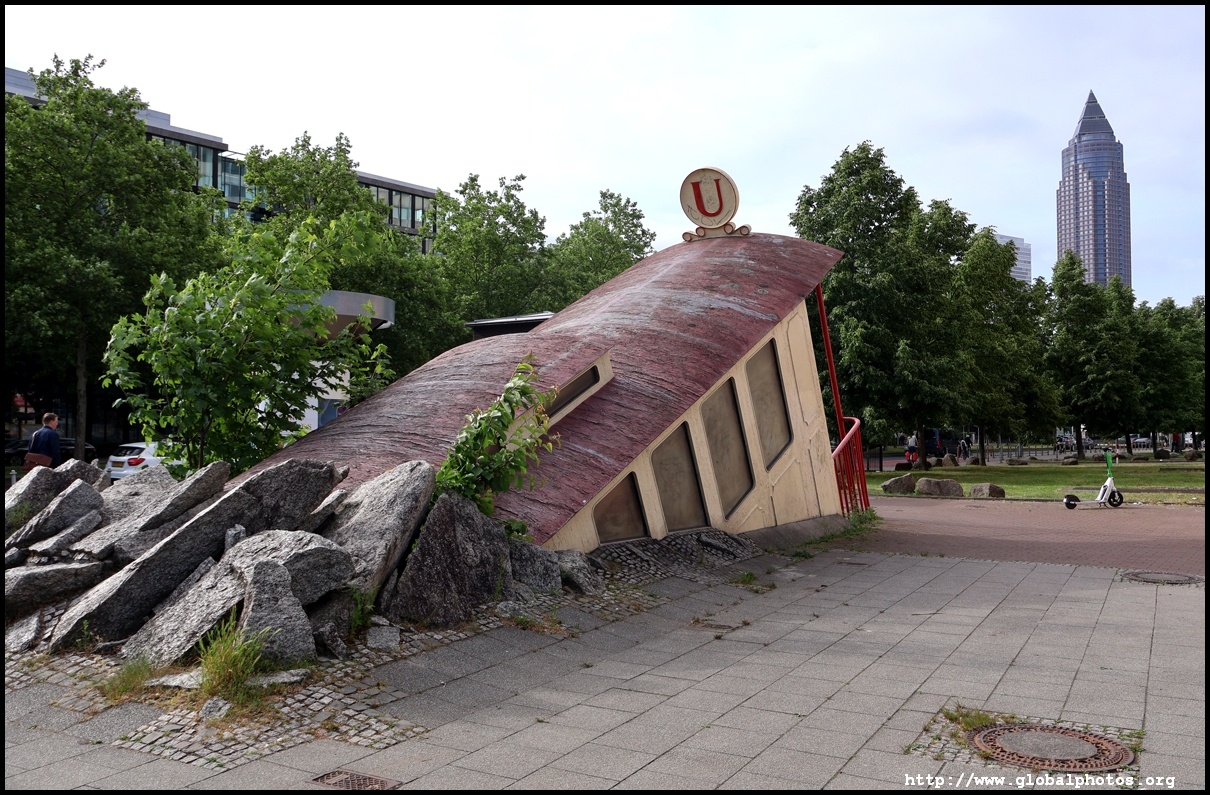 Bockenheimer Warte U-bahn station has a spectacular entrance featuring a partially-submerged train designed by Zbigniew Peter Pininski. It was designed to respond to naysayers to the city's transit expansion.