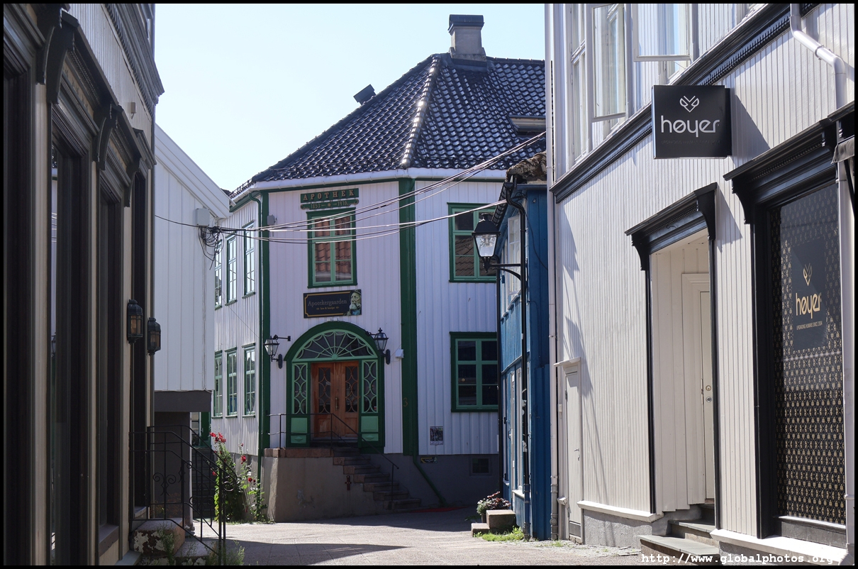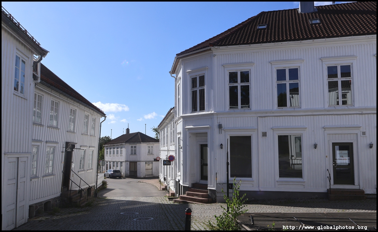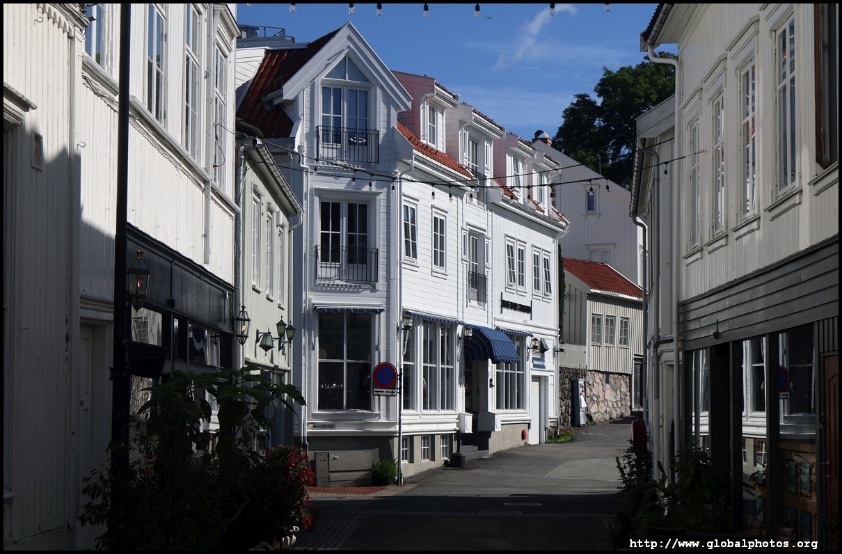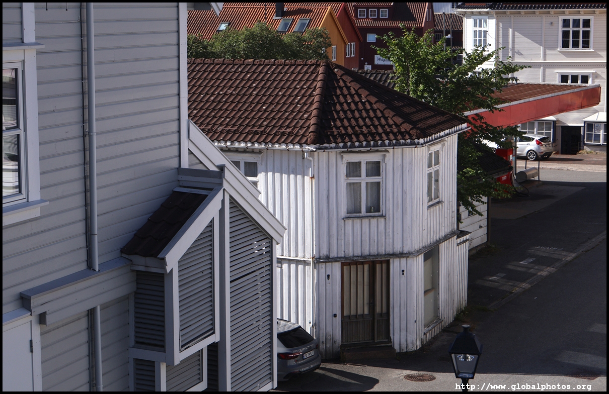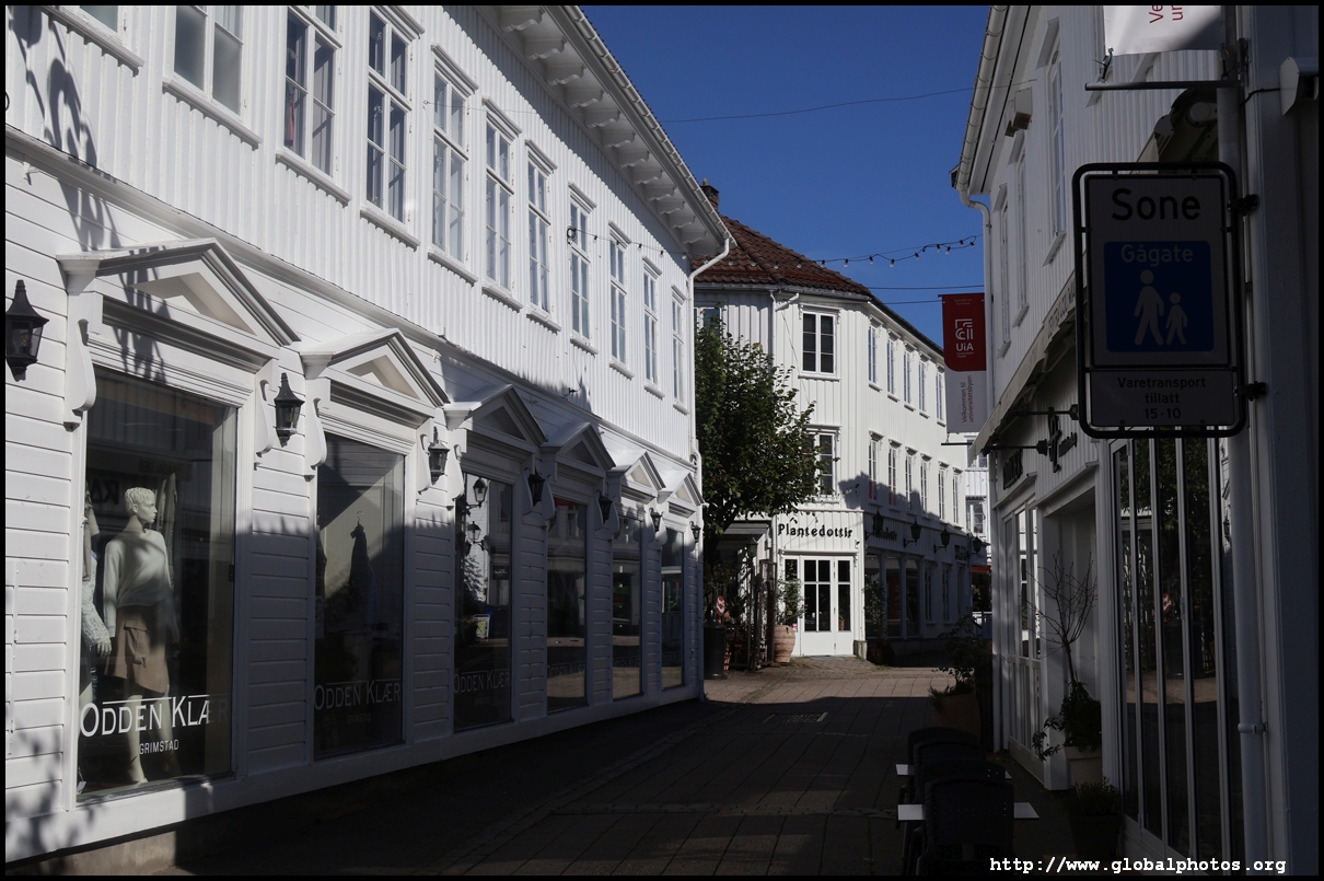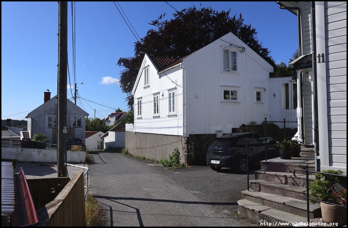 From here, I'm in the city centre with lots of narrow streets full of white wooden houses. Grimstad historically had 3 arterial roads and a lot of small alleys and stairs but more urban planning came after it became a trading town in 1816.