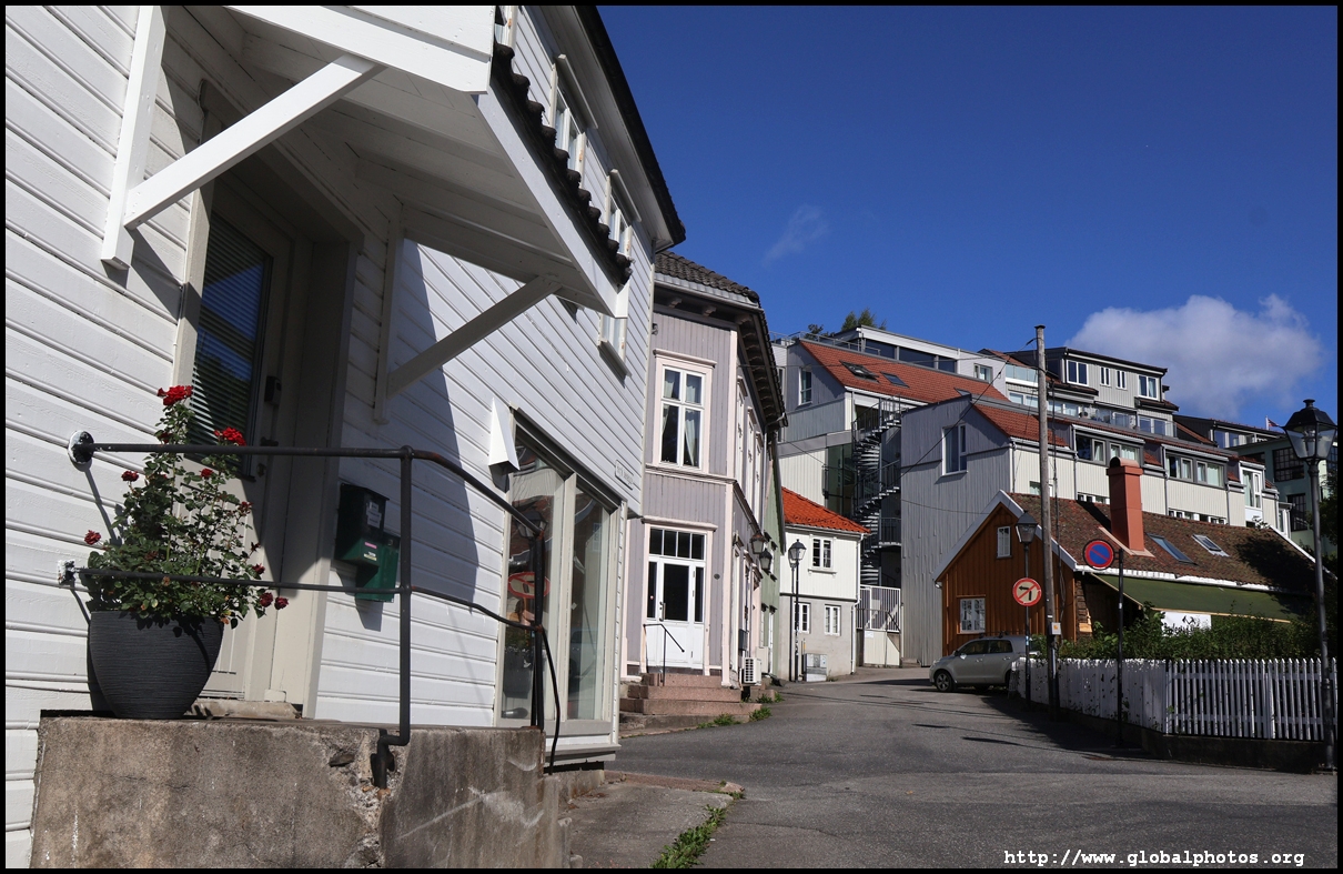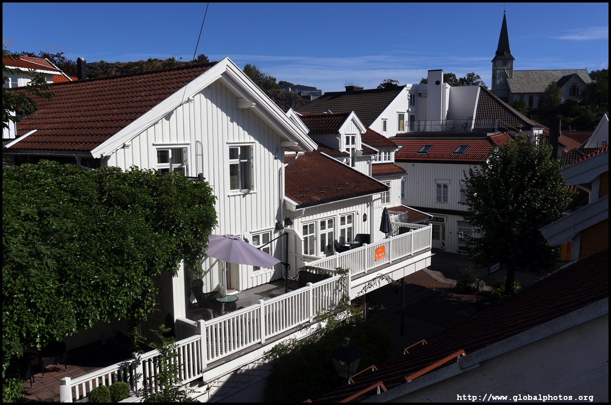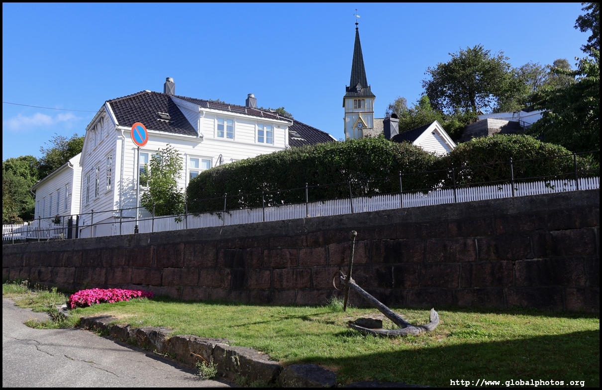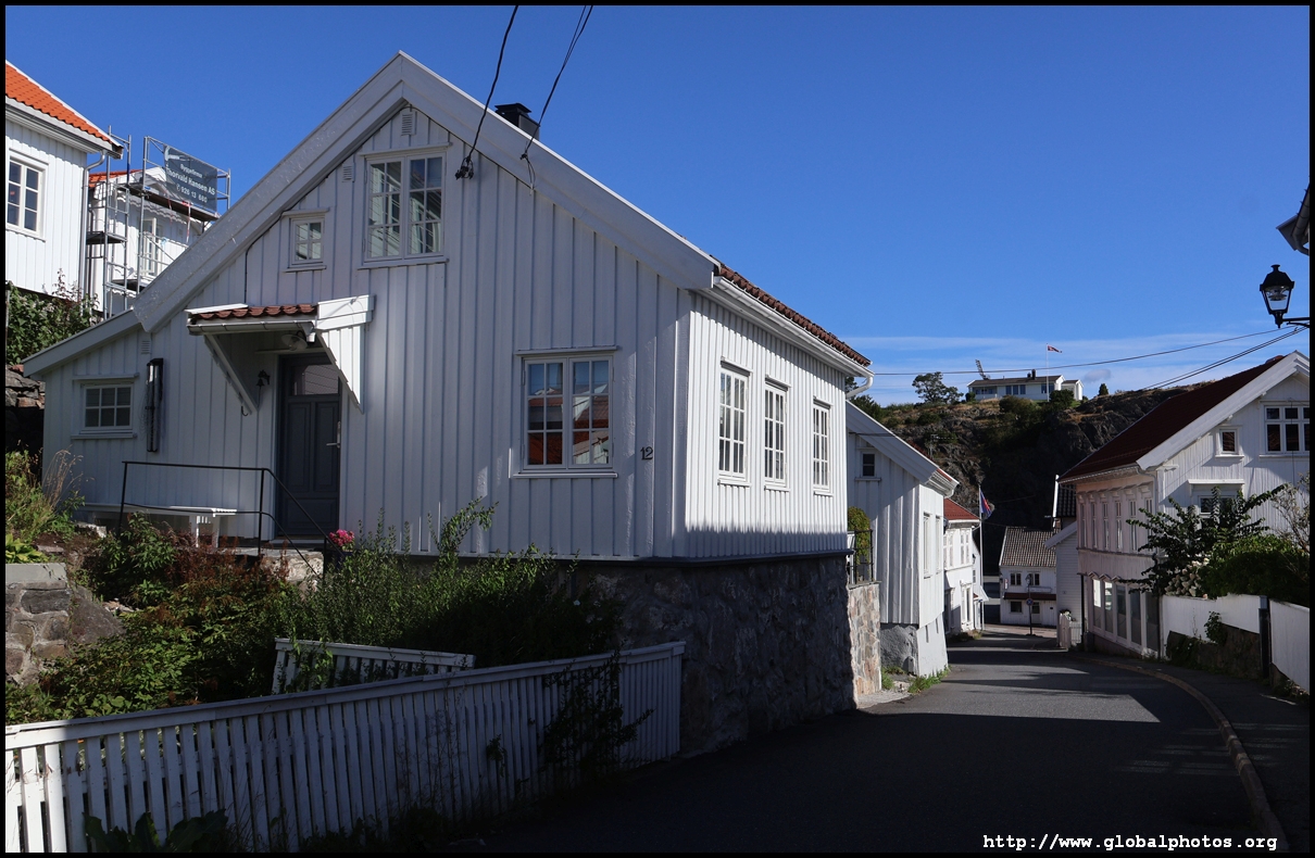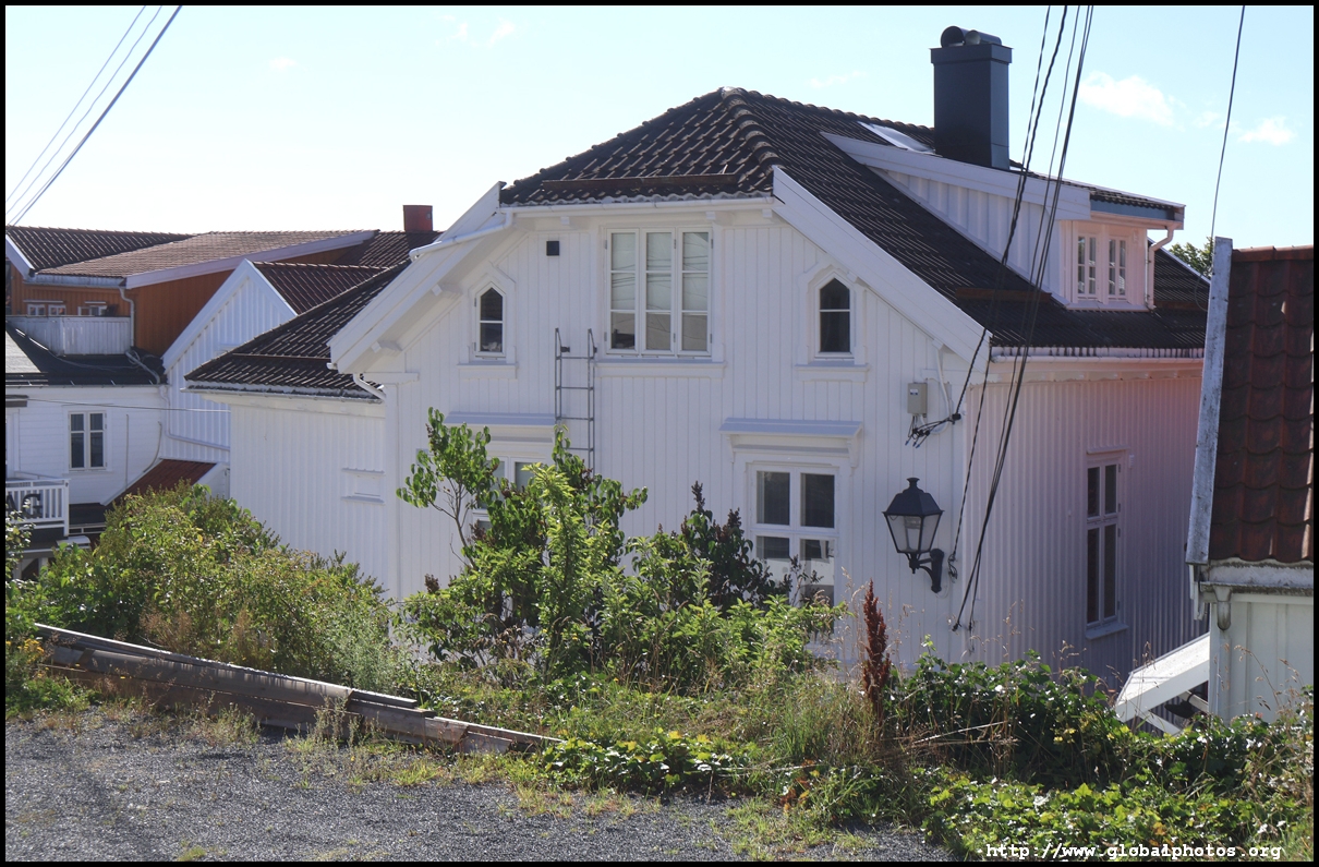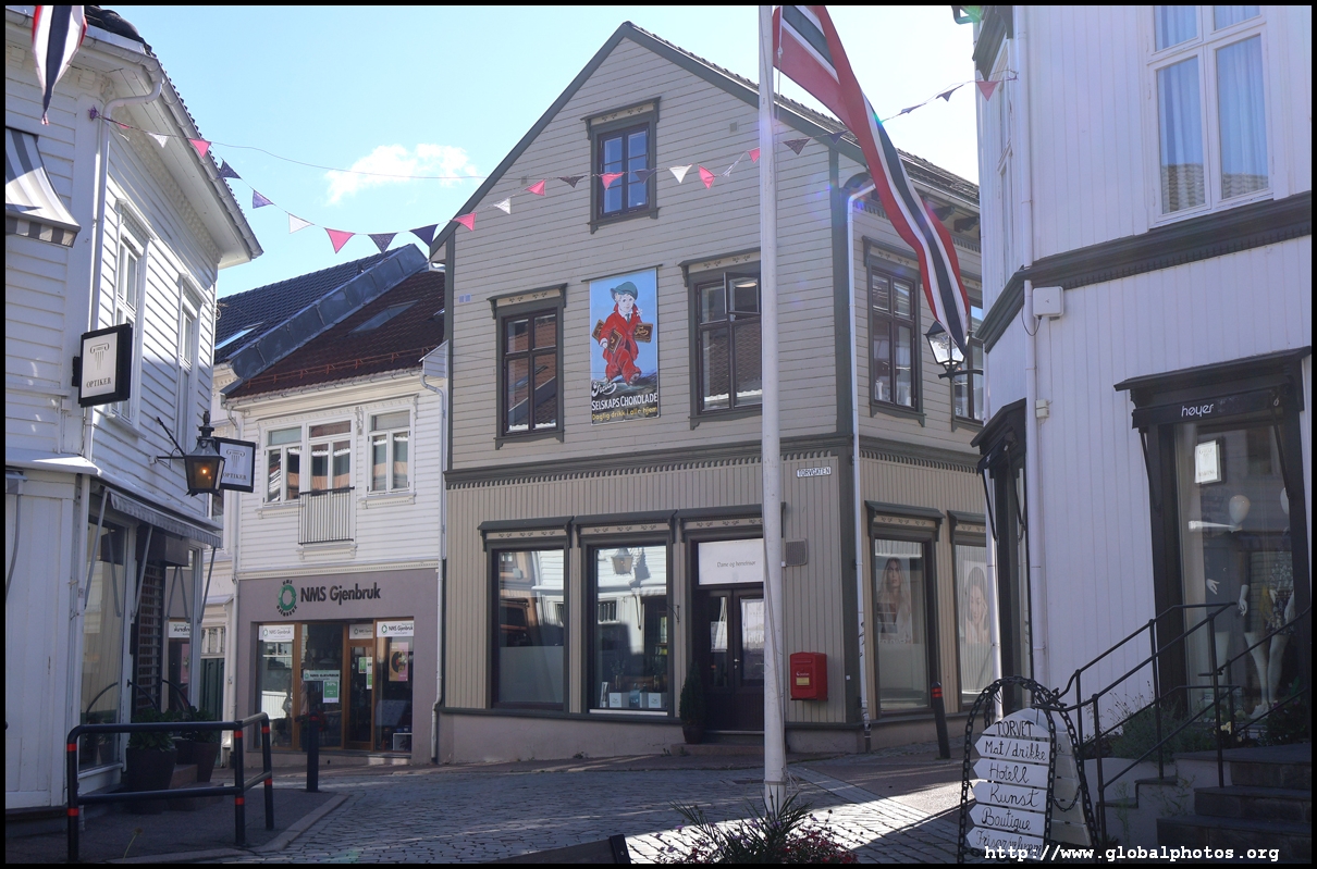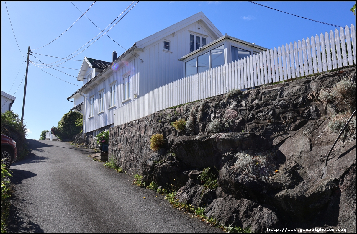 From here, I'm in the city centre with lots of narrow streets full of white wooden houses. Grimstad historically had 3 arterial roads and a lot of small alleys and stairs but more urban planning came after it became a trading town in 1816.