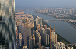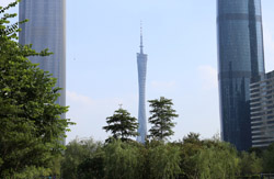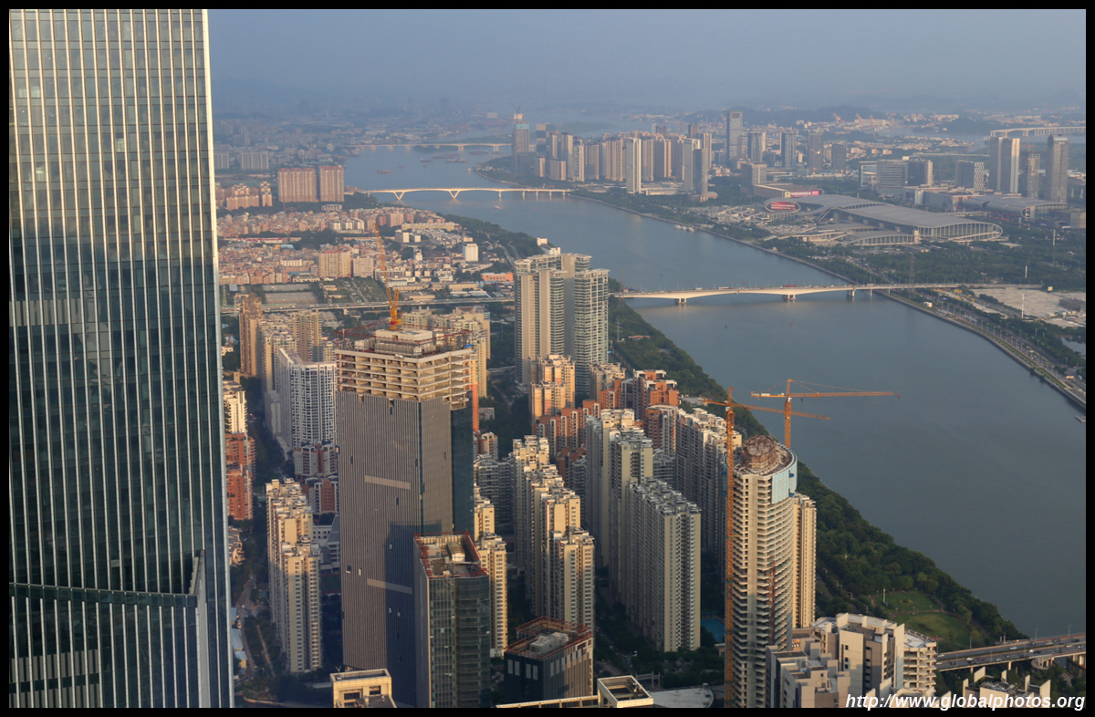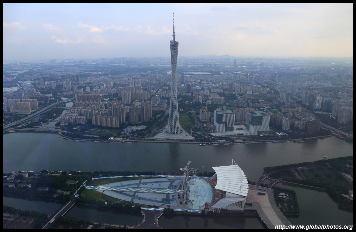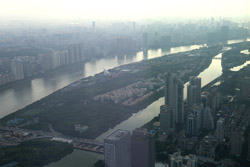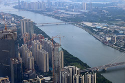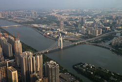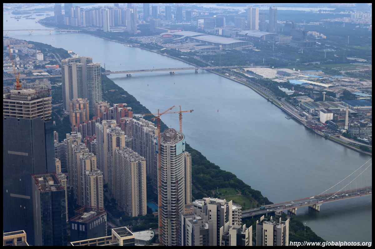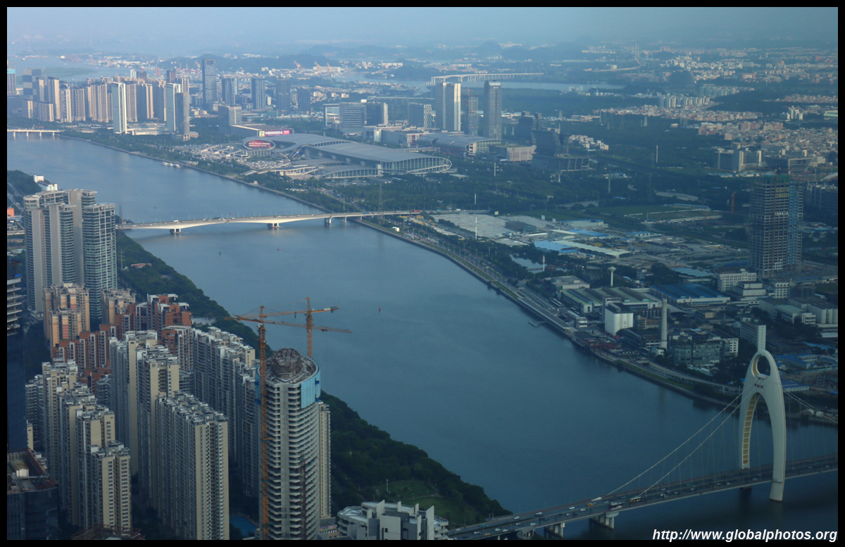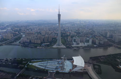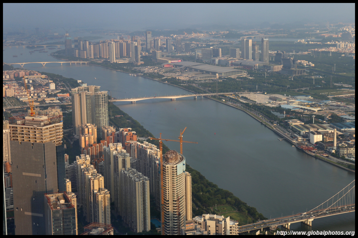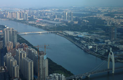 The new central axis extends across the Pearl River to end at the tower.