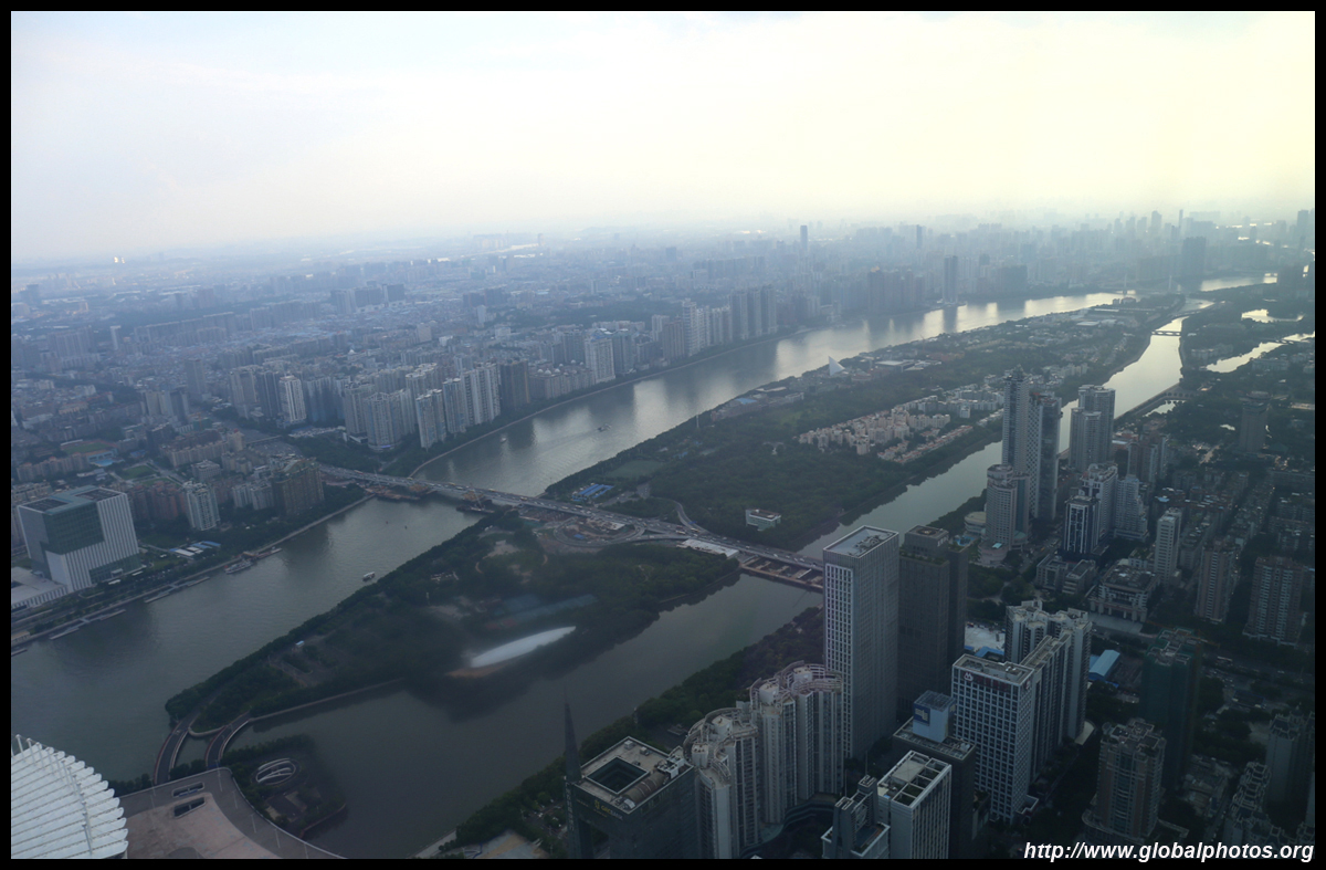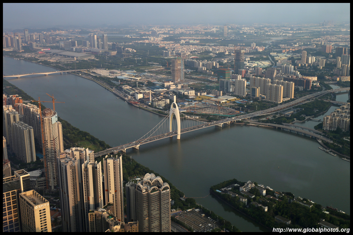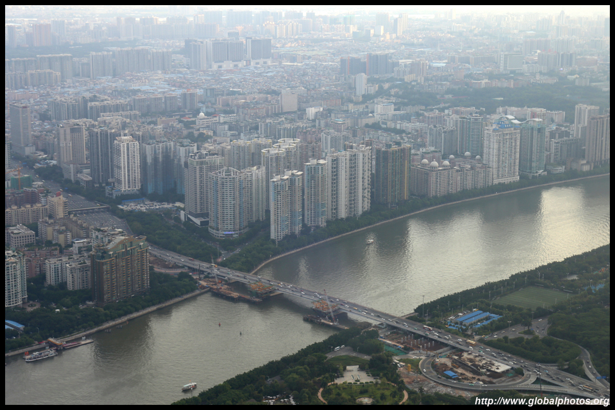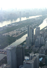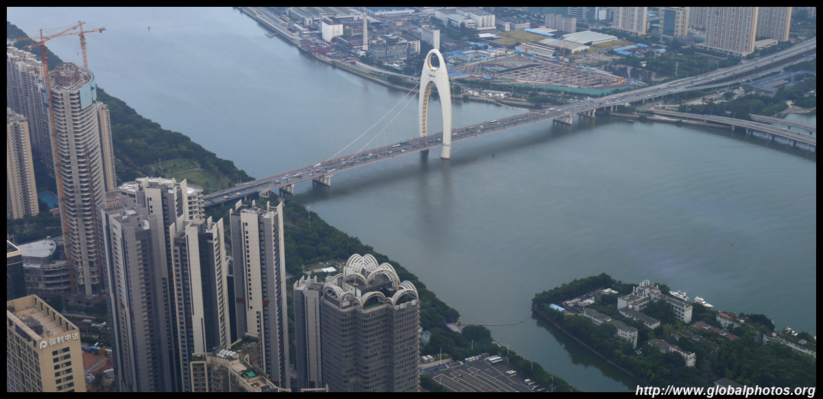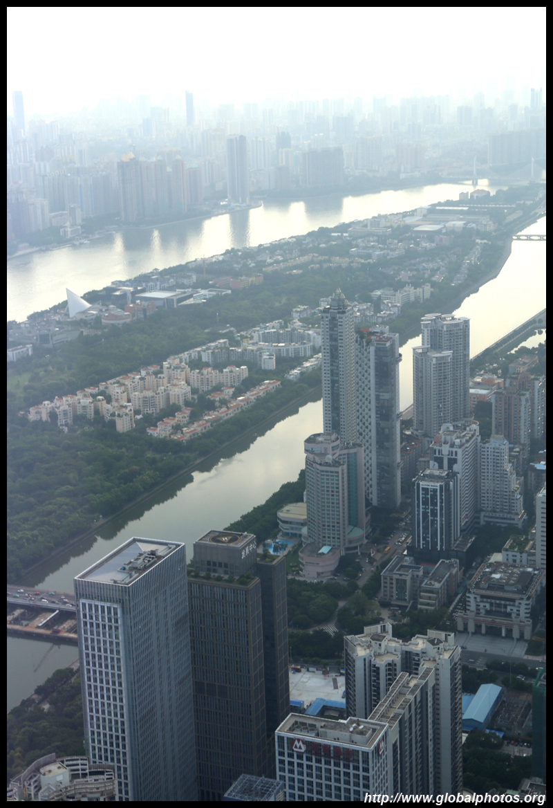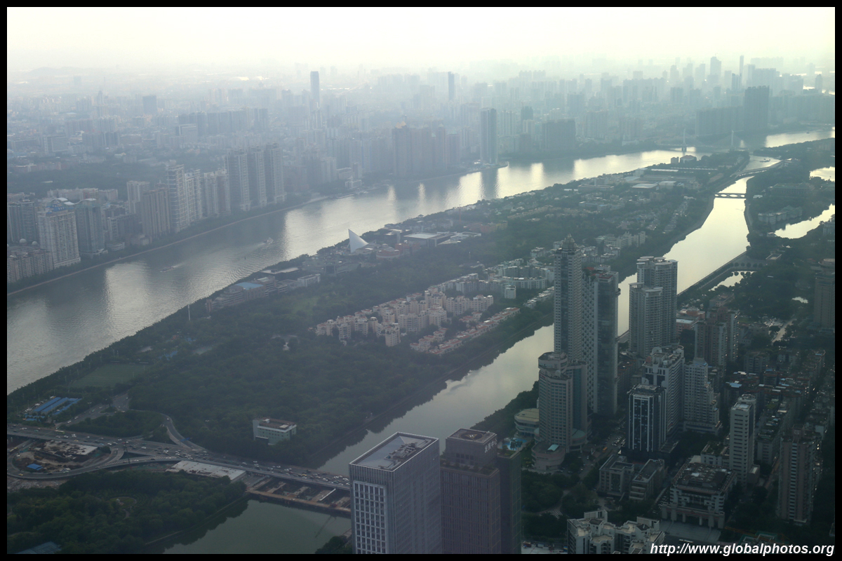 The new central axis extends across the Pearl River to end at the tower.