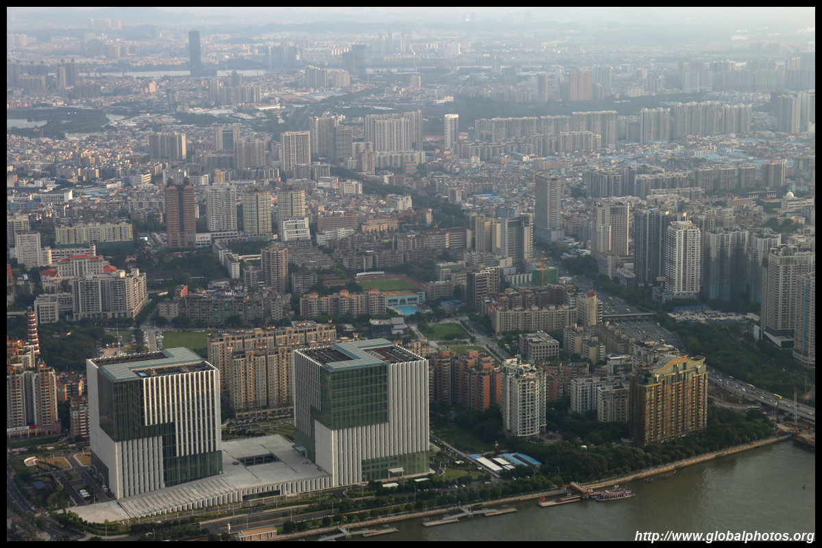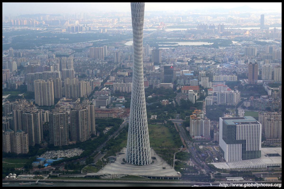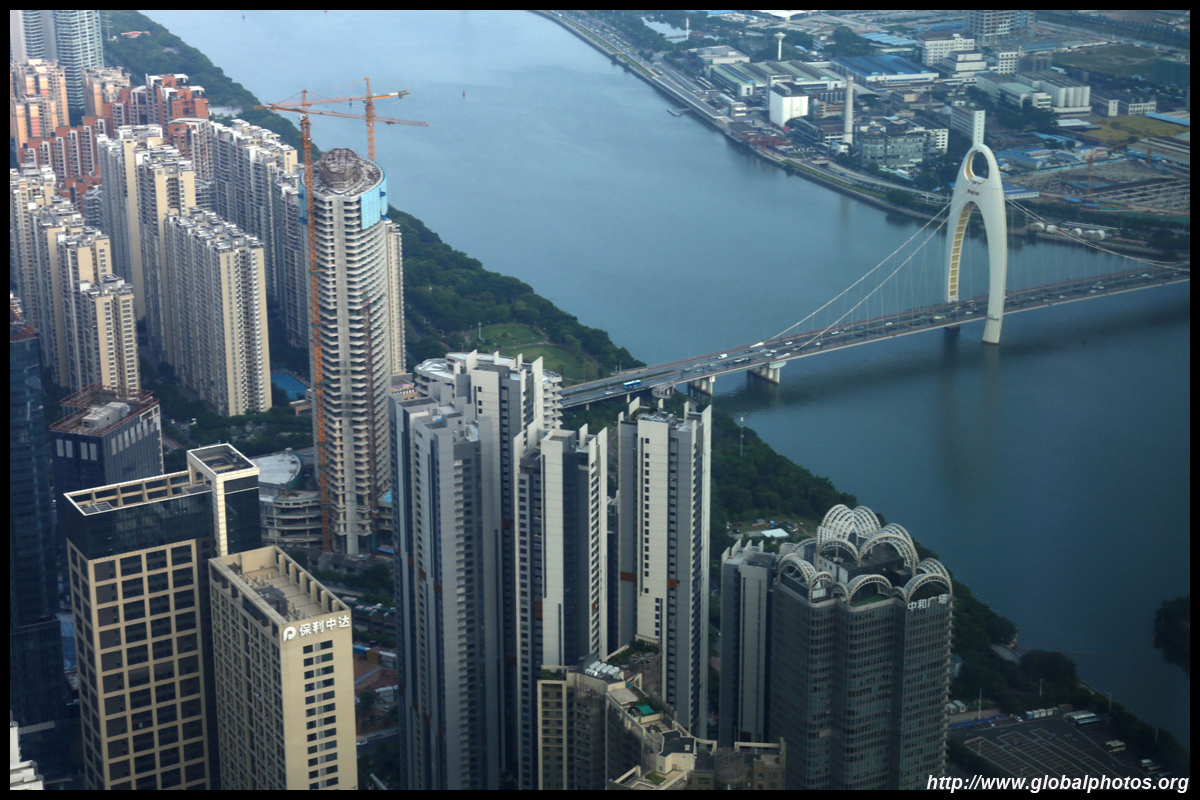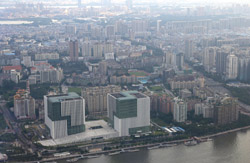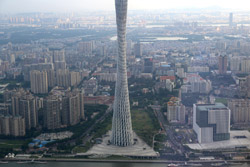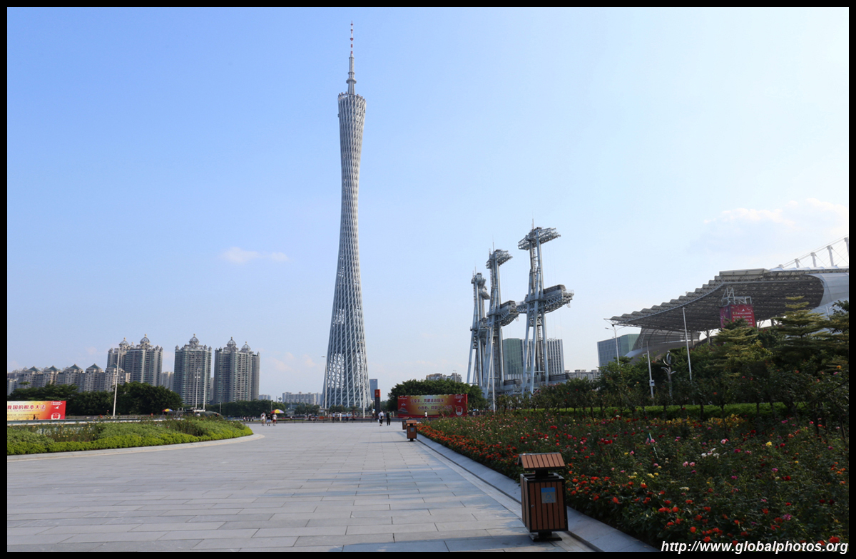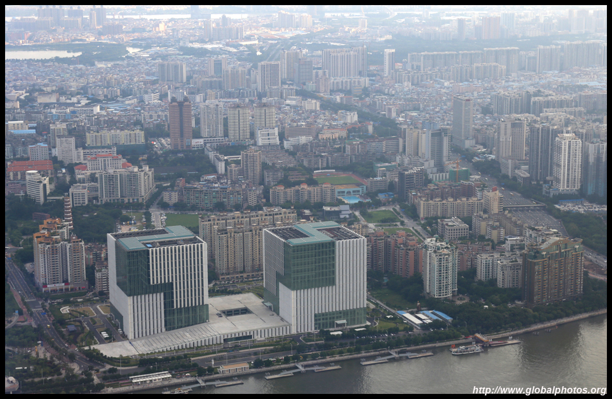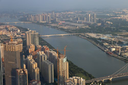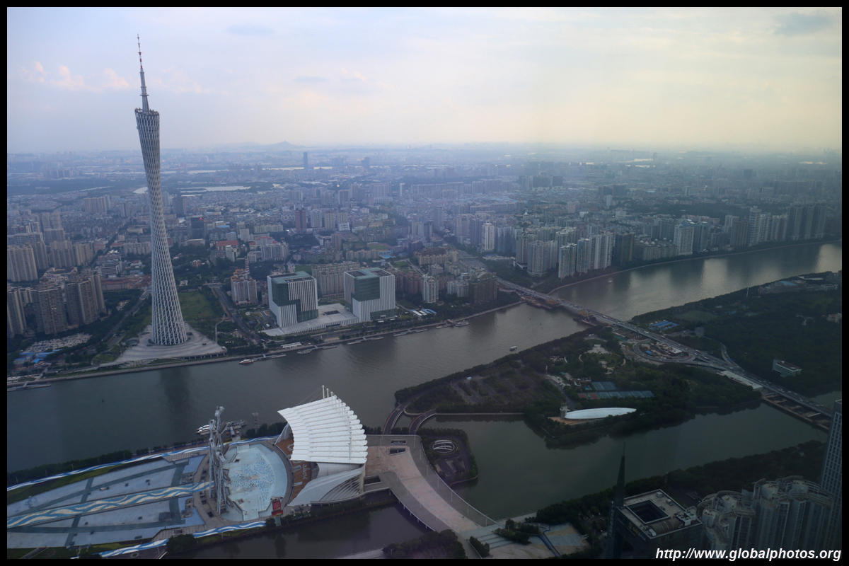 The new central axis extends across the Pearl River to end at the tower.