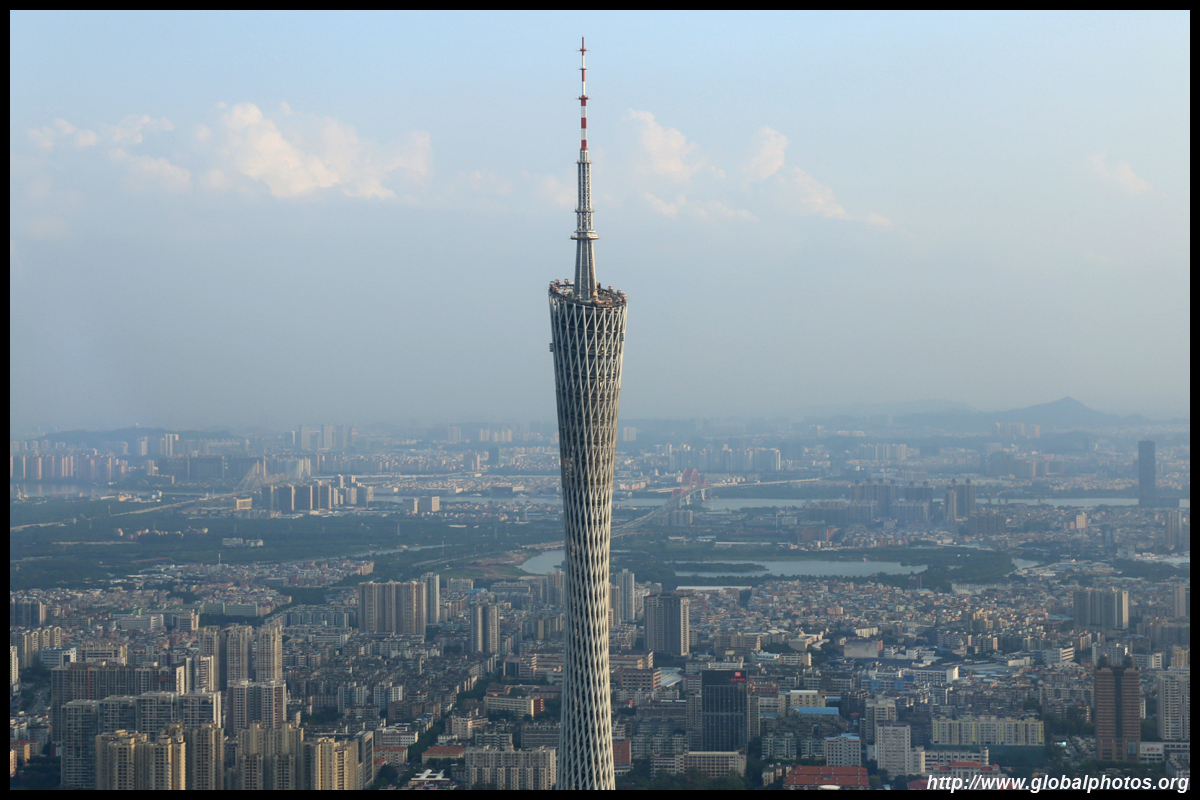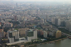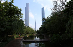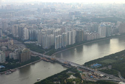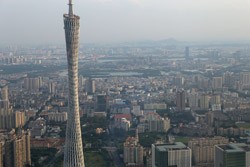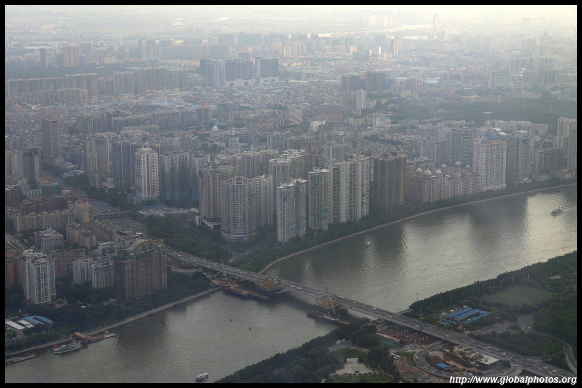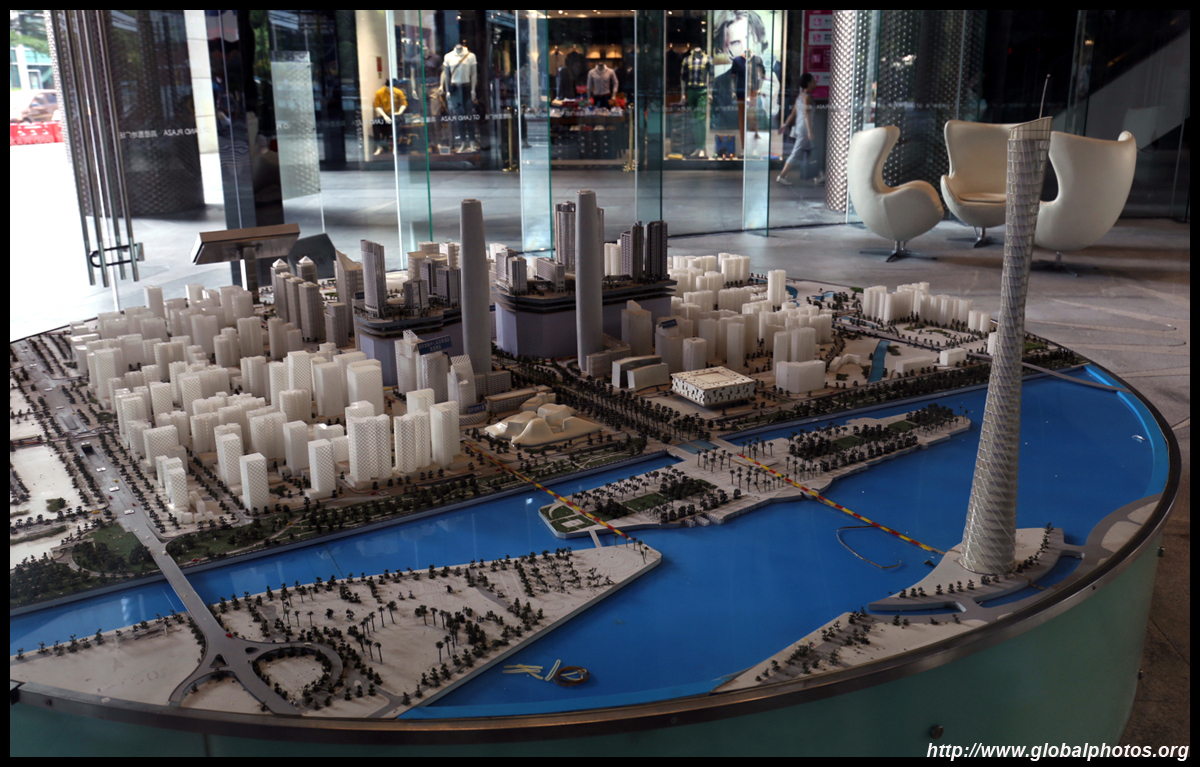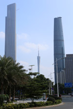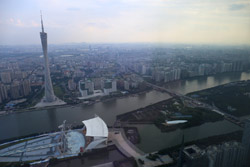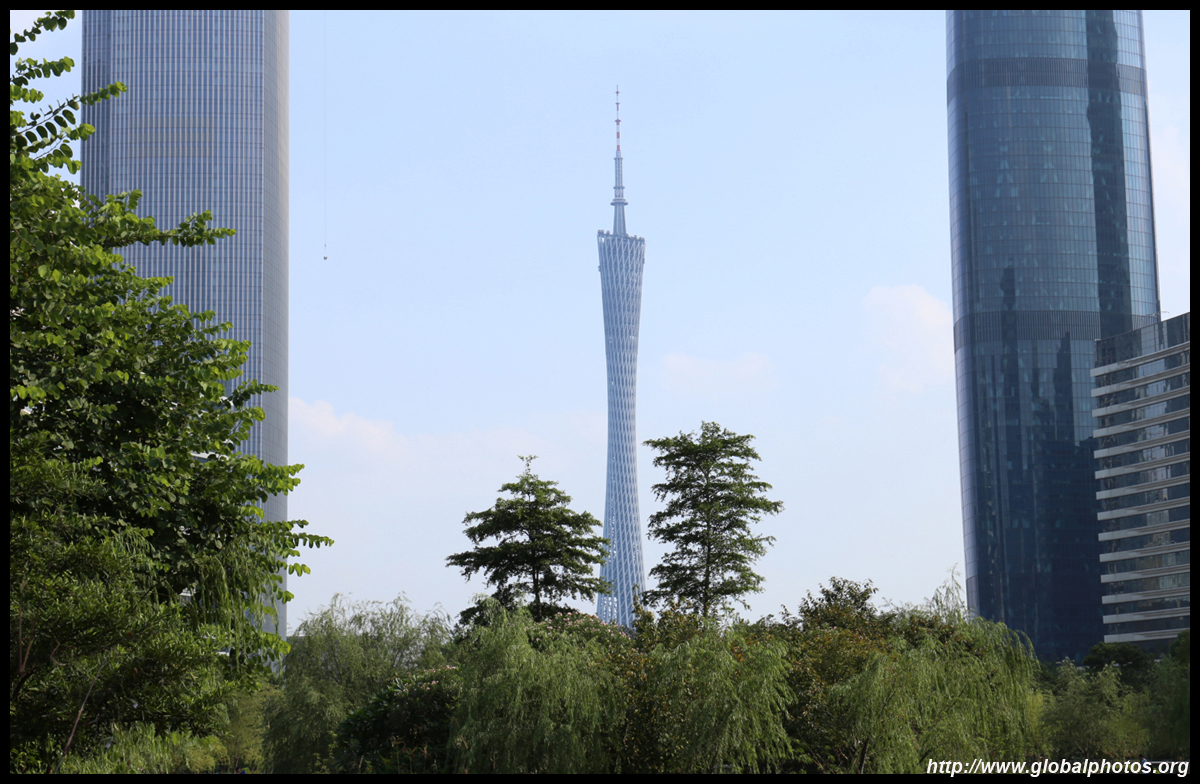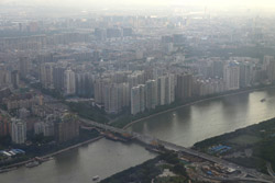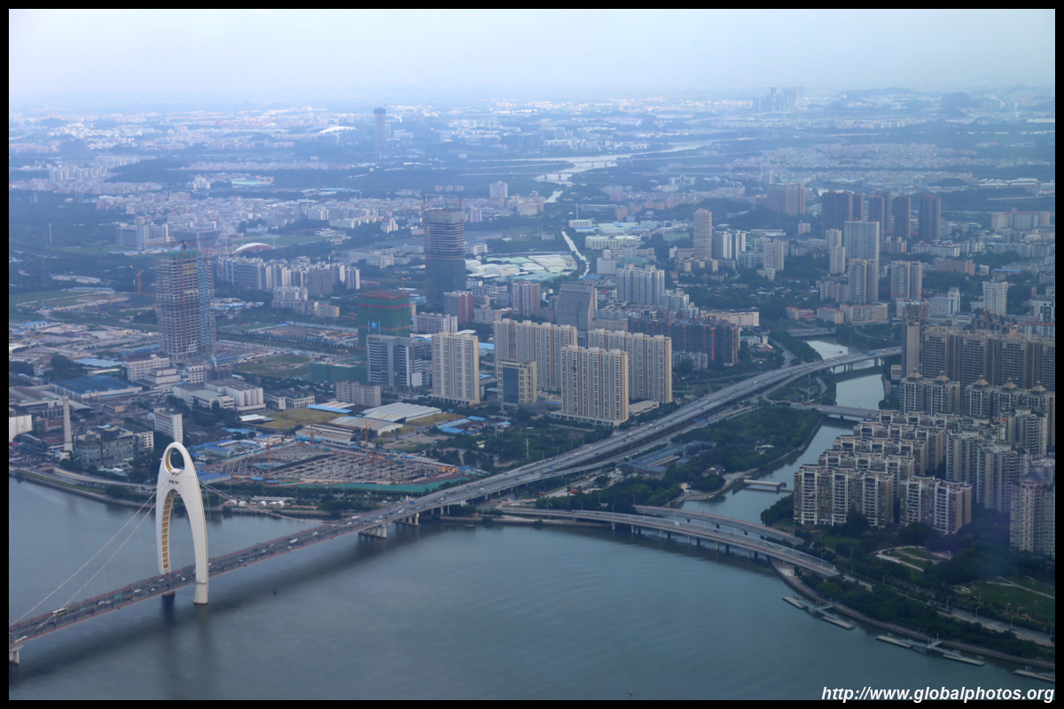 The new central axis extends across the Pearl River to end at the tower.