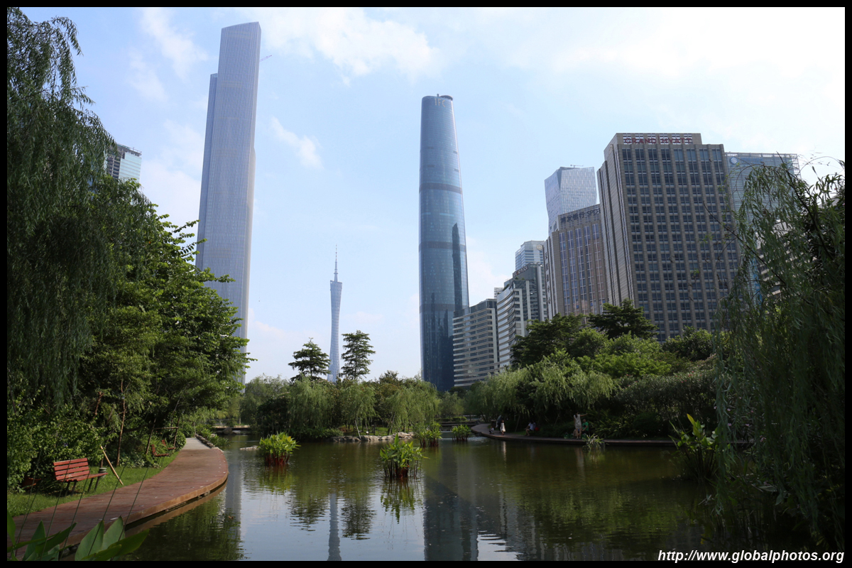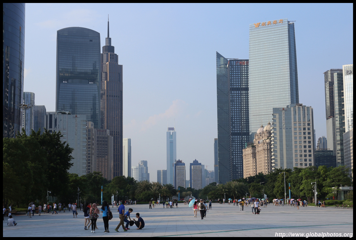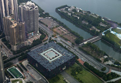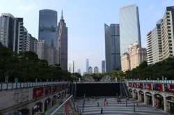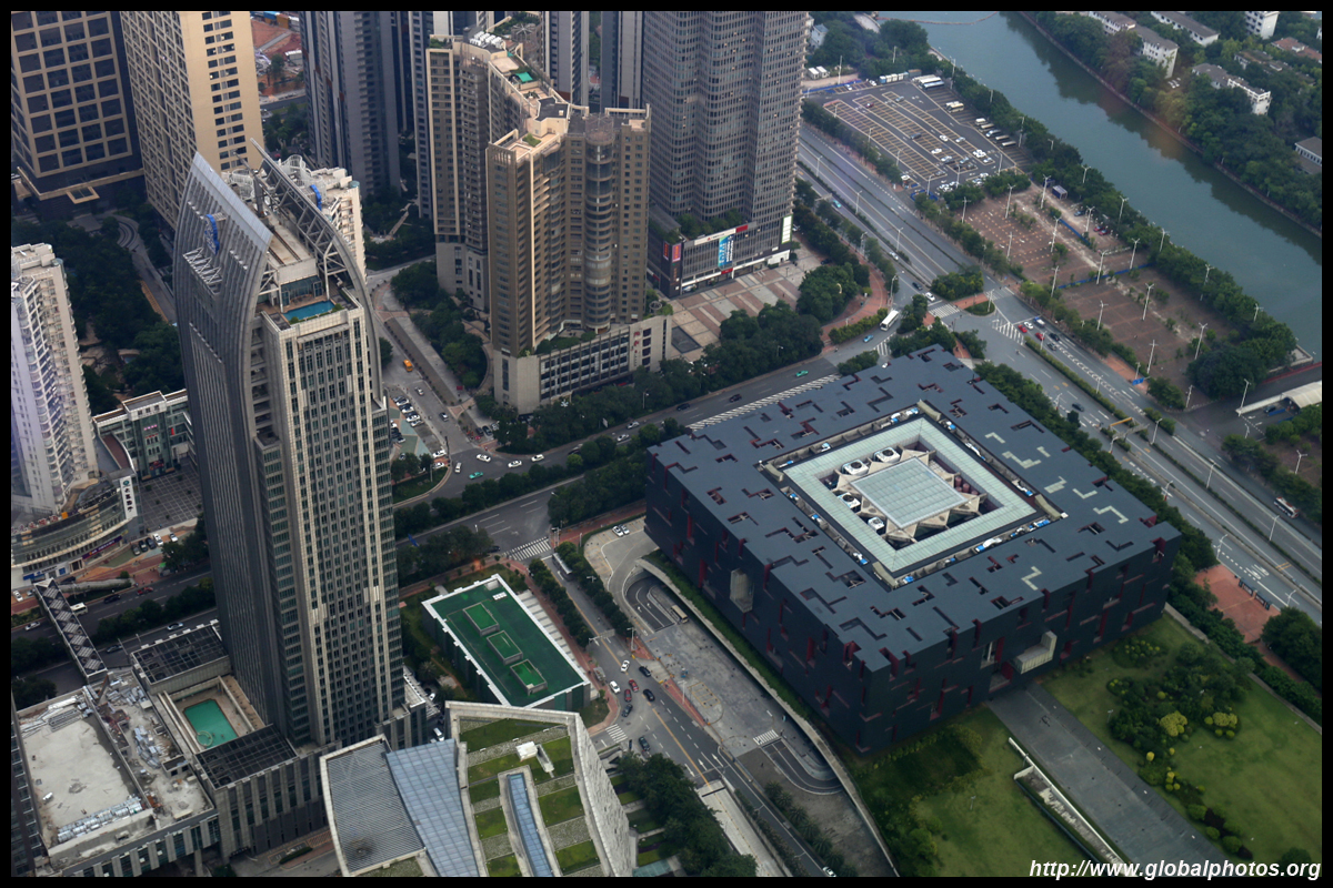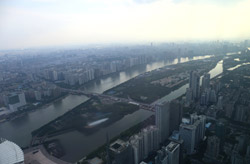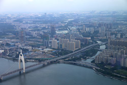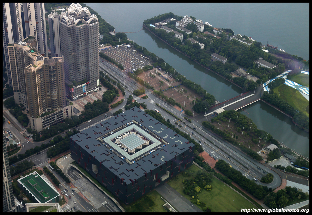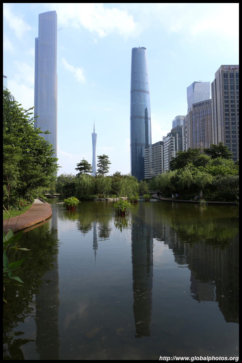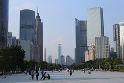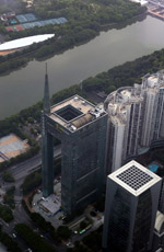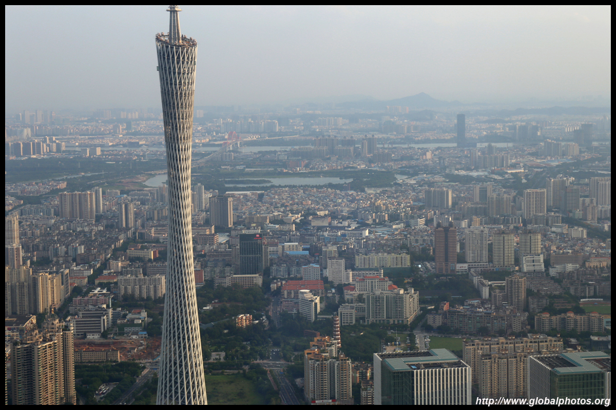 The new central axis extends across the Pearl River to end at the tower.