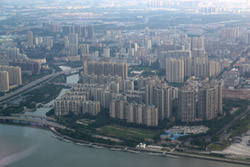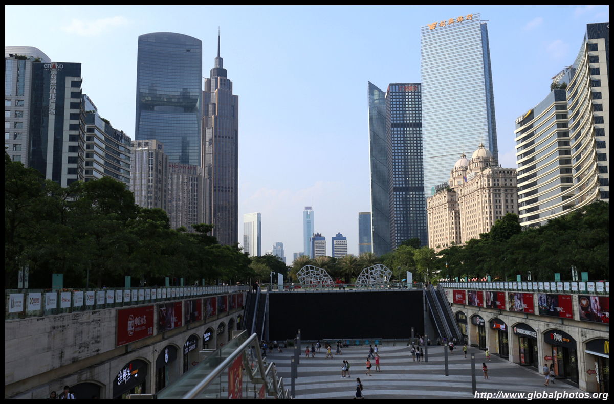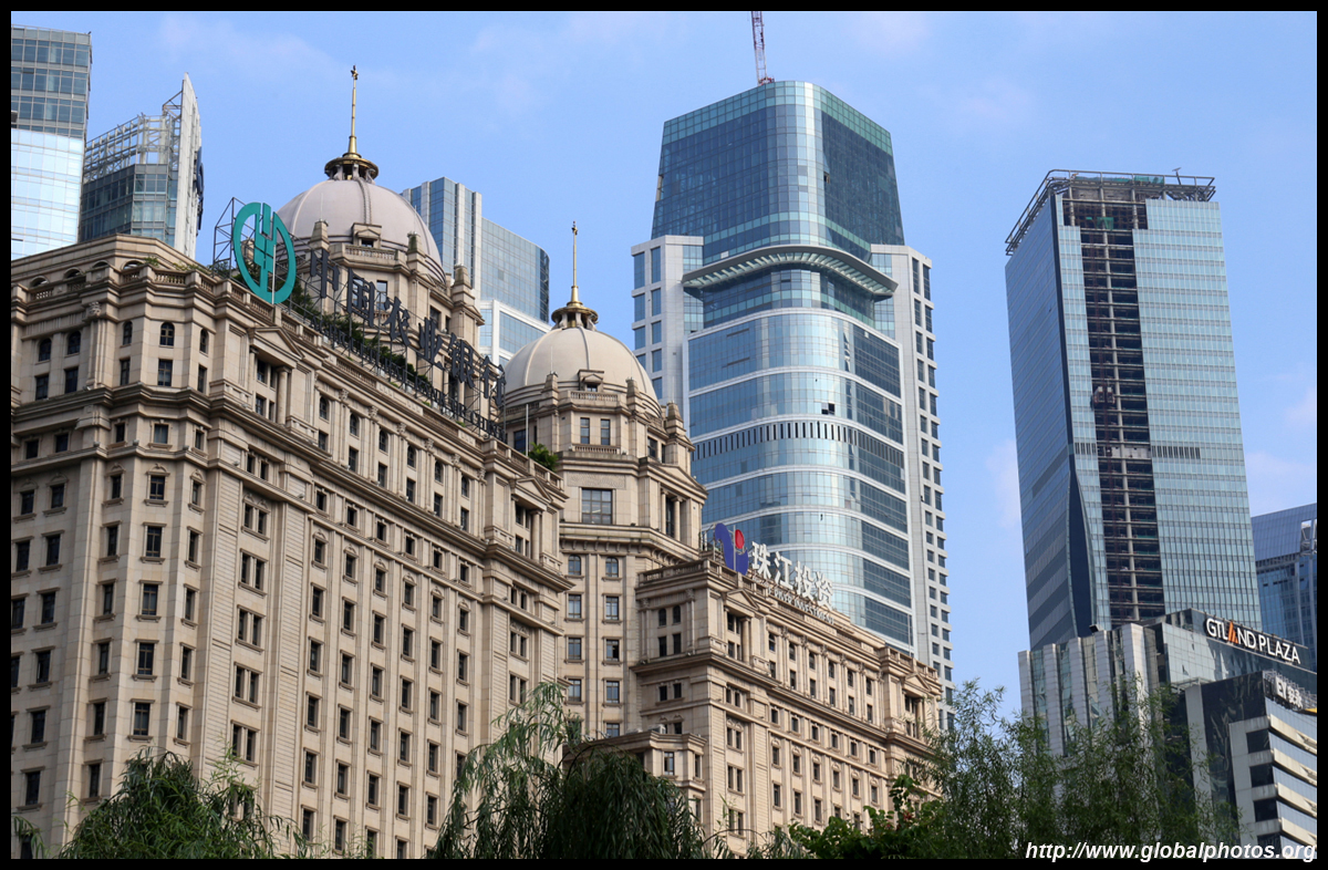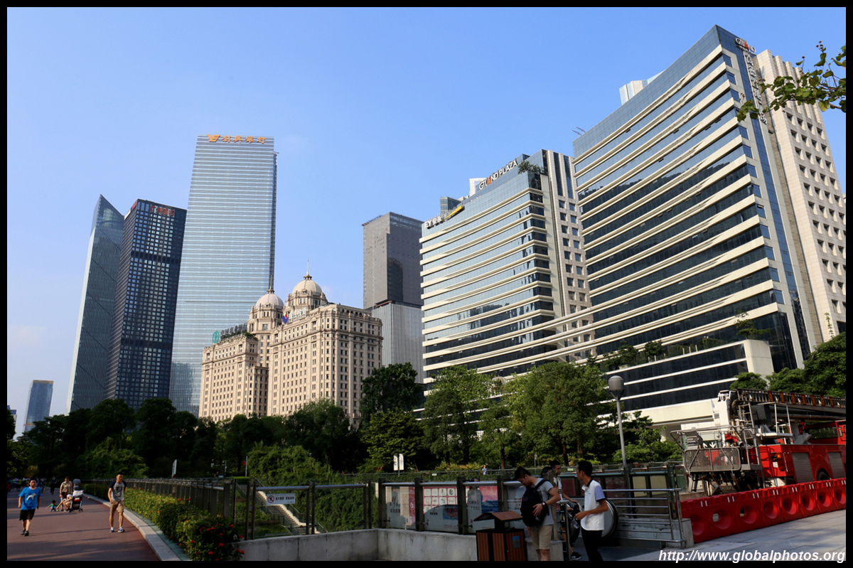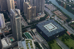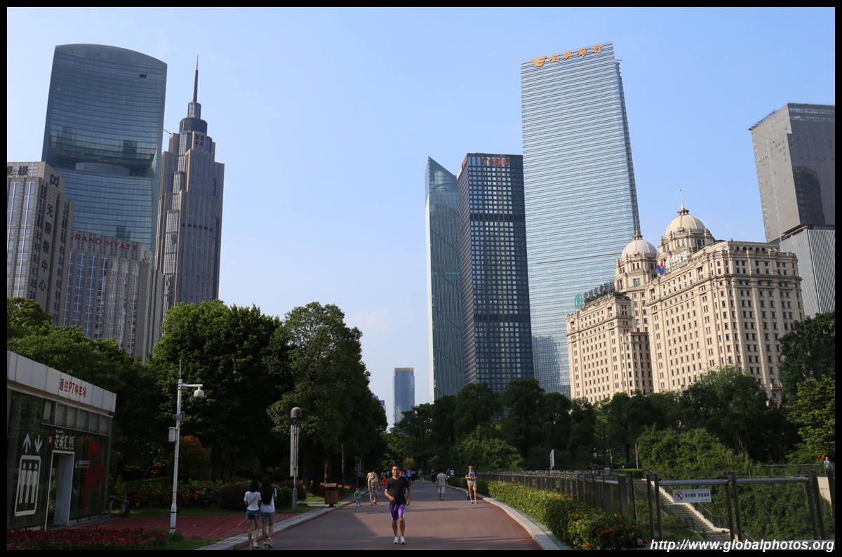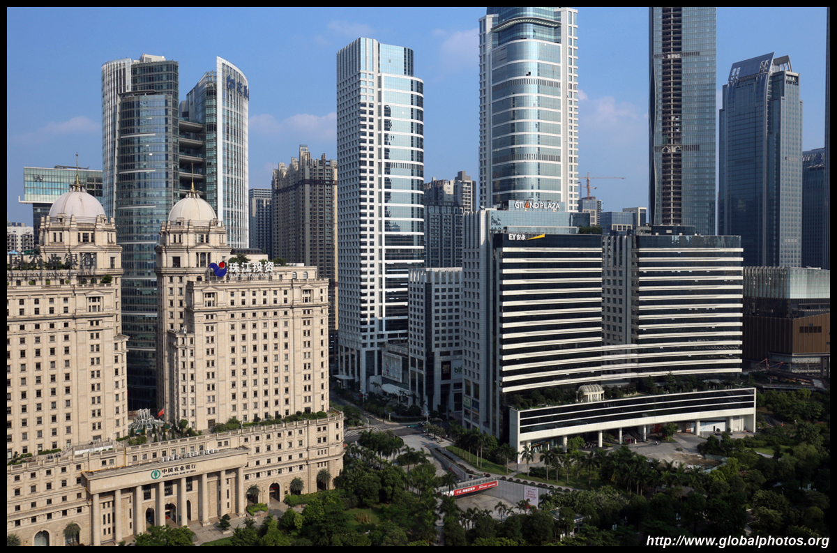 The new central axis extends across the Pearl River to end at the tower.