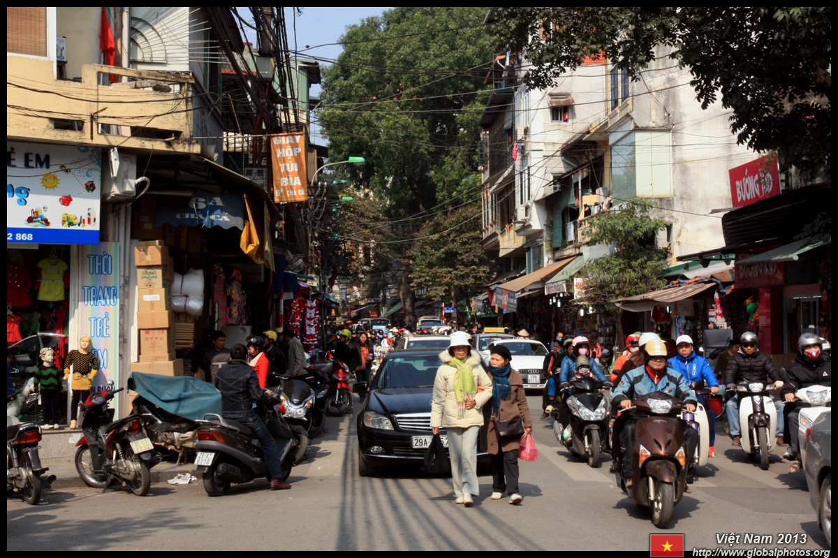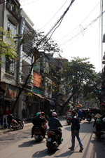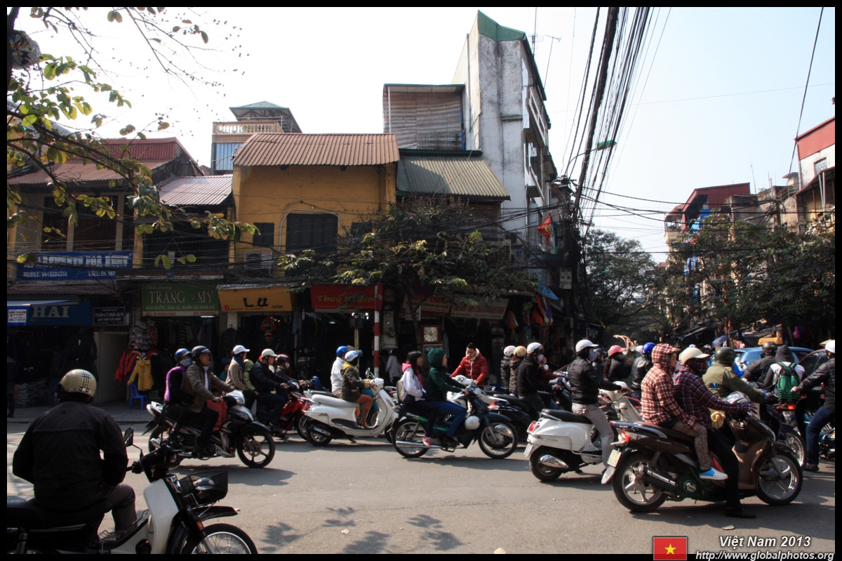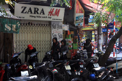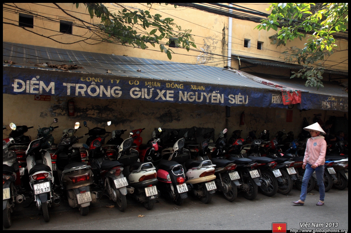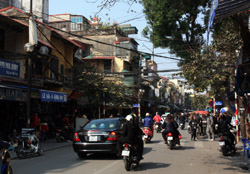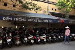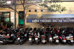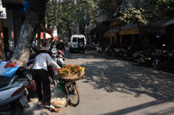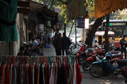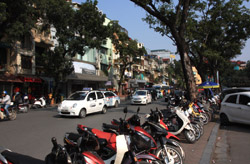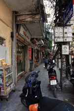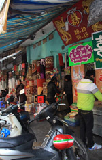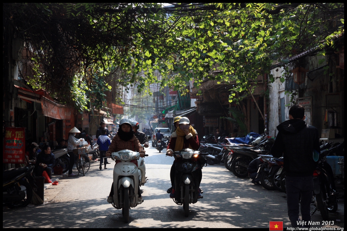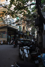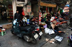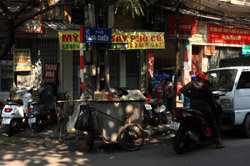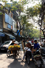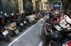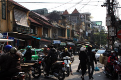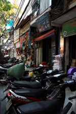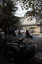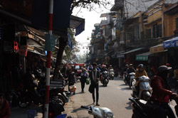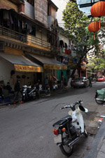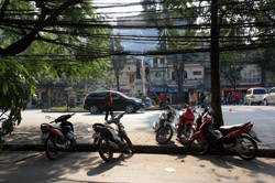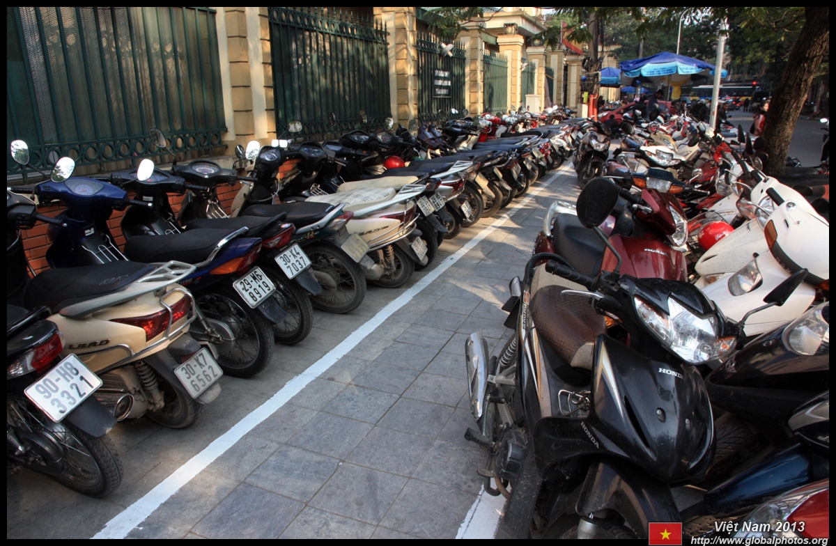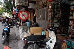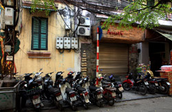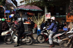 The area's streets are quite narrow, so riding a motorcycle seems sensible. For pedestrians, weaving through the traffic is quite a stressful experience.