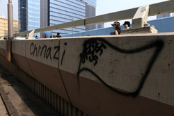 Volunteers also handed out face masks as they were worried spies were photographing people on the bridge. A number of press photographers were up there taking footage of the crowds.