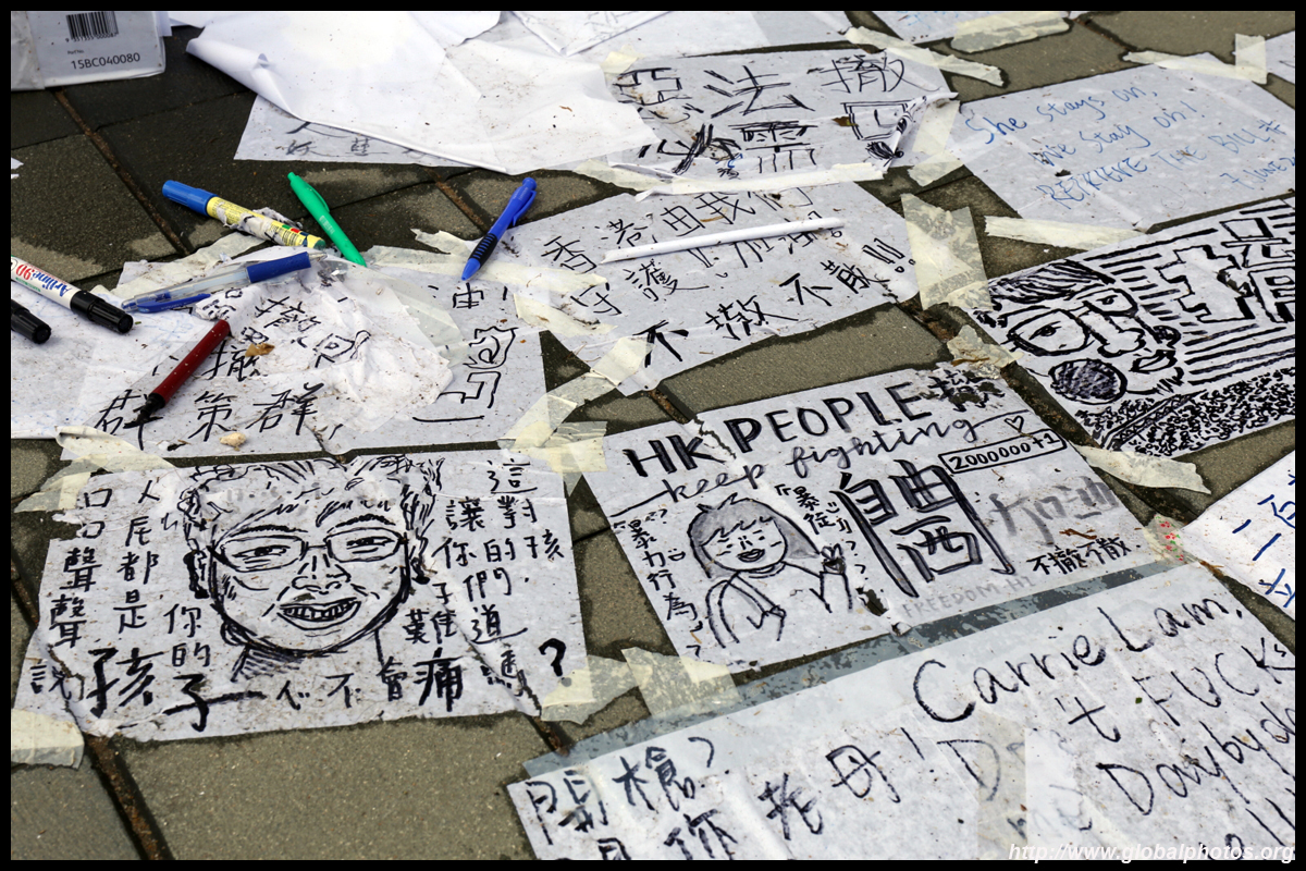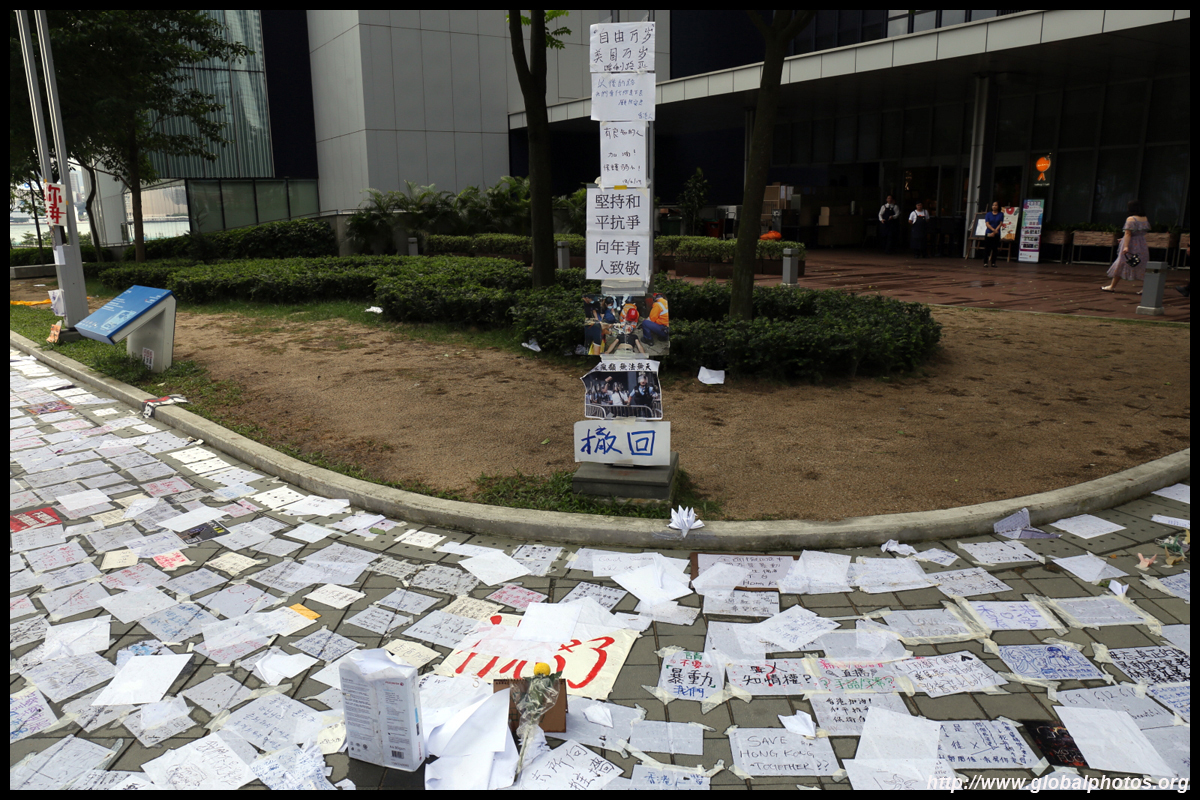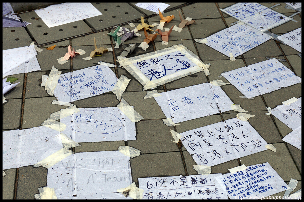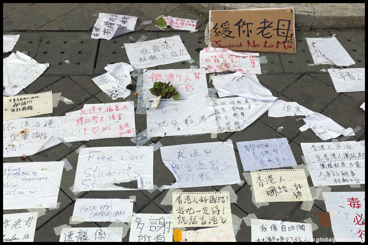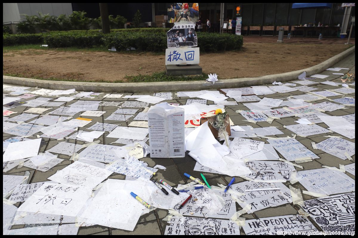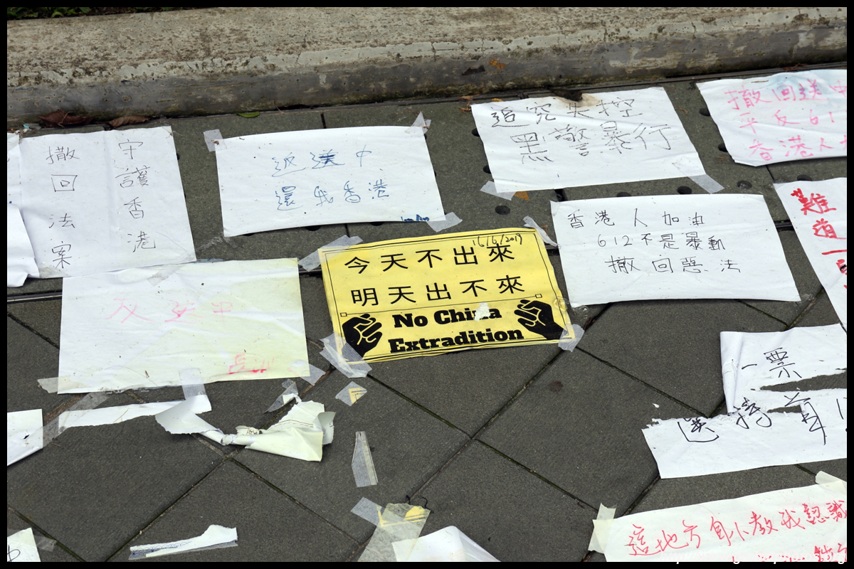 In the aftermath of the protests, banners remained at the Government Headquarters, including a "Lennon Wall" of people's thoughts on post-it notes. Stationery was available for you to post your thoughts as well. In addition to protesting against the bill, there was also a lot of anger at Carrie Lam and the police for using excessive force.
