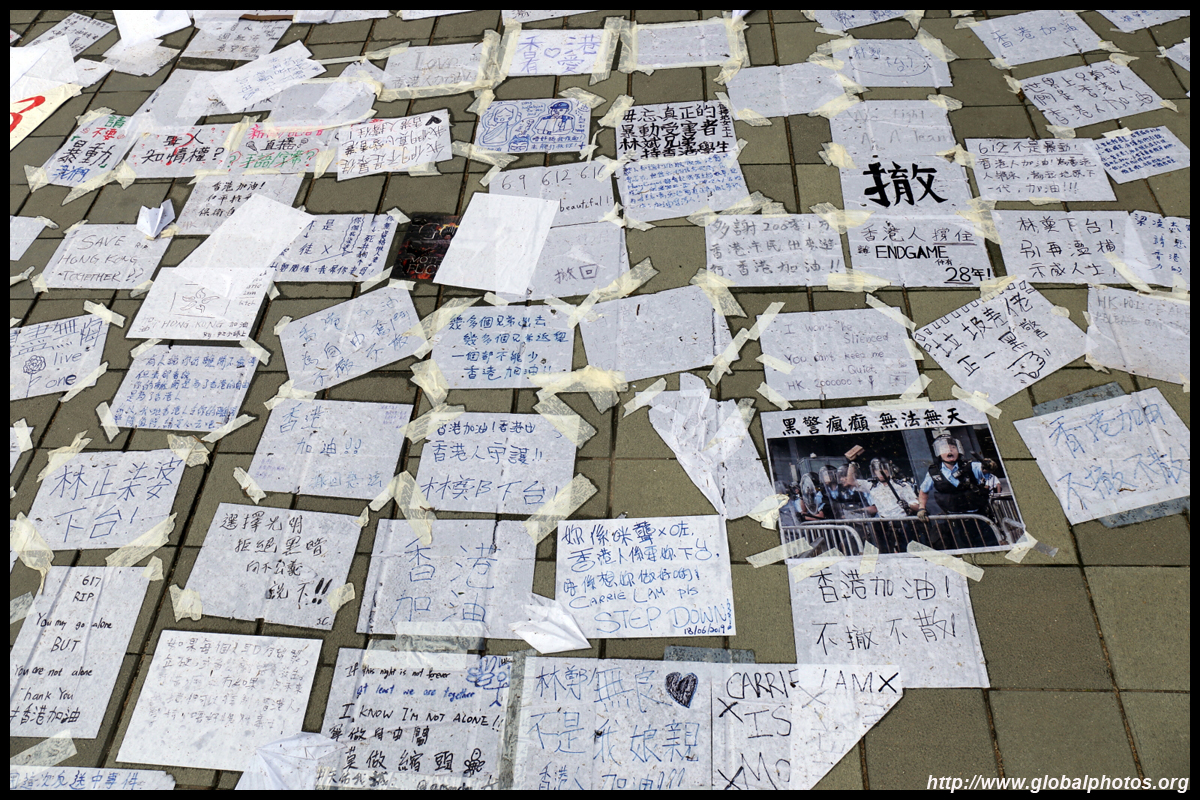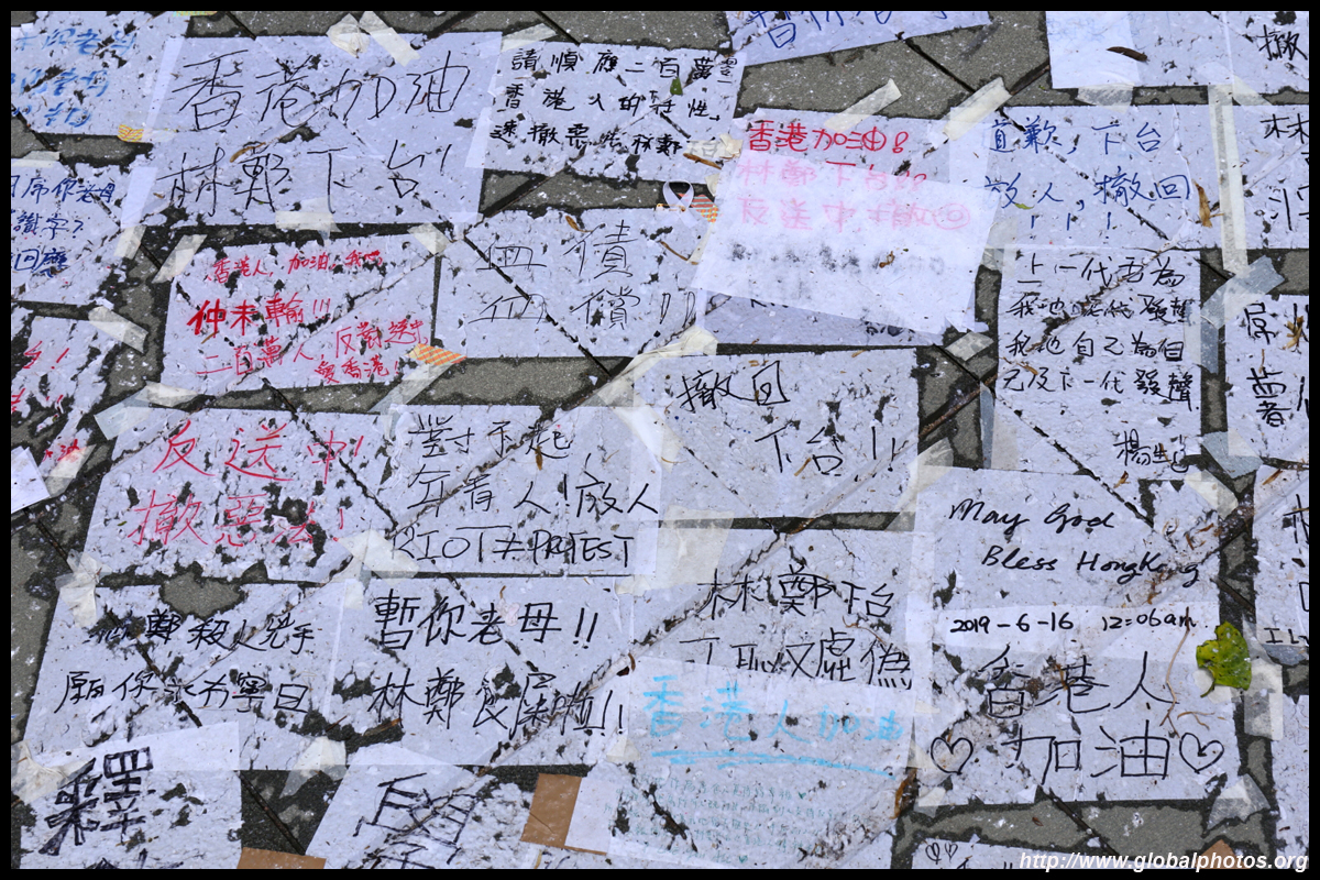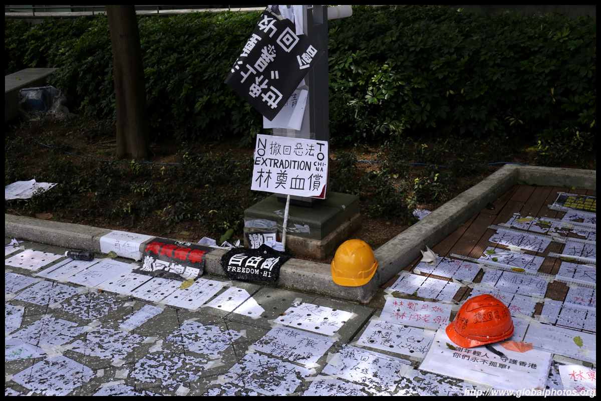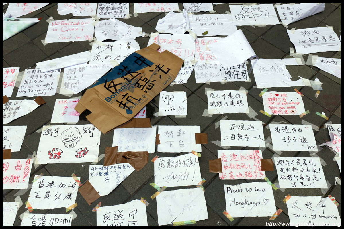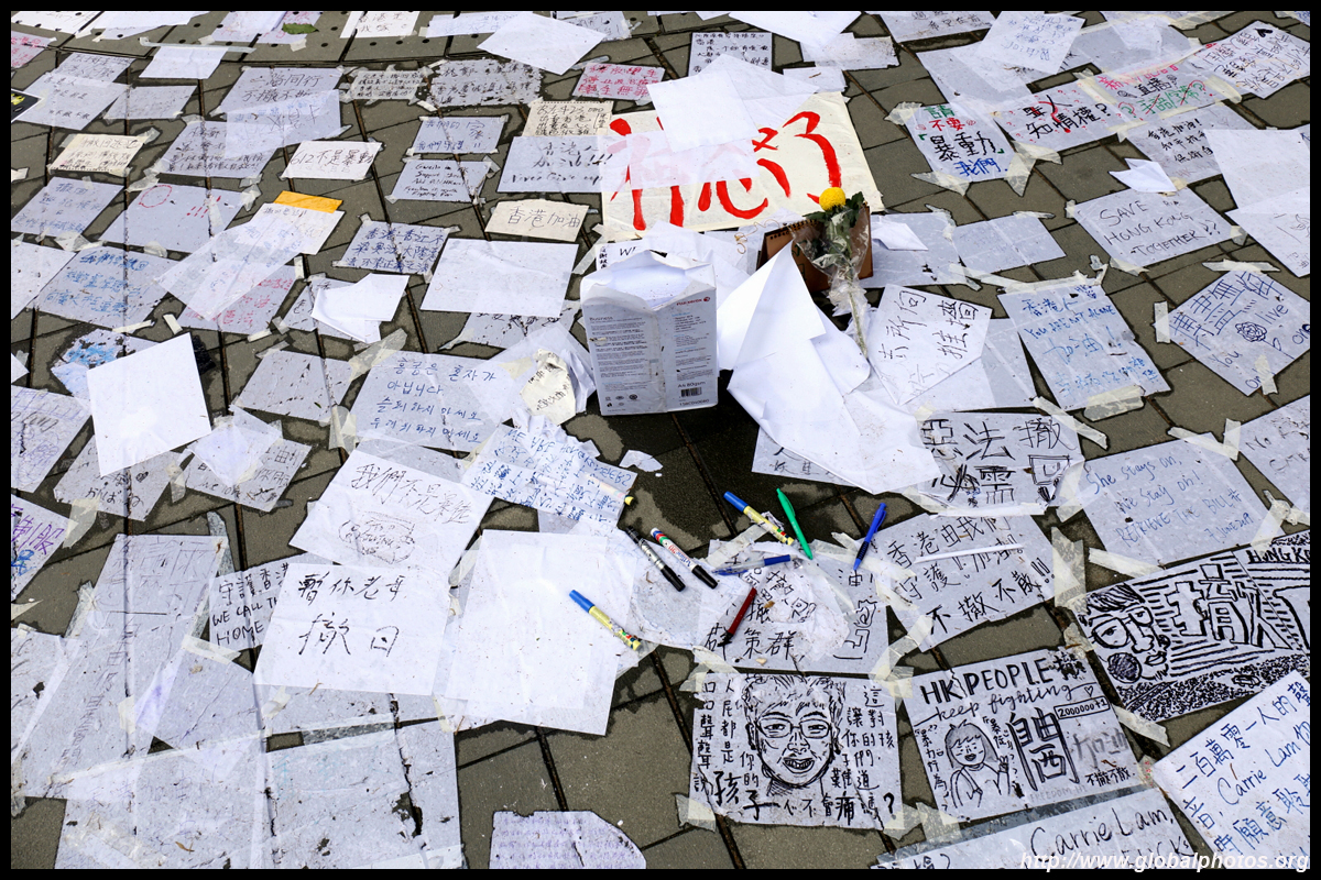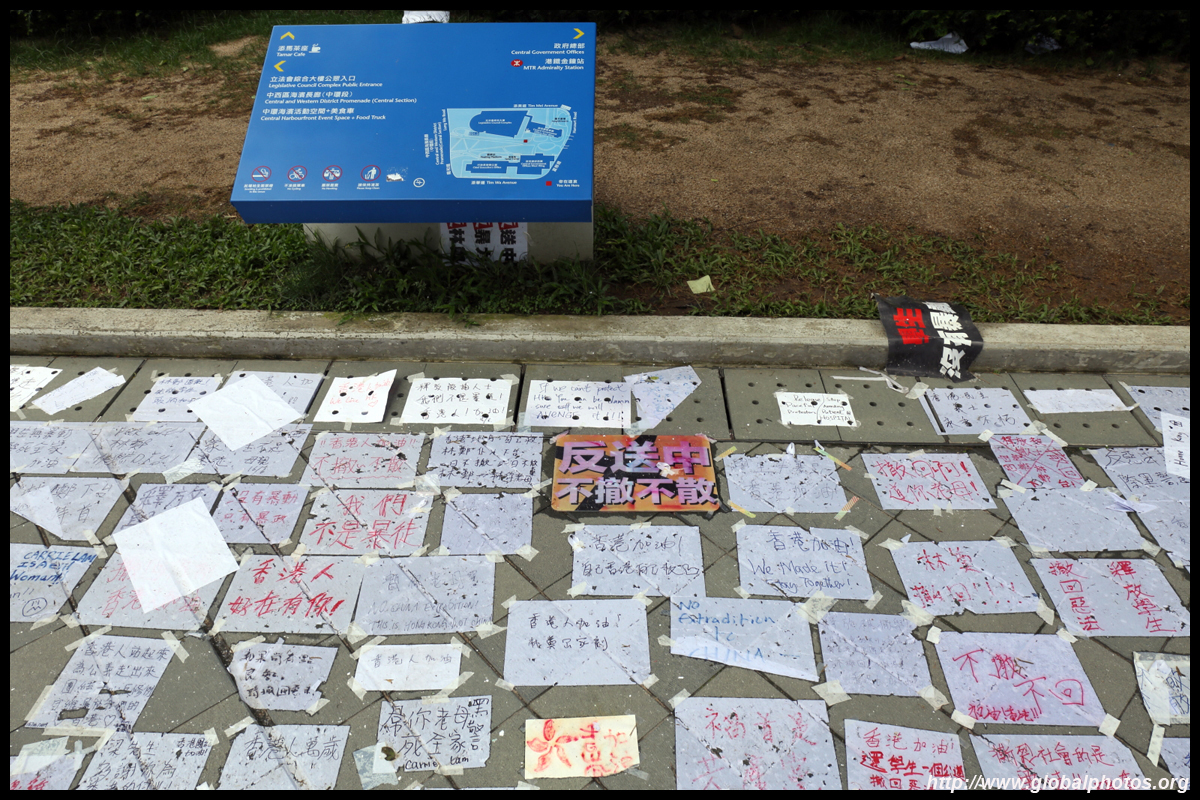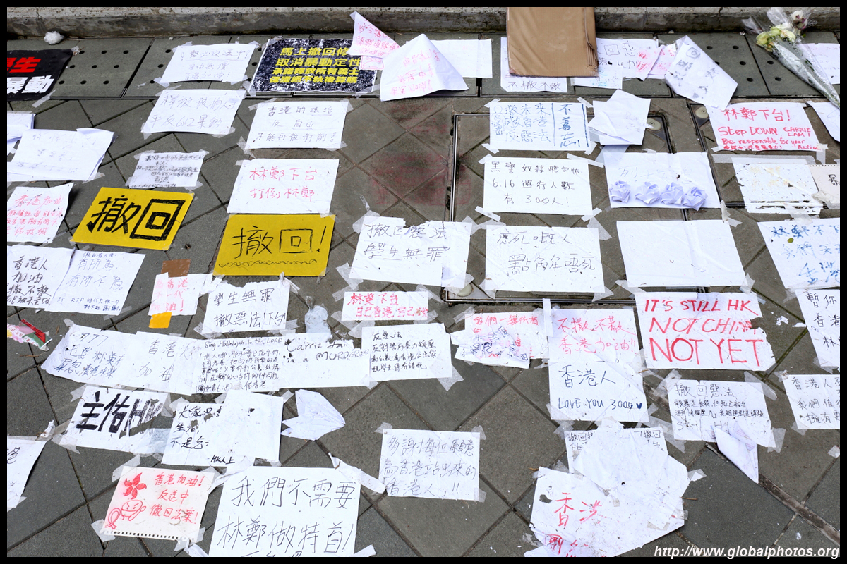 In the aftermath of the protests, banners remained at the Government Headquarters, including a "Lennon Wall" of people's thoughts on post-it notes. Stationery was available for you to post your thoughts as well. In addition to protesting against the bill, there was also a lot of anger at Carrie Lam and the police for using excessive force.