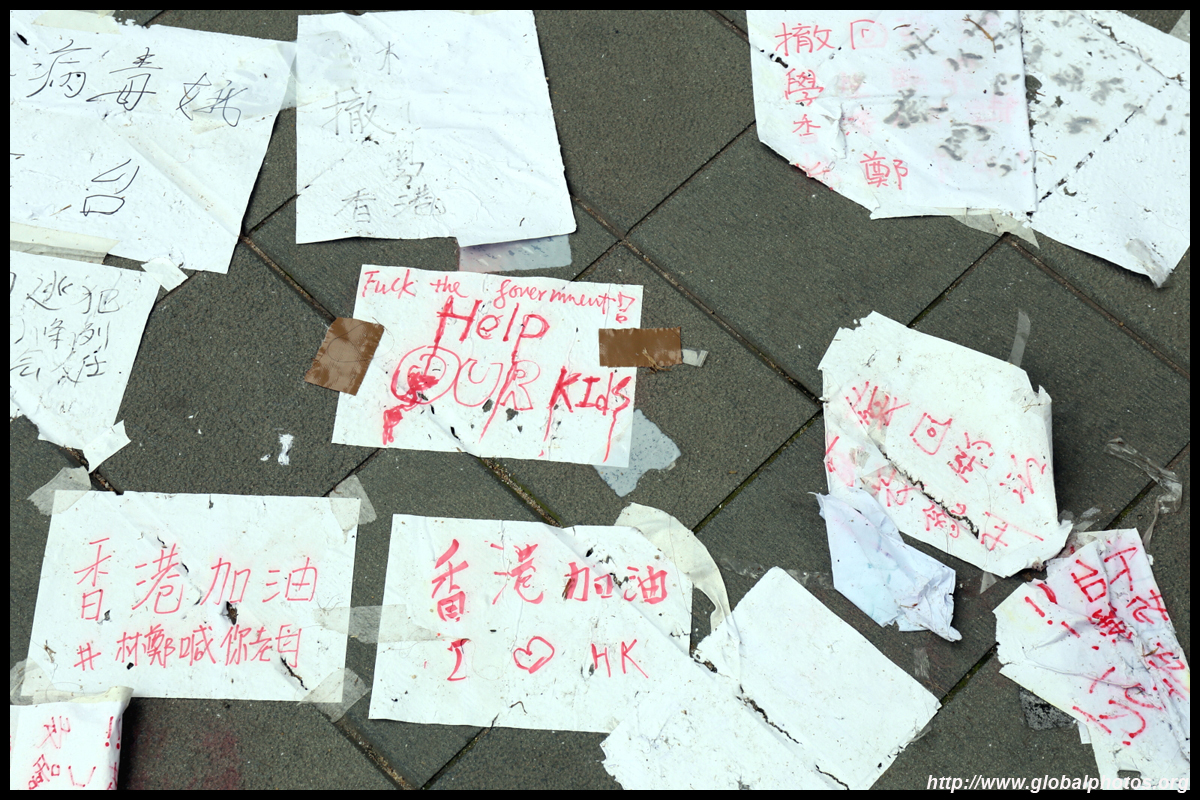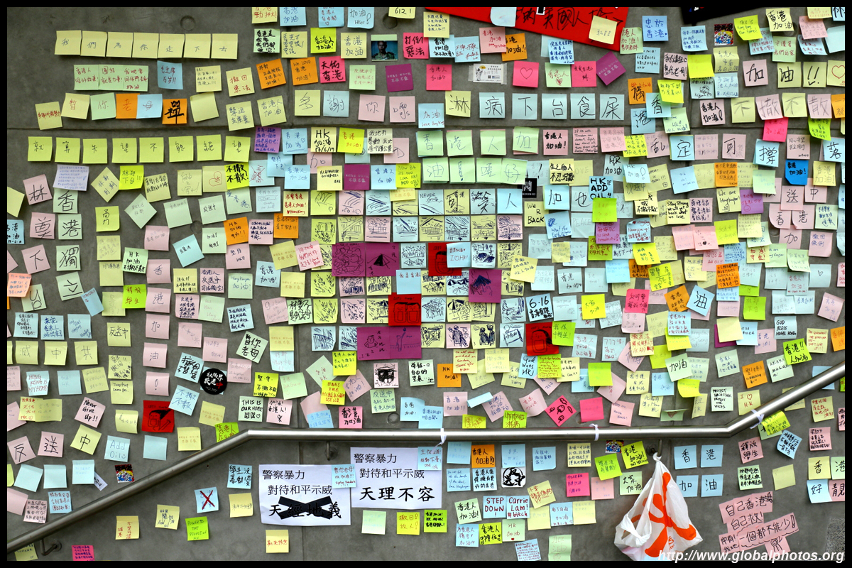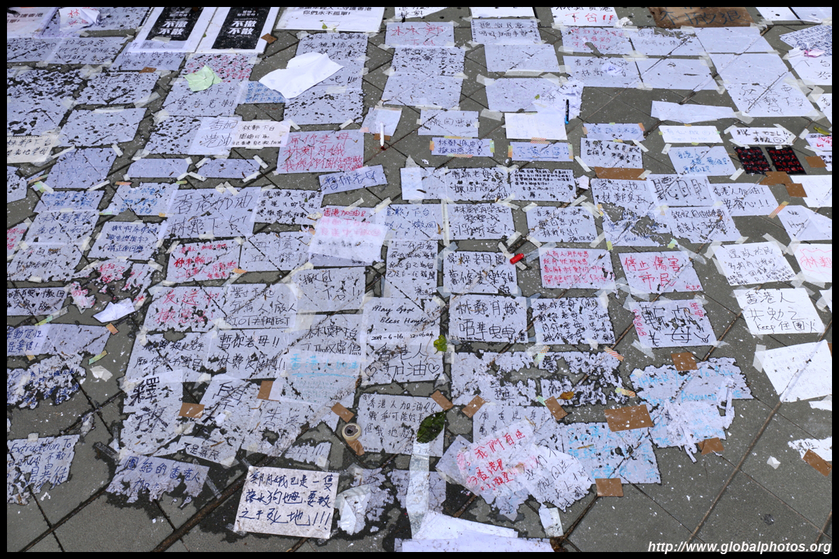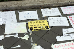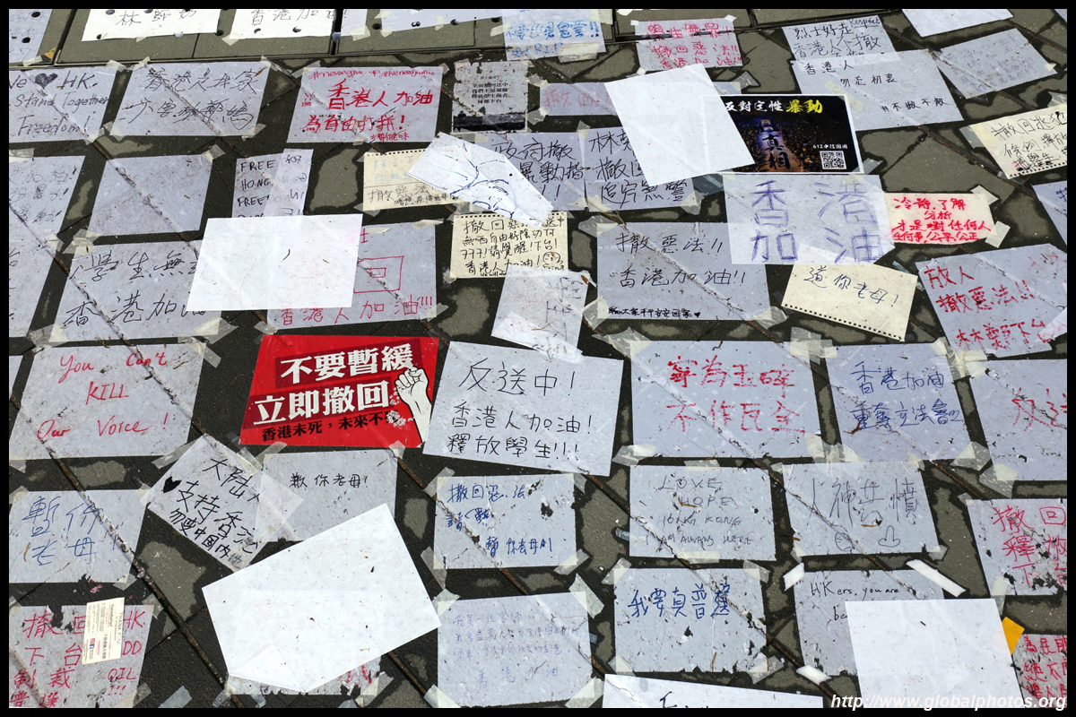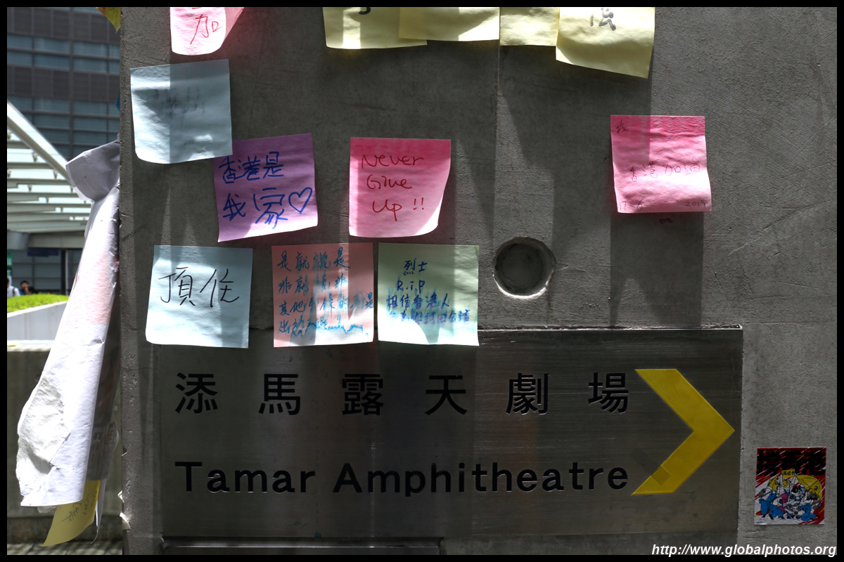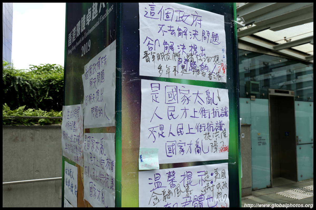 In the aftermath of the protests, banners remained at the Government Headquarters, including a "Lennon Wall" of people's thoughts on post-it notes. Stationery was available for you to post your thoughts as well. In addition to protesting against the bill, there was also a lot of anger at Carrie Lam and the police for using excessive force.