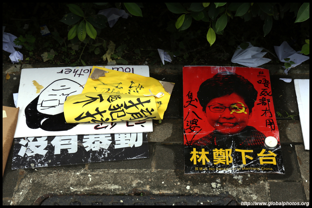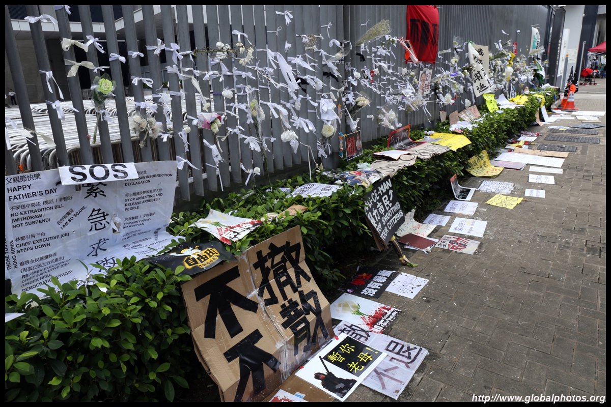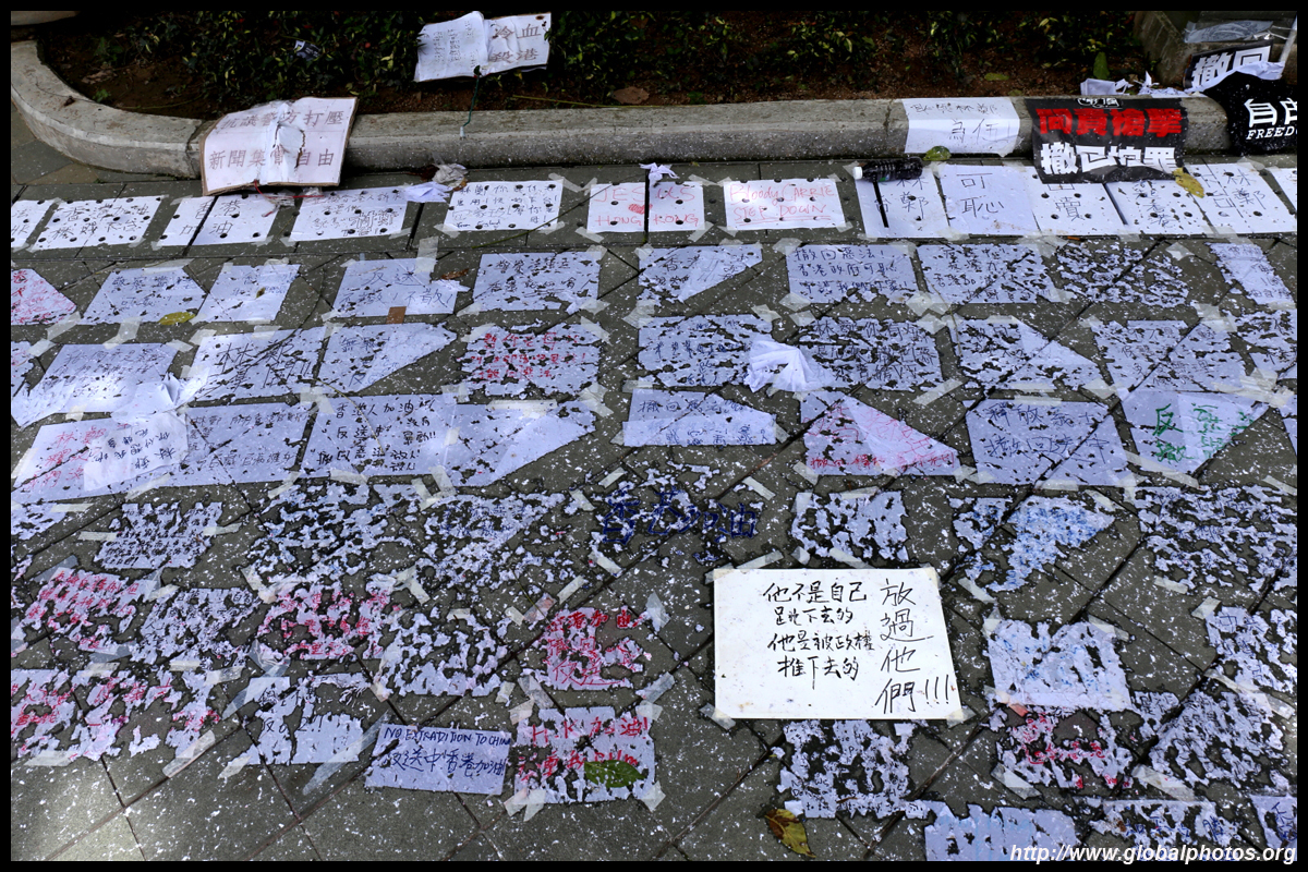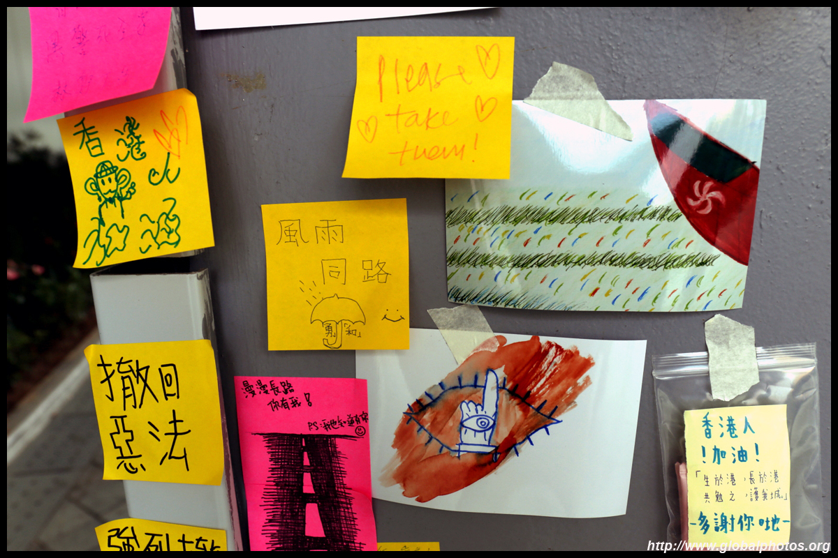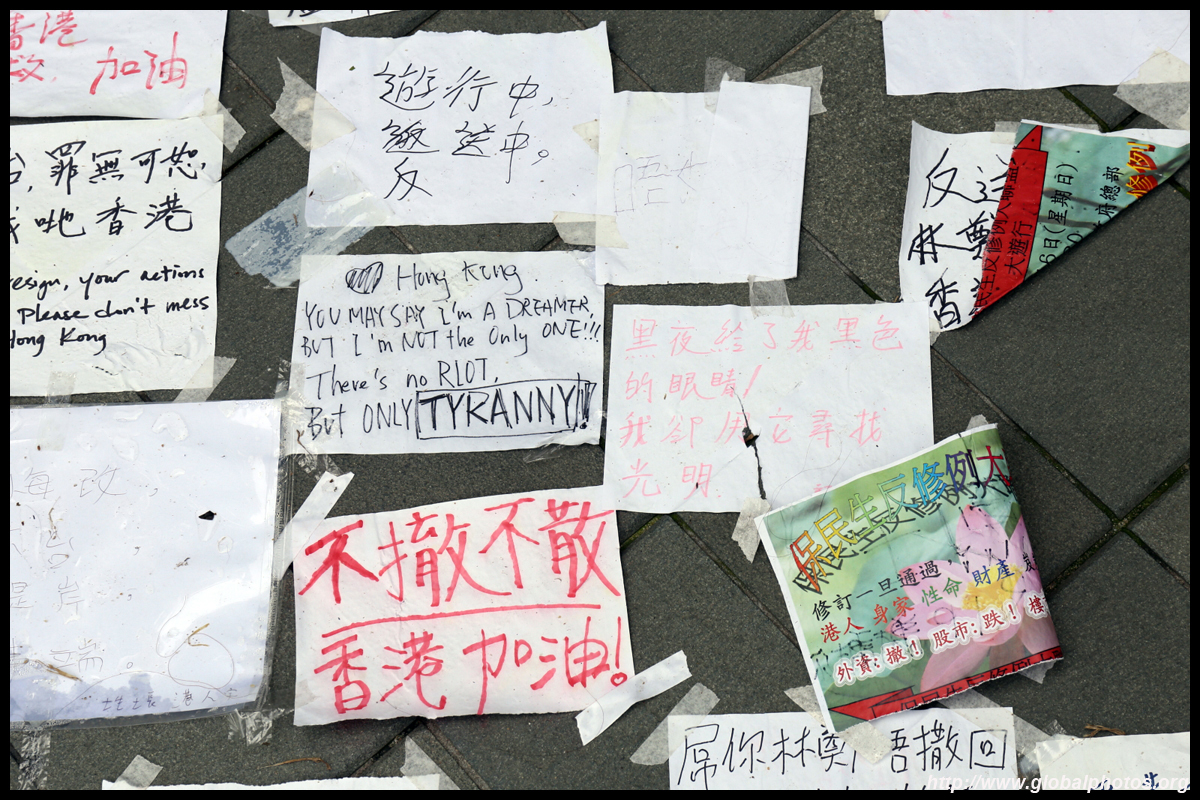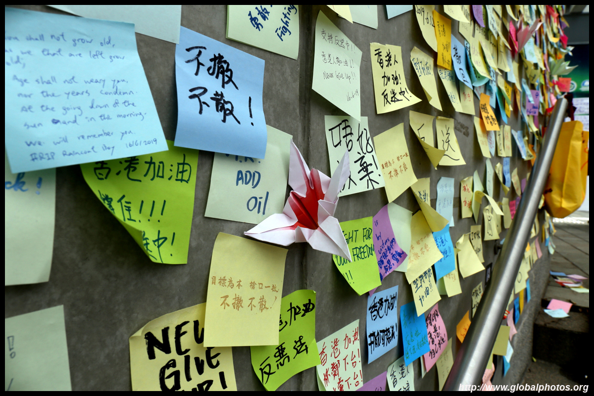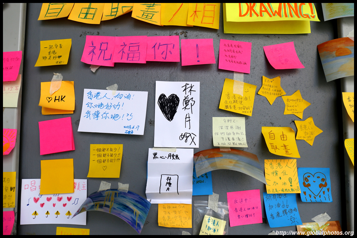 In the aftermath of the protests, banners remained at the Government Headquarters, including a "Lennon Wall" of people's thoughts on post-it notes. Stationery was available for you to post your thoughts as well. In addition to protesting against the bill, there was also a lot of anger at Carrie Lam and the police for using excessive force.