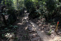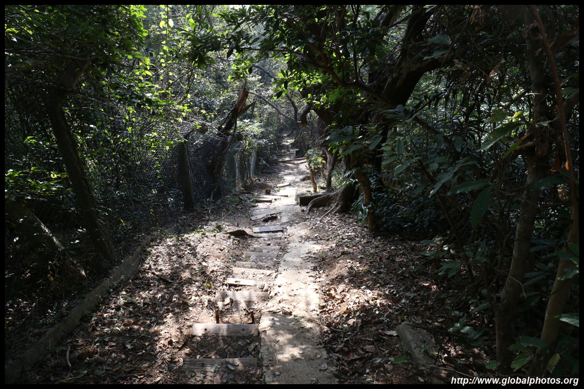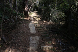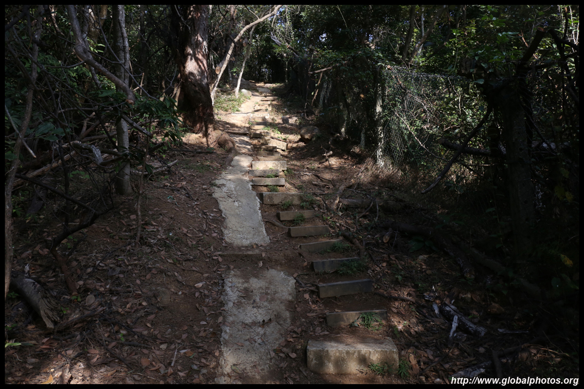 The first section is a long staircase up towards the trigonometry point. Then head into the bushes through the dirt paths with the coloured ribbons. You are now at the top of the hill with views of the surrounding oceans and Stanley Prison behind you.