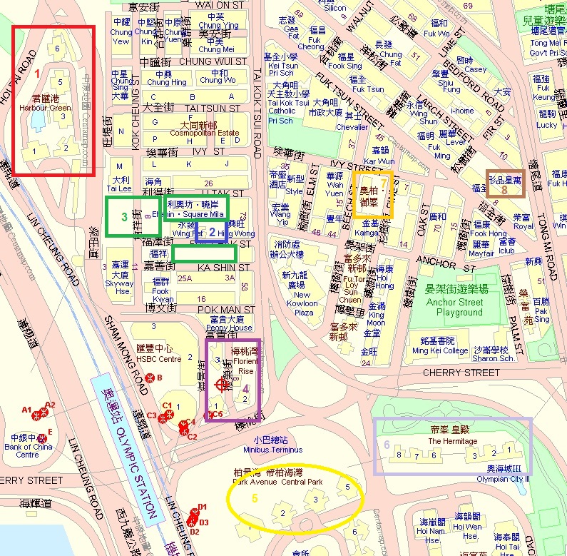 Here is a wider view with Florient Rise (#4), Central Park (#5), and The Hermitage (#6). Both HSBC and Bank of China have large offices at Olympic station.