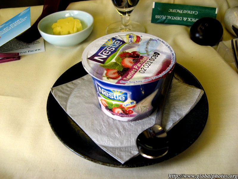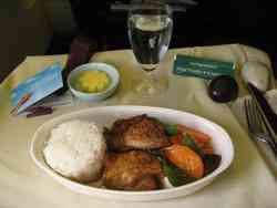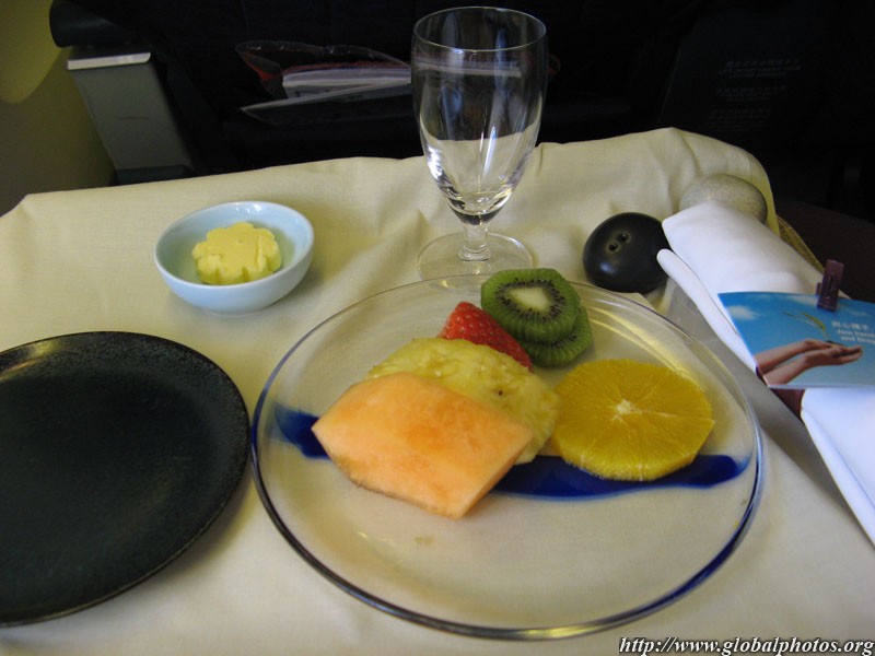 During the servings of breakfast, I kept an eye on the window for more shots of clouds and ocean. Then came the yogurt, then the main course. I picked the chicken dish, which was pretty good, although nothing exceptional. Business Class meal serving methods have changed. They used to push a cart out showing the dishes, much like economy class. But now they'd get my order and personally bring the dish out. They should've started doing this long ago.