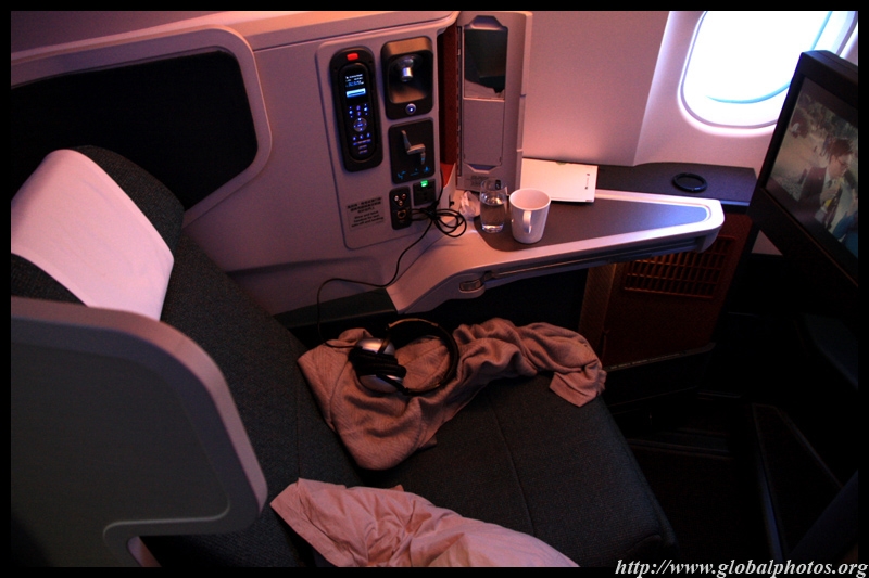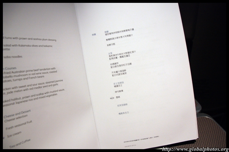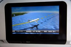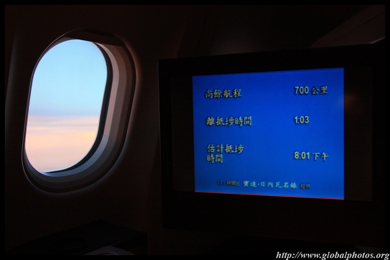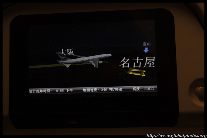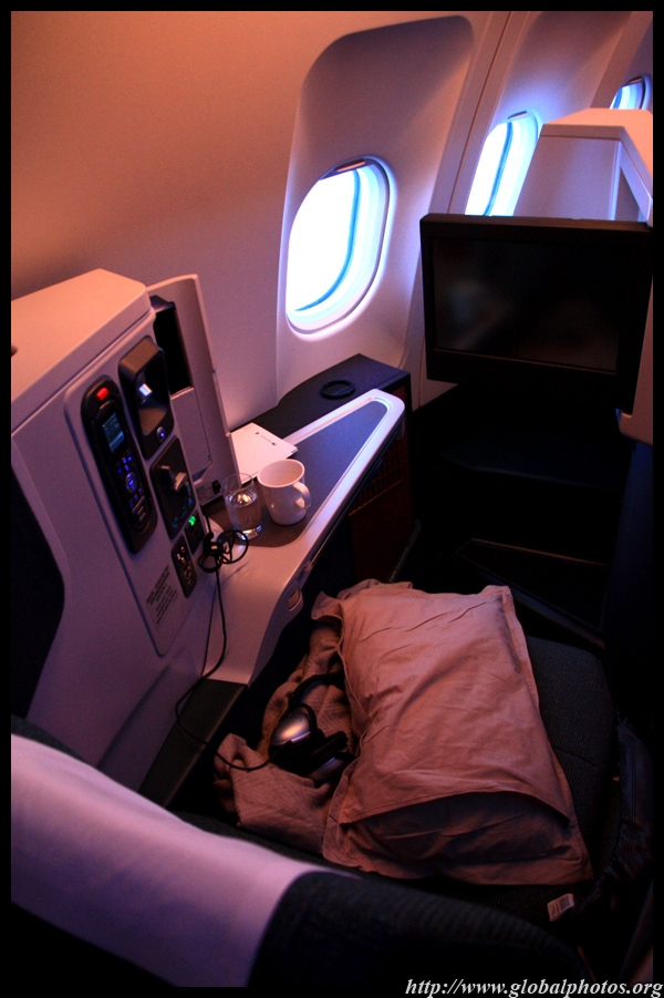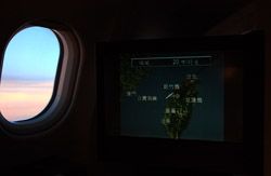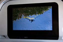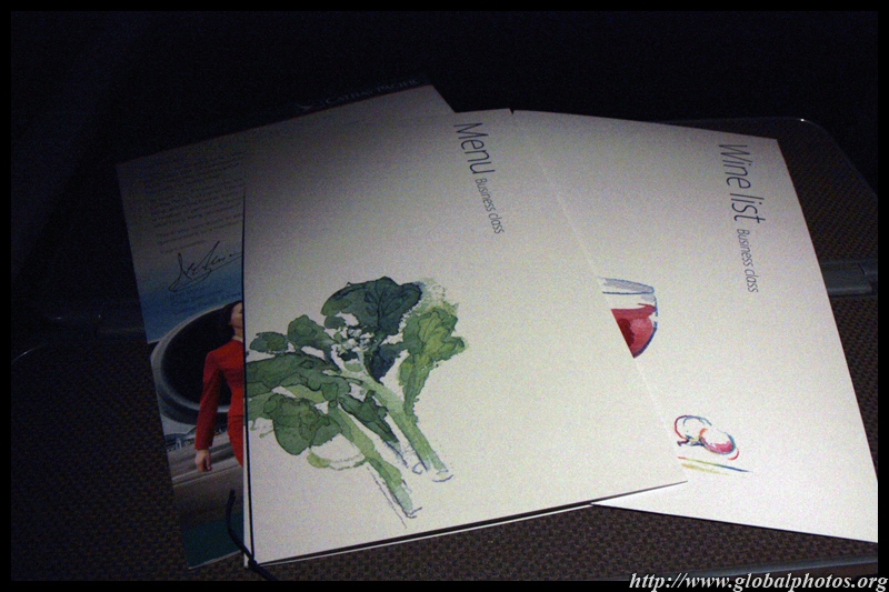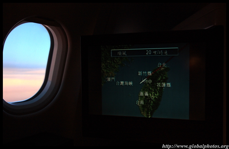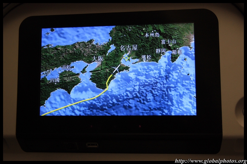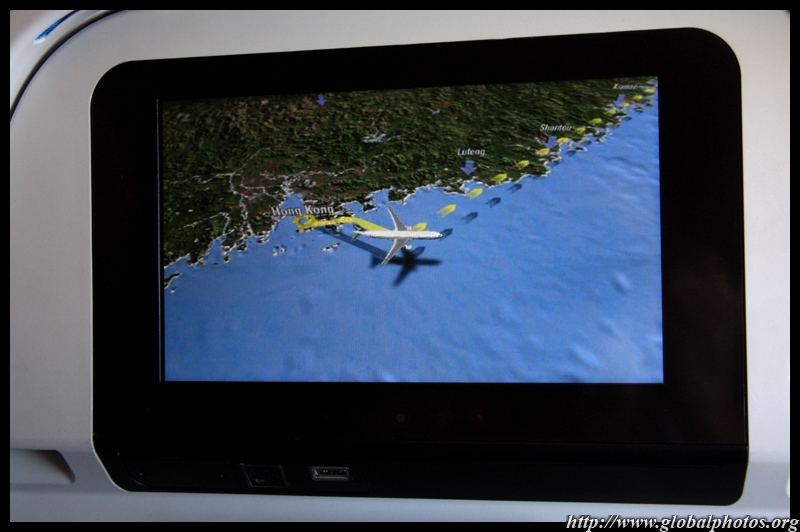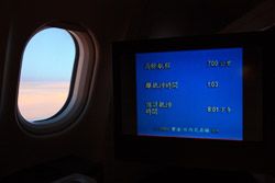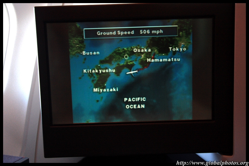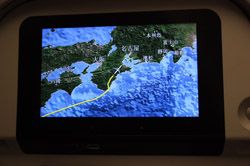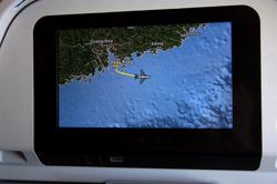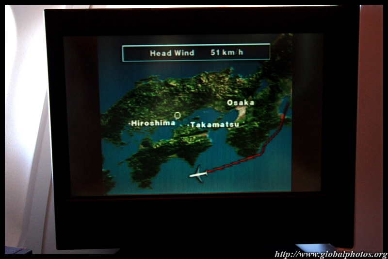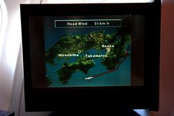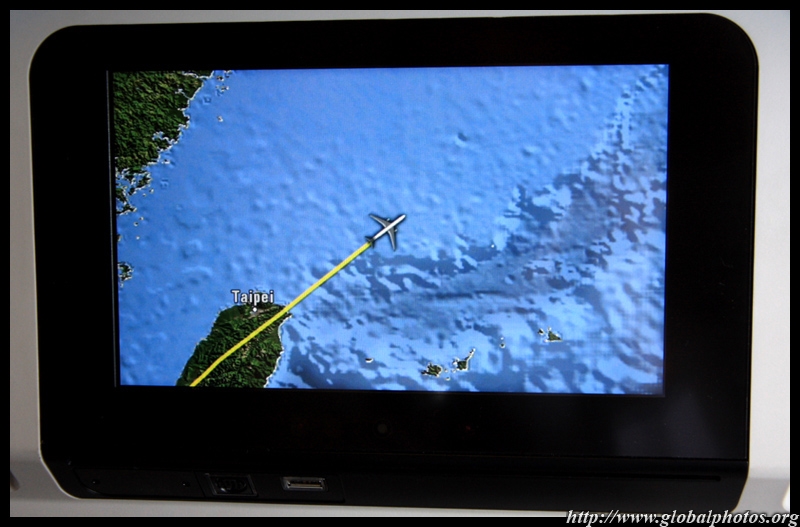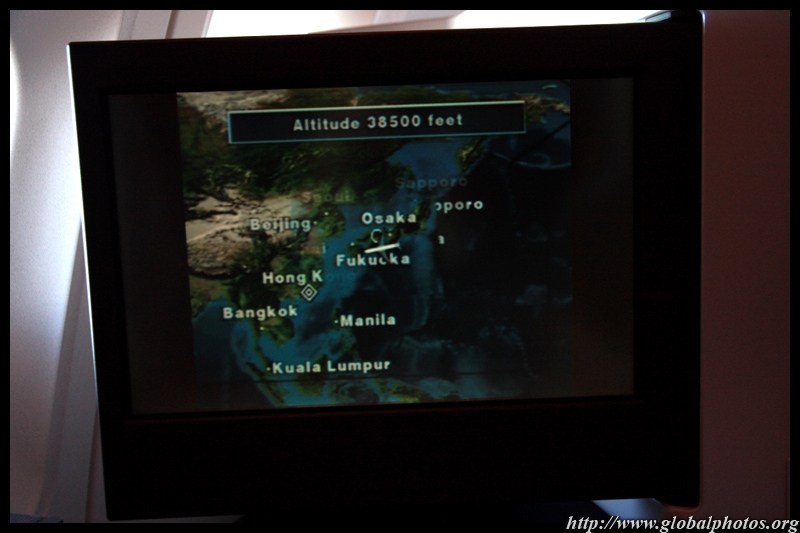 We finally boarded at around 16:30. The line was of no concern to me since I was flying Business Class today. I sat at the last row of the first J cabin, which featured a lovely lie-flat bed and iPod connector to play media on the large TV screen. I noticed the 2 windows were not aligned with the seat so I had to stretch out a bit to get a view of the outside, but I was too lazy to swap for another window seat.