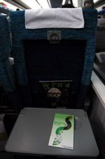The new Economy seat has a lot of neat features. The TV screen is now touch-screen, while there is a small pouch below to store your phone, passport, and other small gadgets. A cup holder unfolds below so you don't need to open the table at all. Economy Class appeared full today, and the crew came by offering Japanese newspapers.