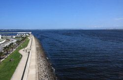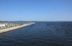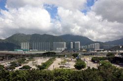 A massive bridge connecting Zhuhai and Macau with Hong Kong is currently under construction. Notice the artificial island futher afield as well as the bridge pylons taking shape.