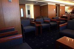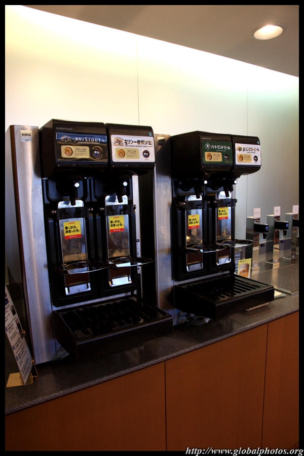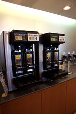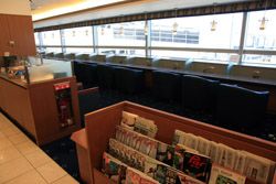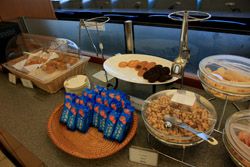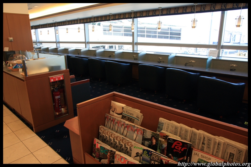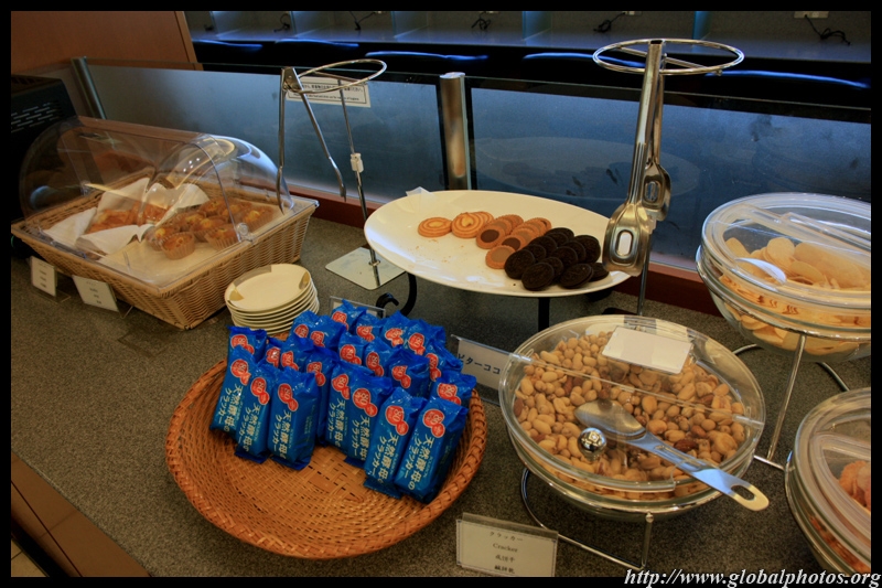 Disappointed, I headed airside to find the Sakura Lounge, which was also deserted. The first part of the lounge was a long row of computer desks facing the tarmac, with a small food section where nuts, cup noodles, sushi, and alcohol were served. The selection was a bit mediocre and there were no hot foods. Further down were a few chairs and then a restaurant-like setting at the back, but I didn't notice any food being served out of there. Unimpressed, I grabbed some nuts and a ginger ale and soon popped back out to the gate 5 minutes before the scheduled boarding time of 15:55.