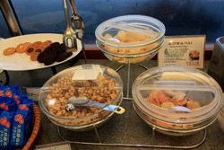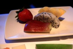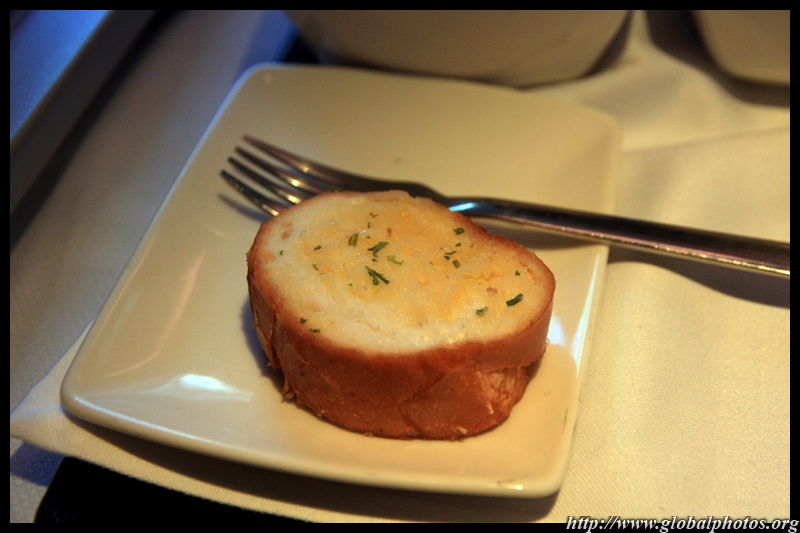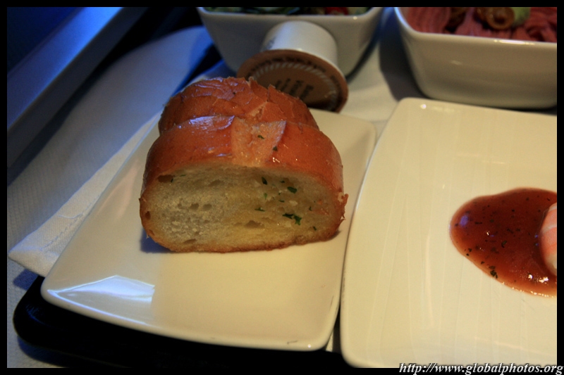 Today's comprehensive meal began with a small salad, shrimp, soba noodles, and a choice of regular or garlic bread. I was more than half full by the time this course was over and the crew wheeled their cart showcasing the mains : chicken or fish. They ran out of the beef option by the time they got to me. I chose the fish, which tasted very good although the plate still looked like Economy Class.