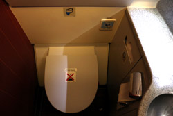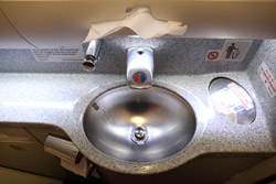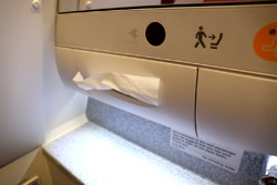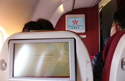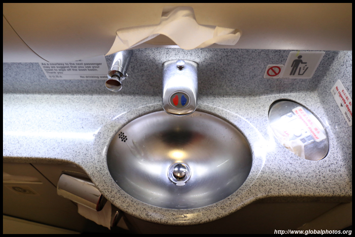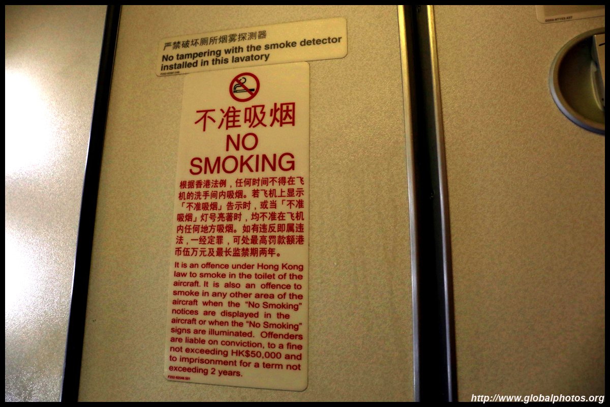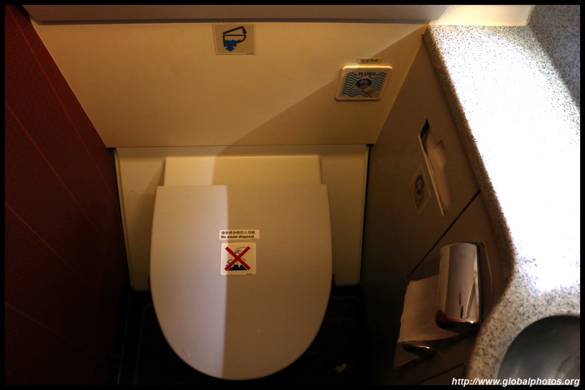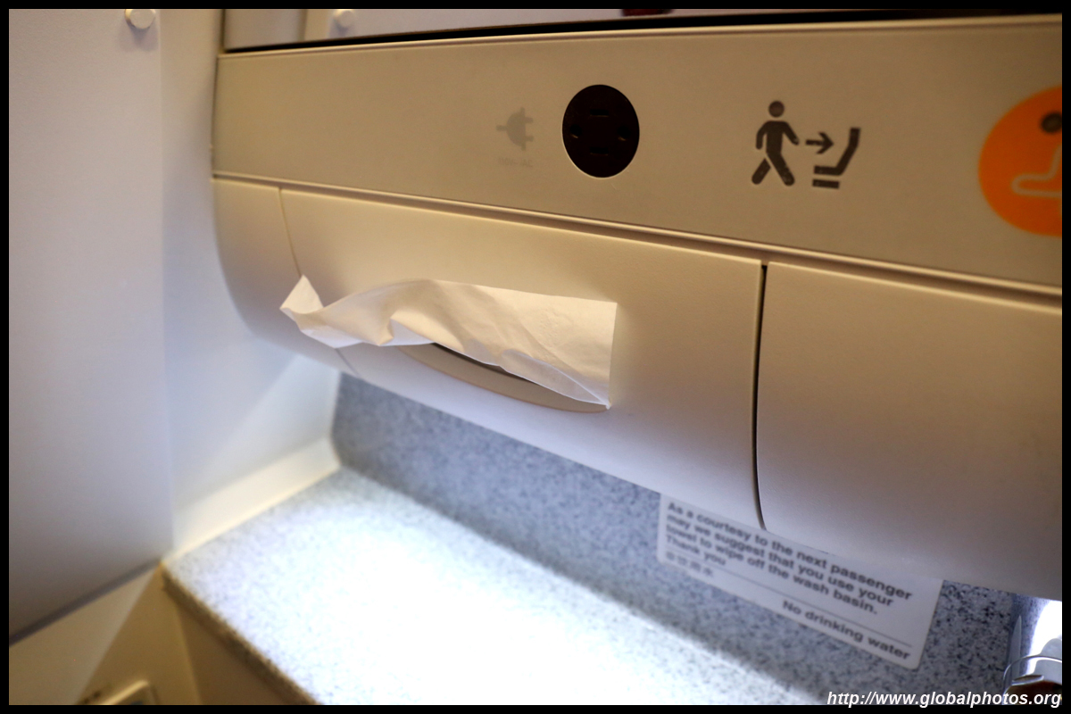 I ventured to the back for a look at the loading. The back section had a lot more people than empty seats. Some were very cautious, wearing a layer of plastic like a raincoat, so they can keep extra clean. The lavatory was clean but with the bare minimum facilities. Notice being a mainland Chinese-backed airline, some of the signage displayed Simplified Chinese, and not the Traditional Chinese used in Hong Kong. Don't let this airline's name fool you - it is not a truly Hong Kong airline.