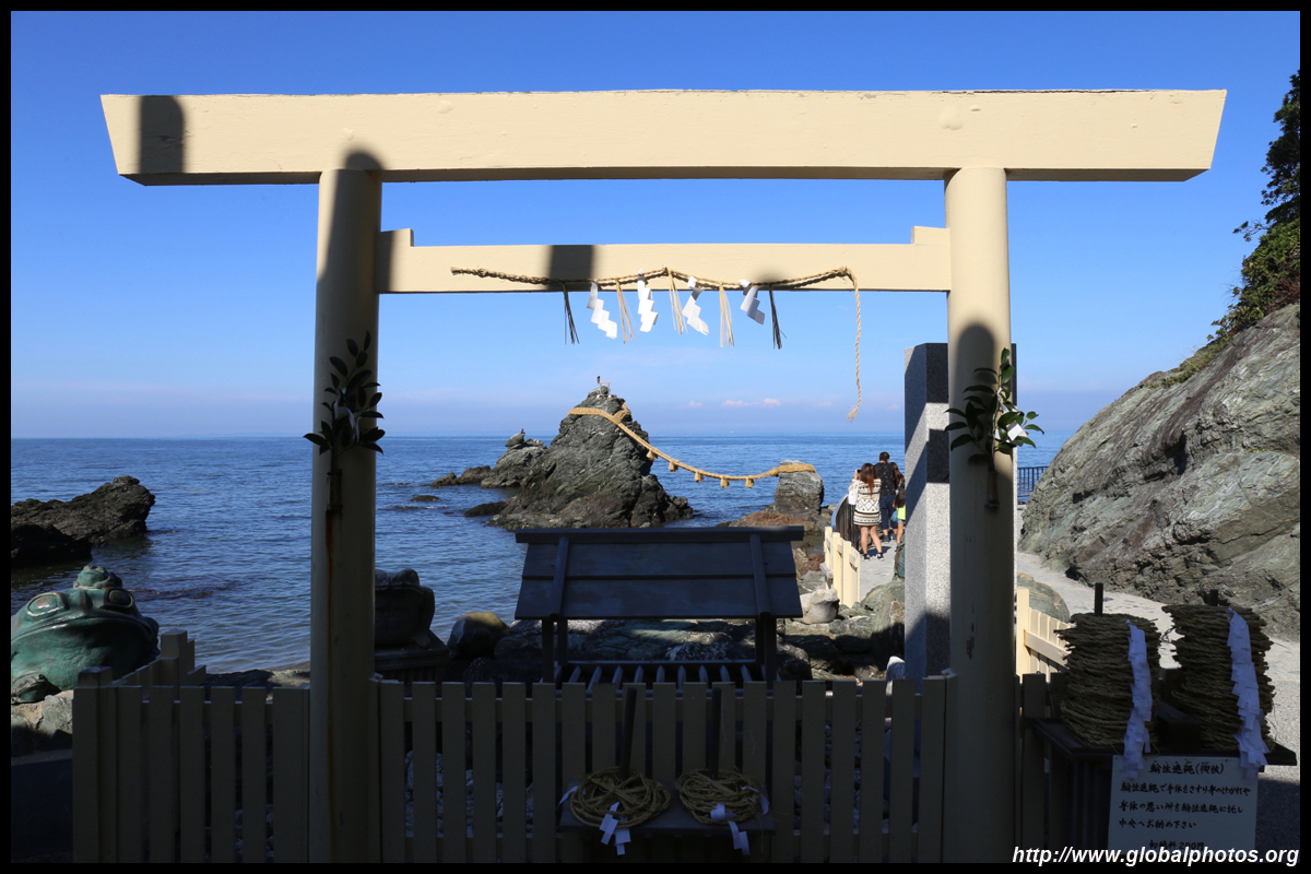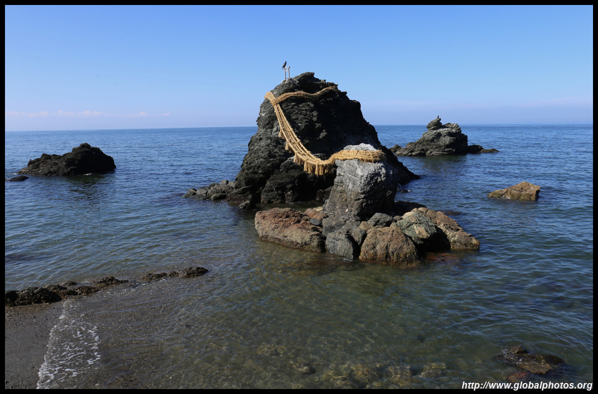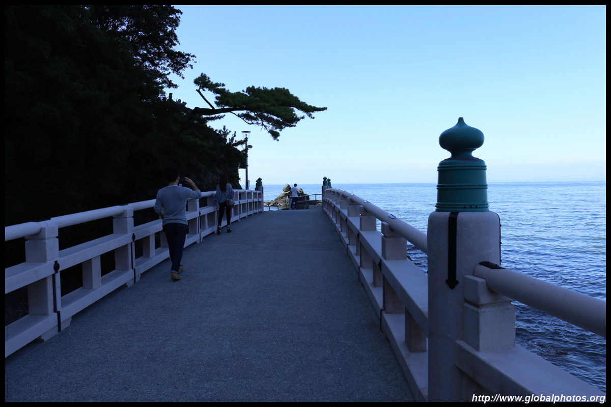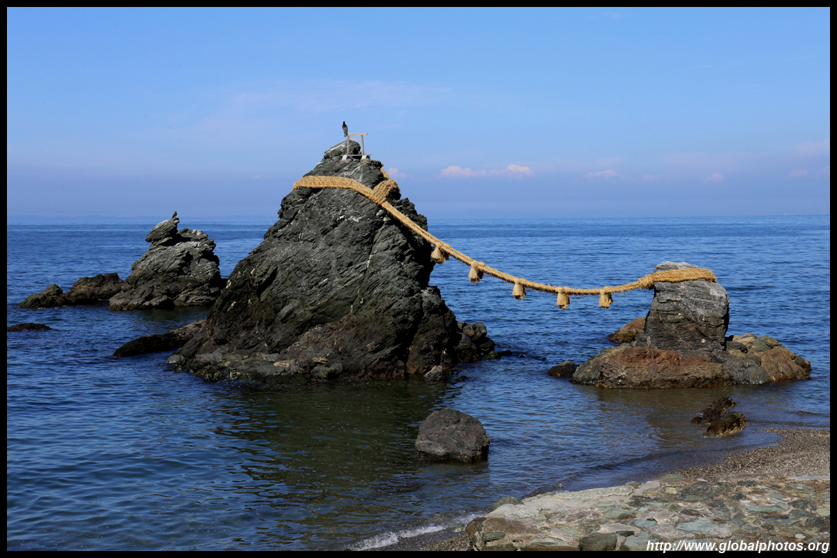 The bus drops you off just after a short tunnel at the aquarium. Then you backtrack and follow the path towards the coast. 2 rocks just off the waterfront have been enshrined as "husband and wife" in a sunrise-worshipping ritual. On the Summer Solstice, the sun rises in between these 2 rocks.