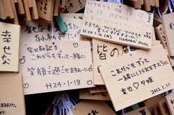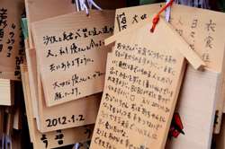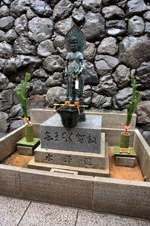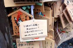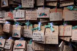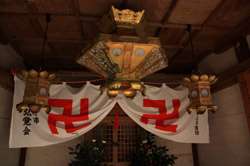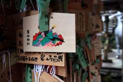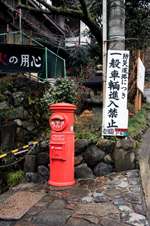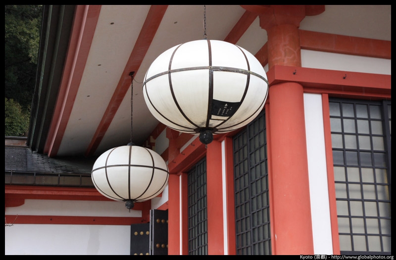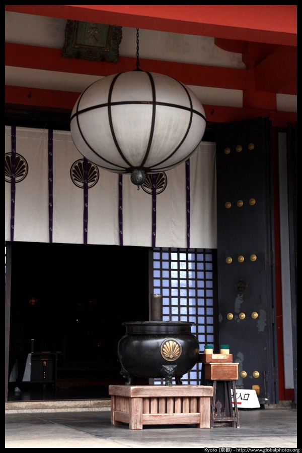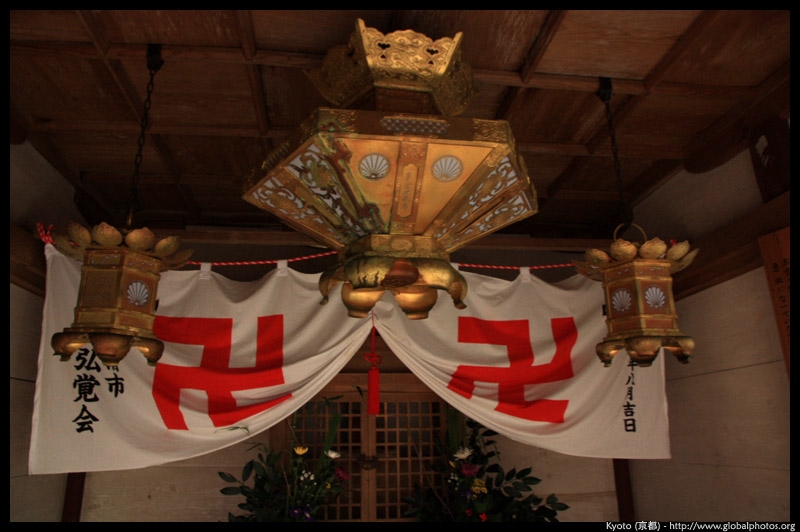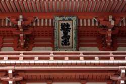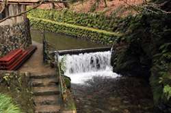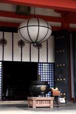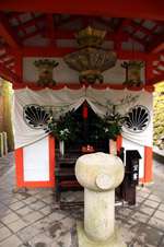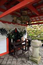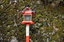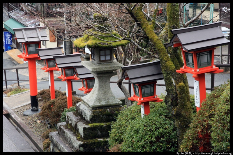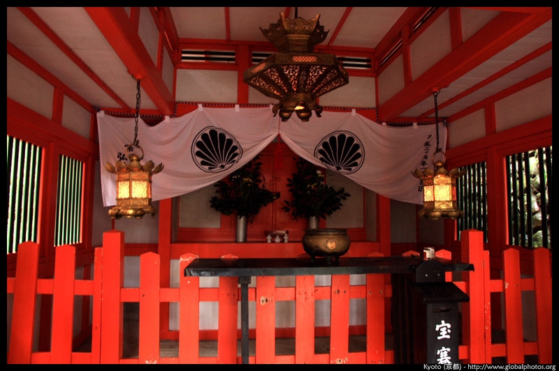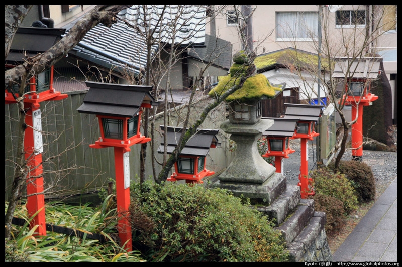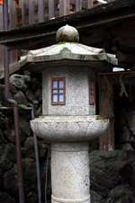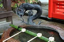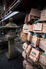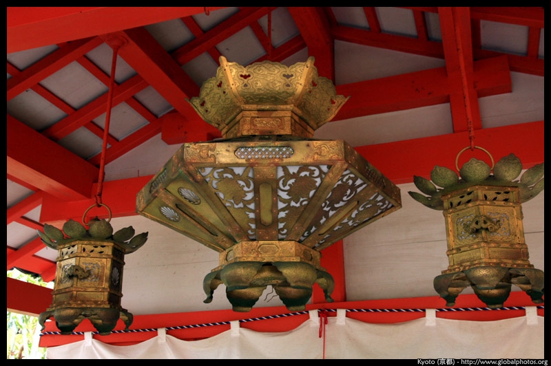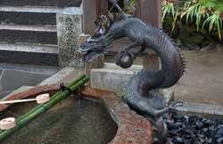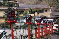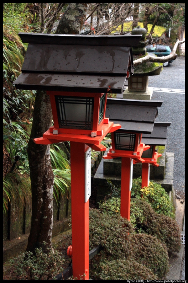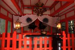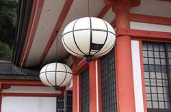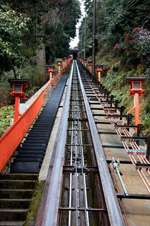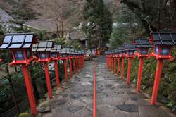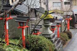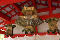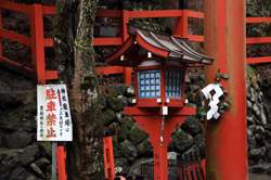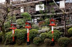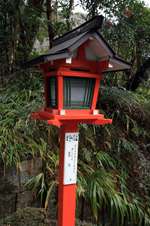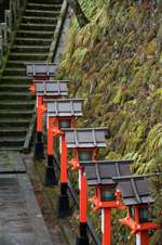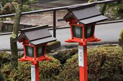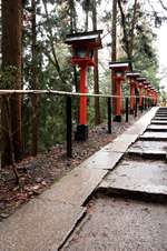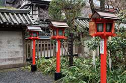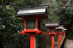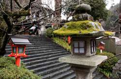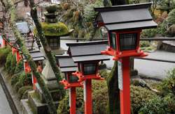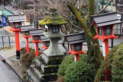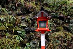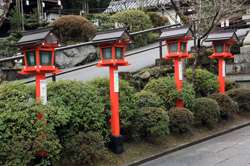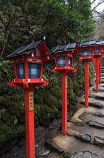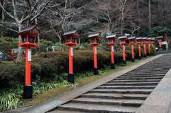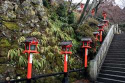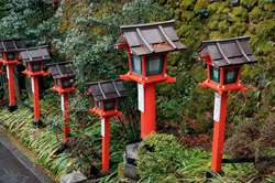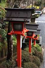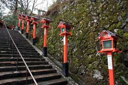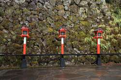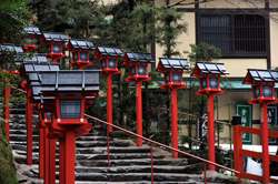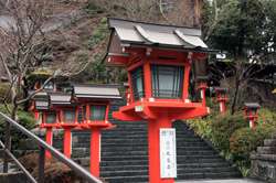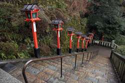 The shrine honours the god of water, with an entrance staircase lined with beautiful red lamps.