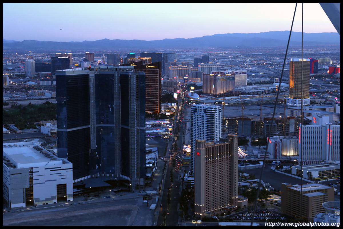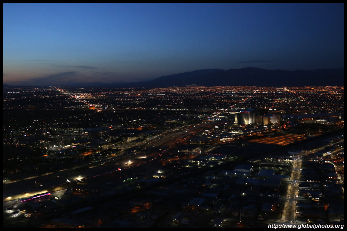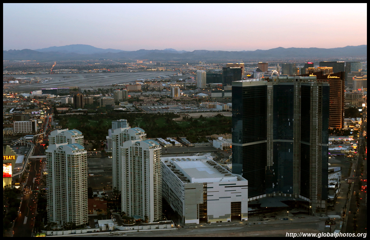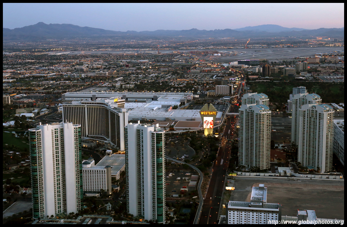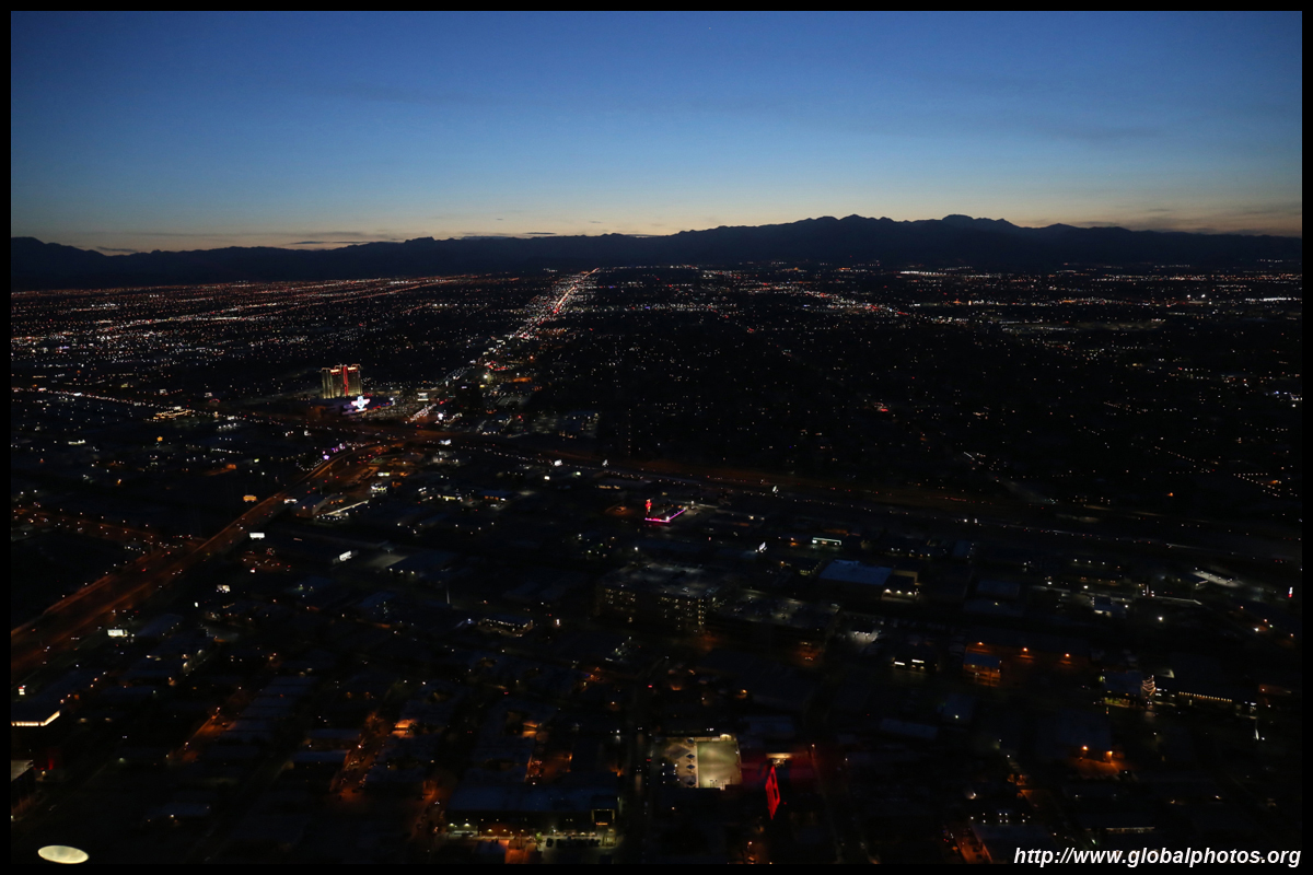 Looking south, development is heavily clustered along Las Vegas Blvd. Some new glassy towers have gone up over the years. The last major resort on the Strip is the yellow-glass Mandalay Bay in the distance.