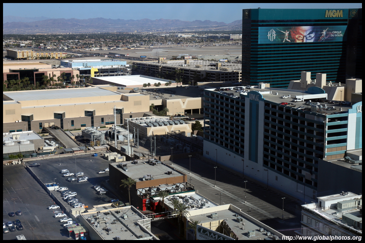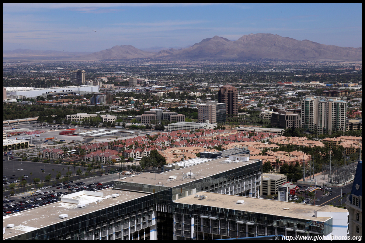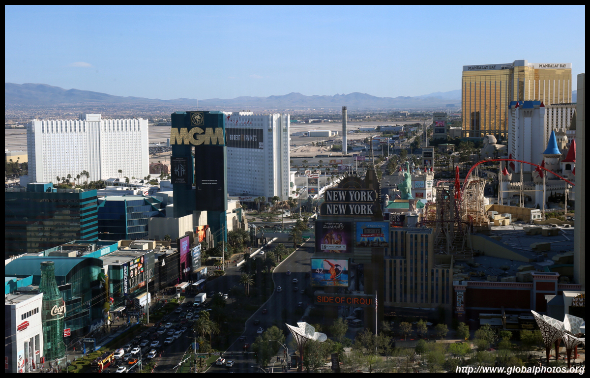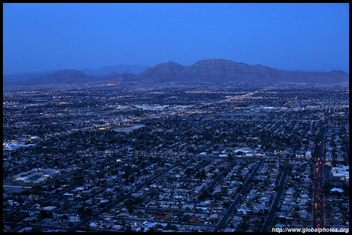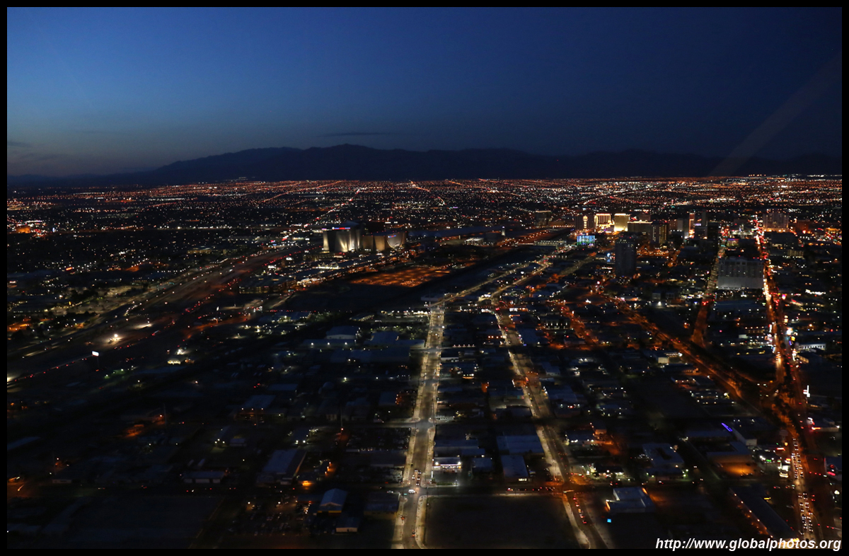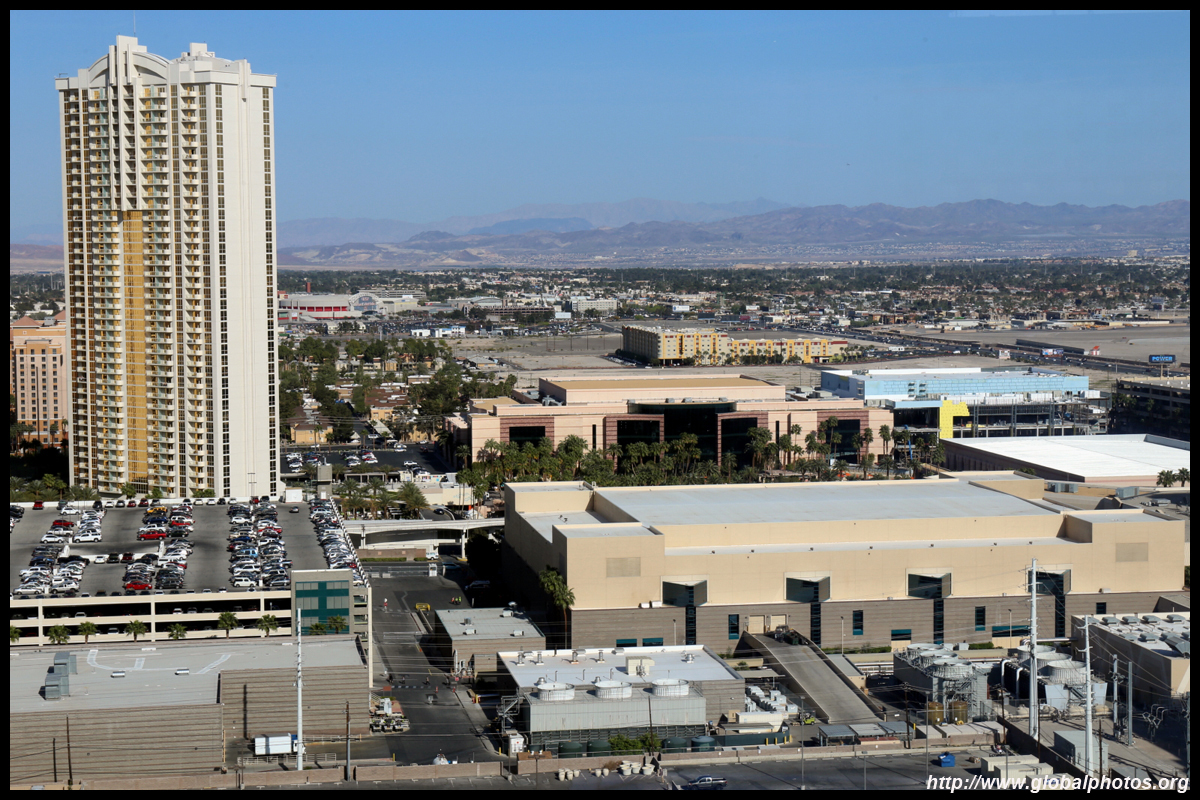 Looking south, development is heavily clustered along Las Vegas Blvd. Some new glassy towers have gone up over the years. The last major resort on the Strip is the yellow-glass Mandalay Bay in the distance.