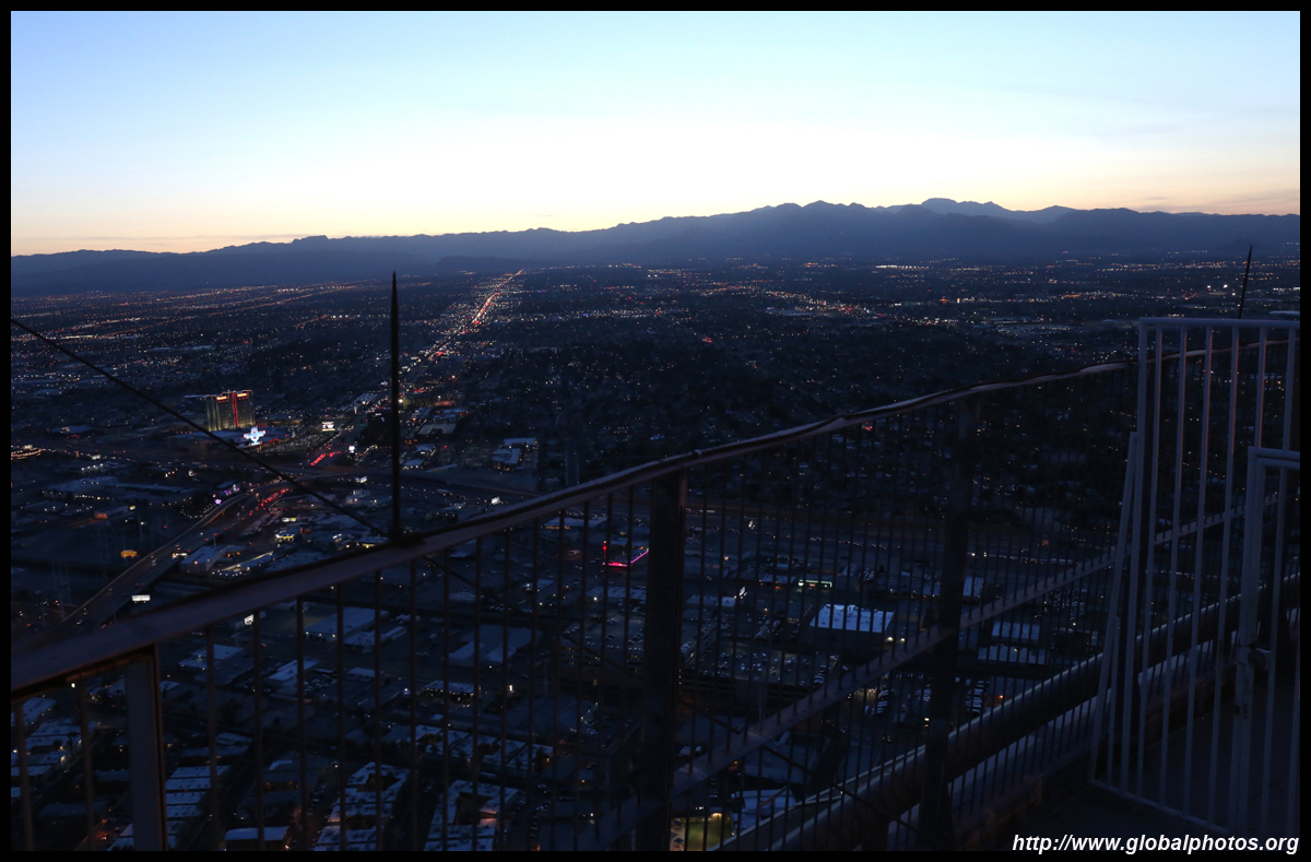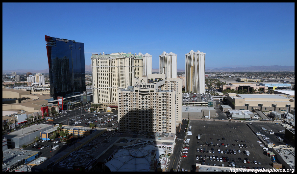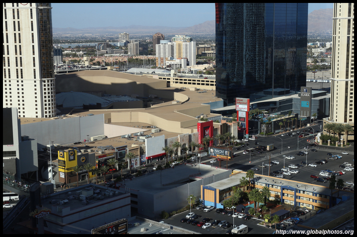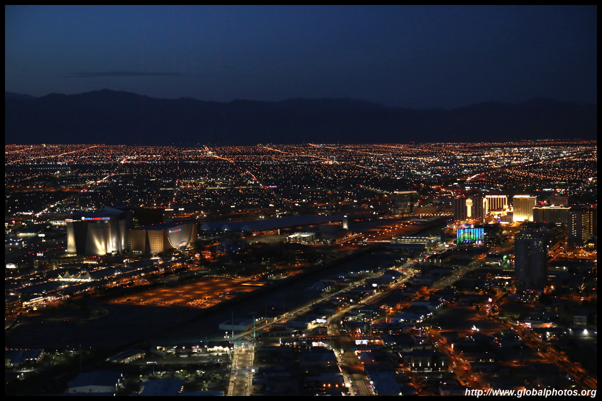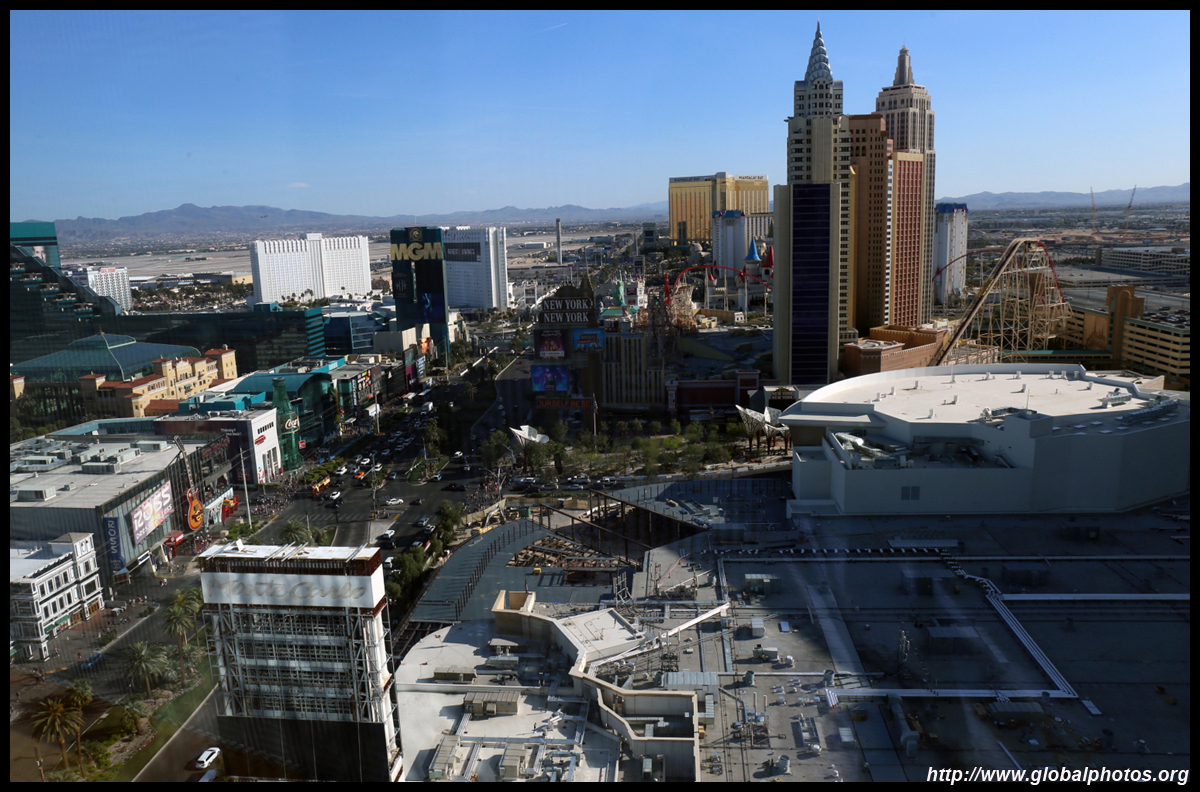 Looking south, development is heavily clustered along Las Vegas Blvd. Some new glassy towers have gone up over the years. The last major resort on the Strip is the yellow-glass Mandalay Bay in the distance.