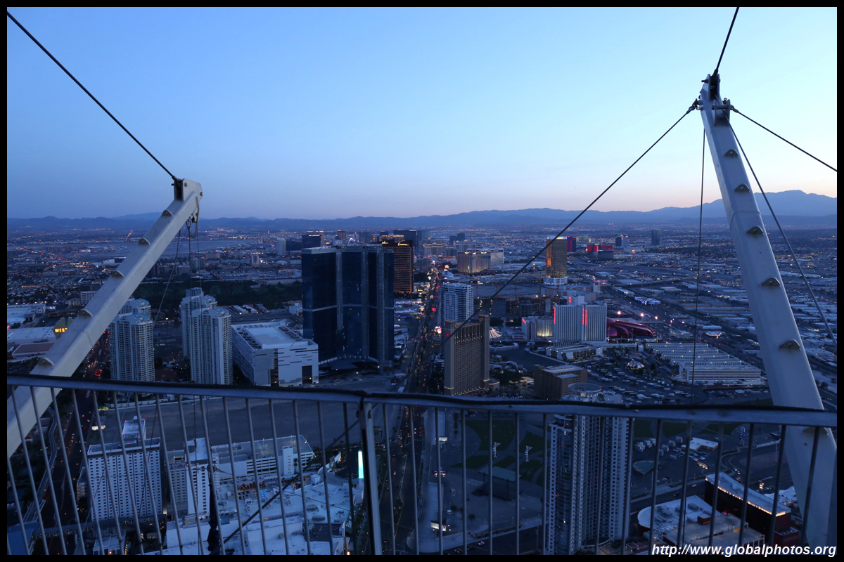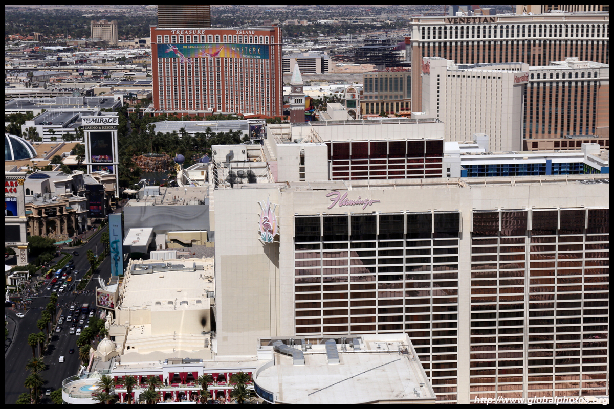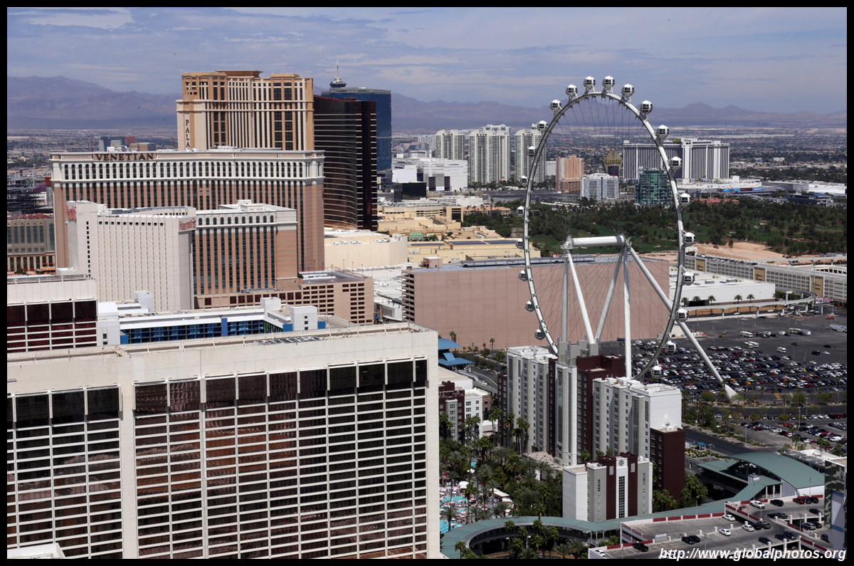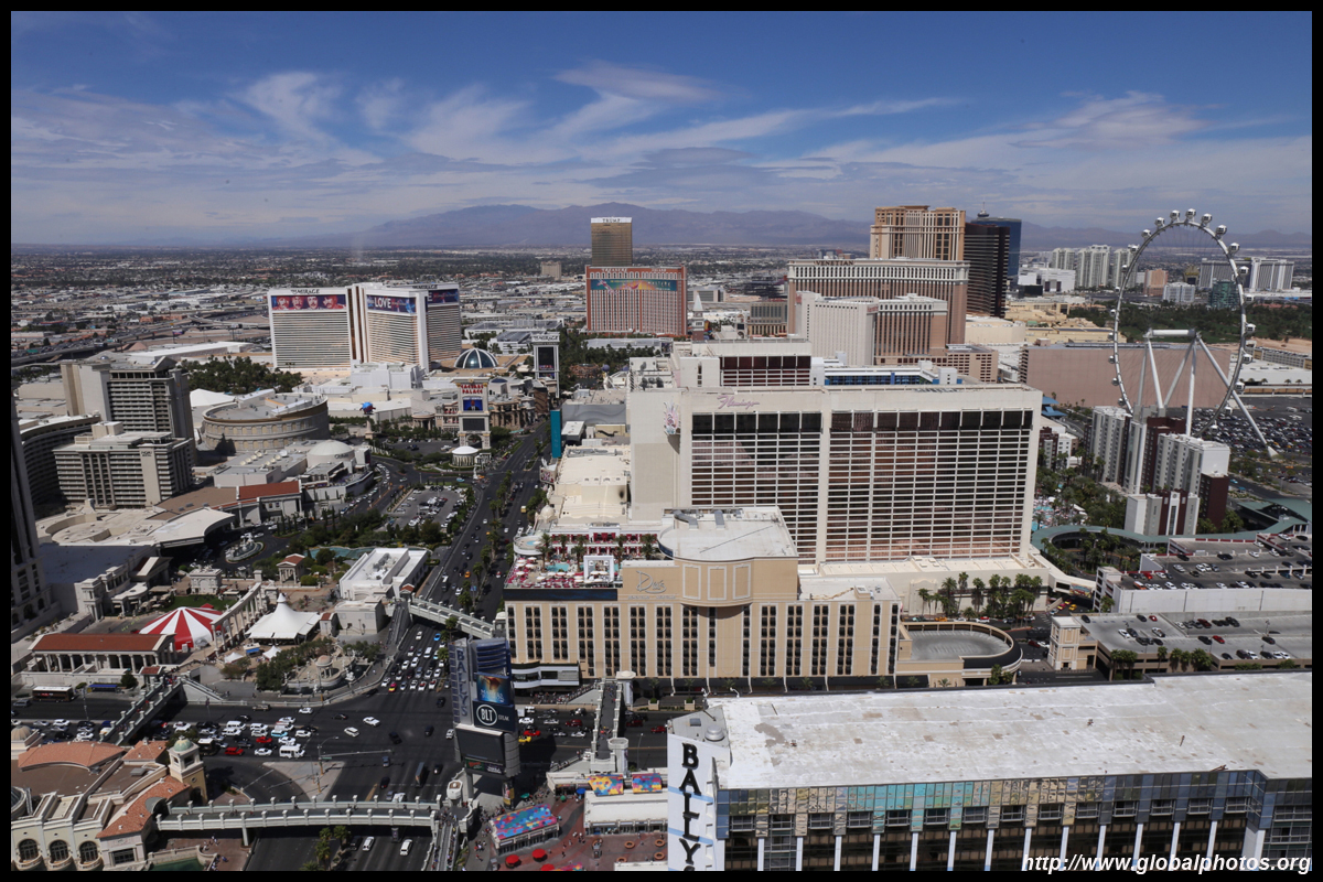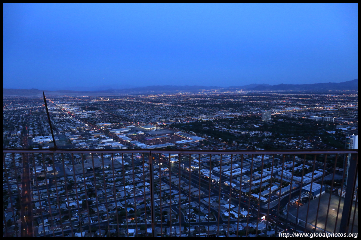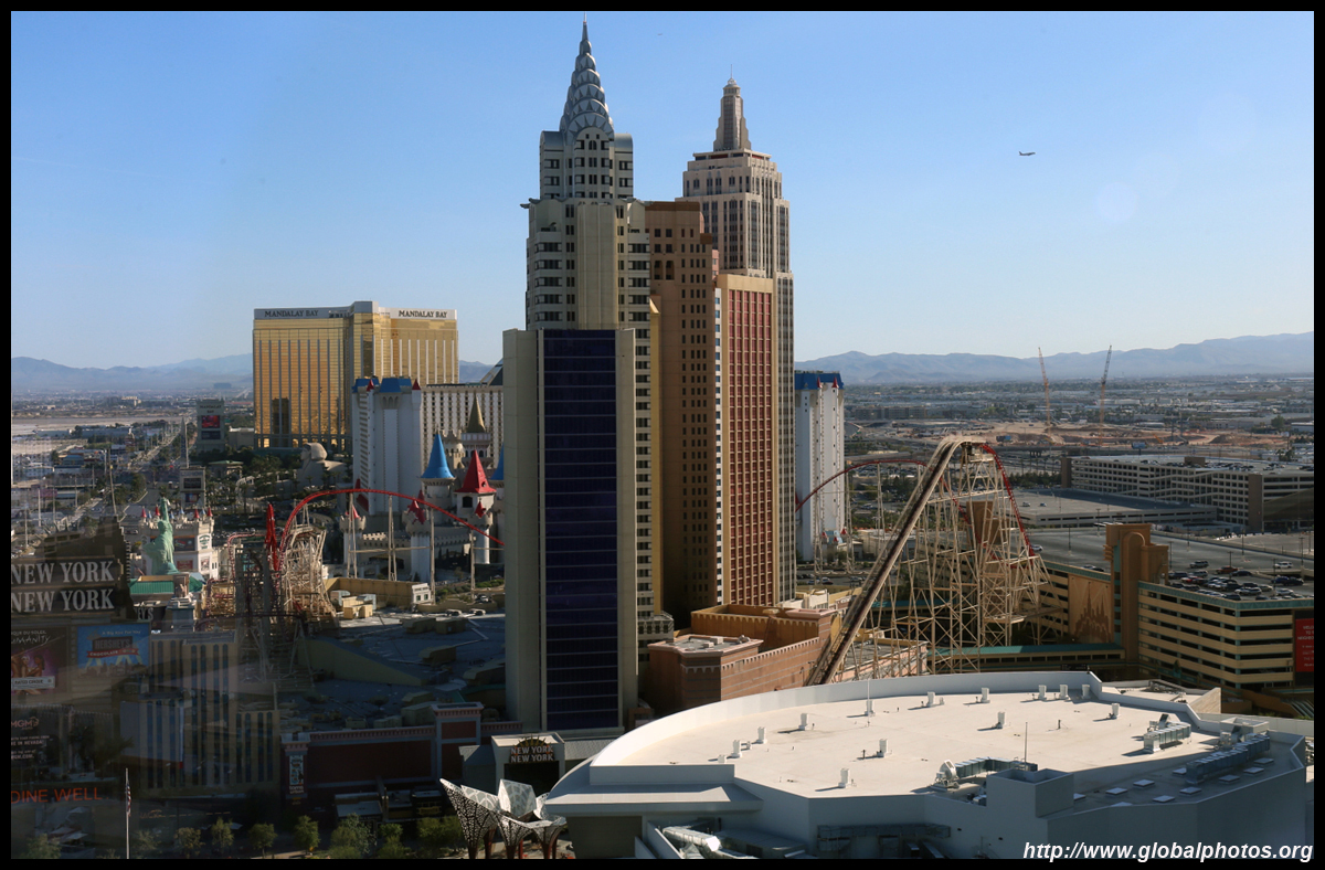 Looking south, development is heavily clustered along Las Vegas Blvd. Some new glassy towers have gone up over the years. The last major resort on the Strip is the yellow-glass Mandalay Bay in the distance.