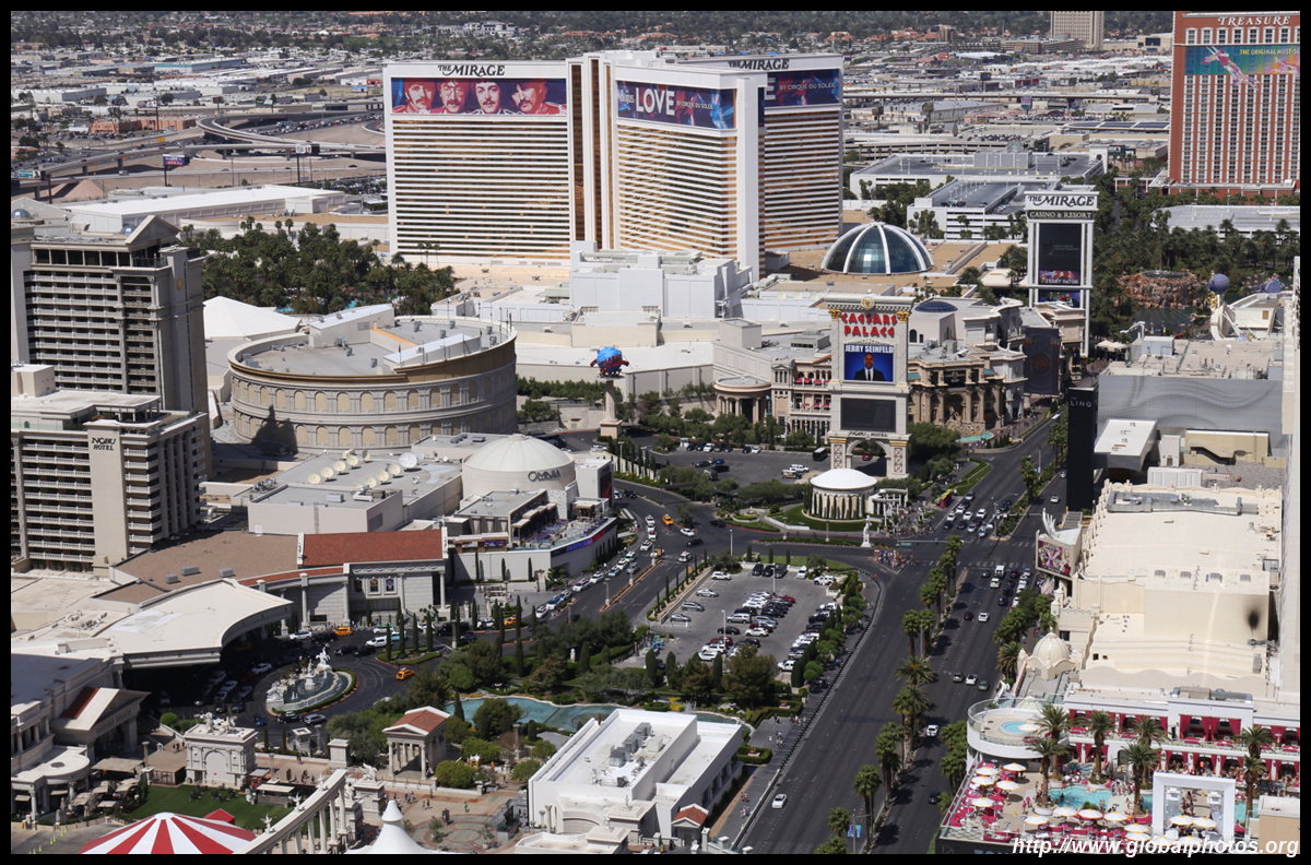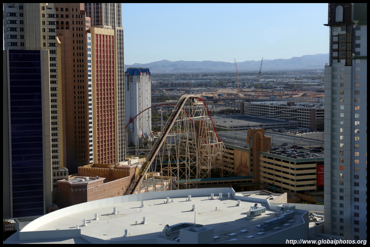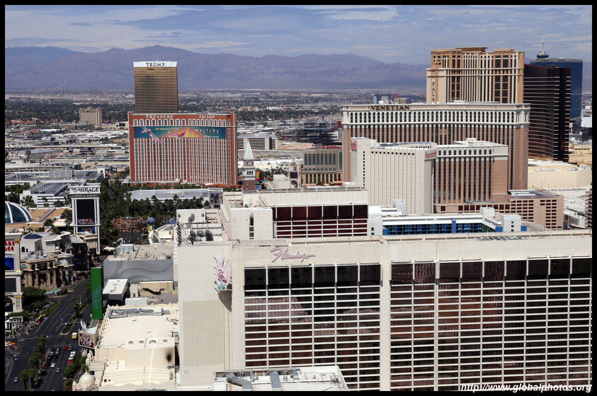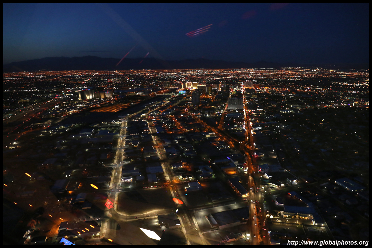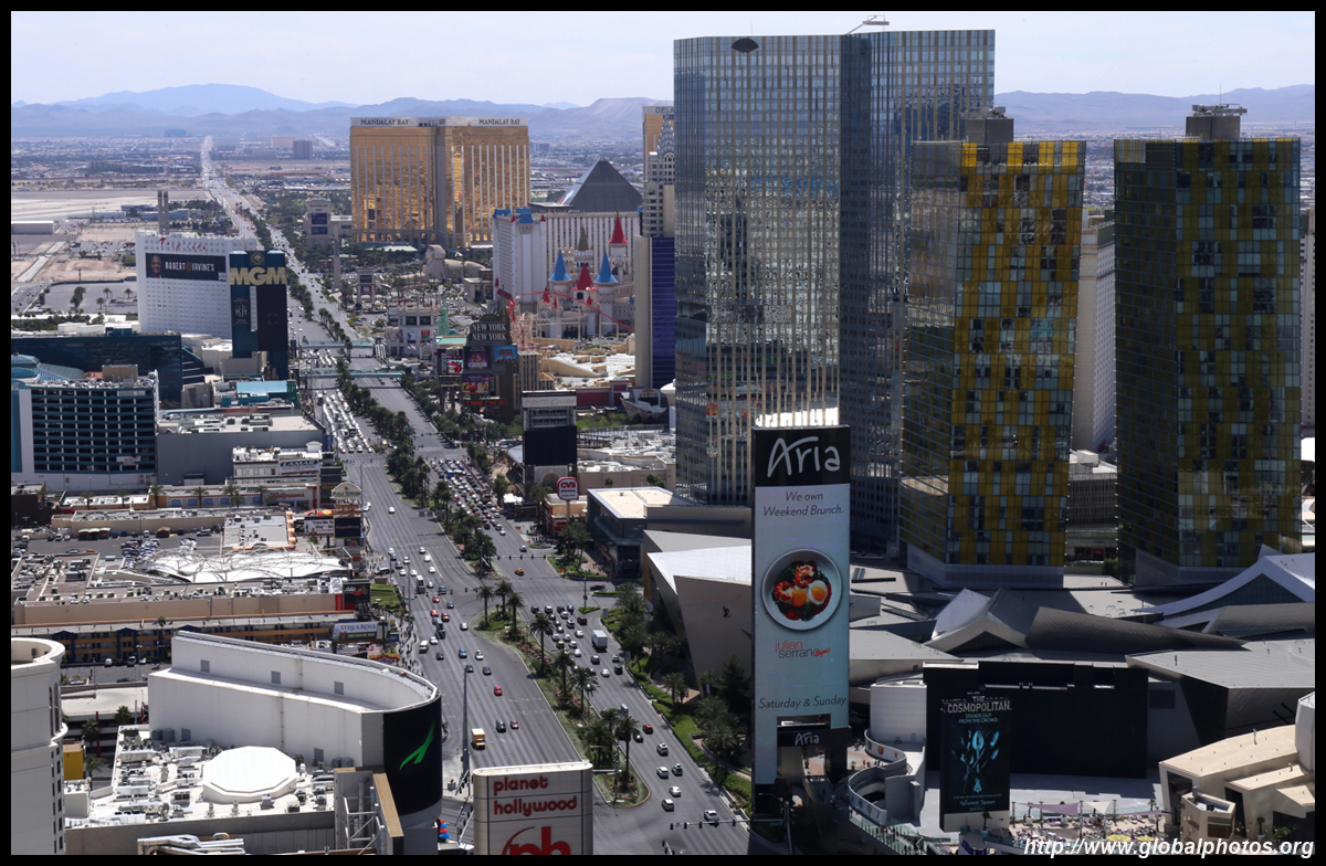 Looking south, development is heavily clustered along Las Vegas Blvd. Some new glassy towers have gone up over the years. The last major resort on the Strip is the yellow-glass Mandalay Bay in the distance.