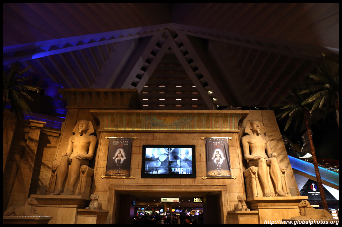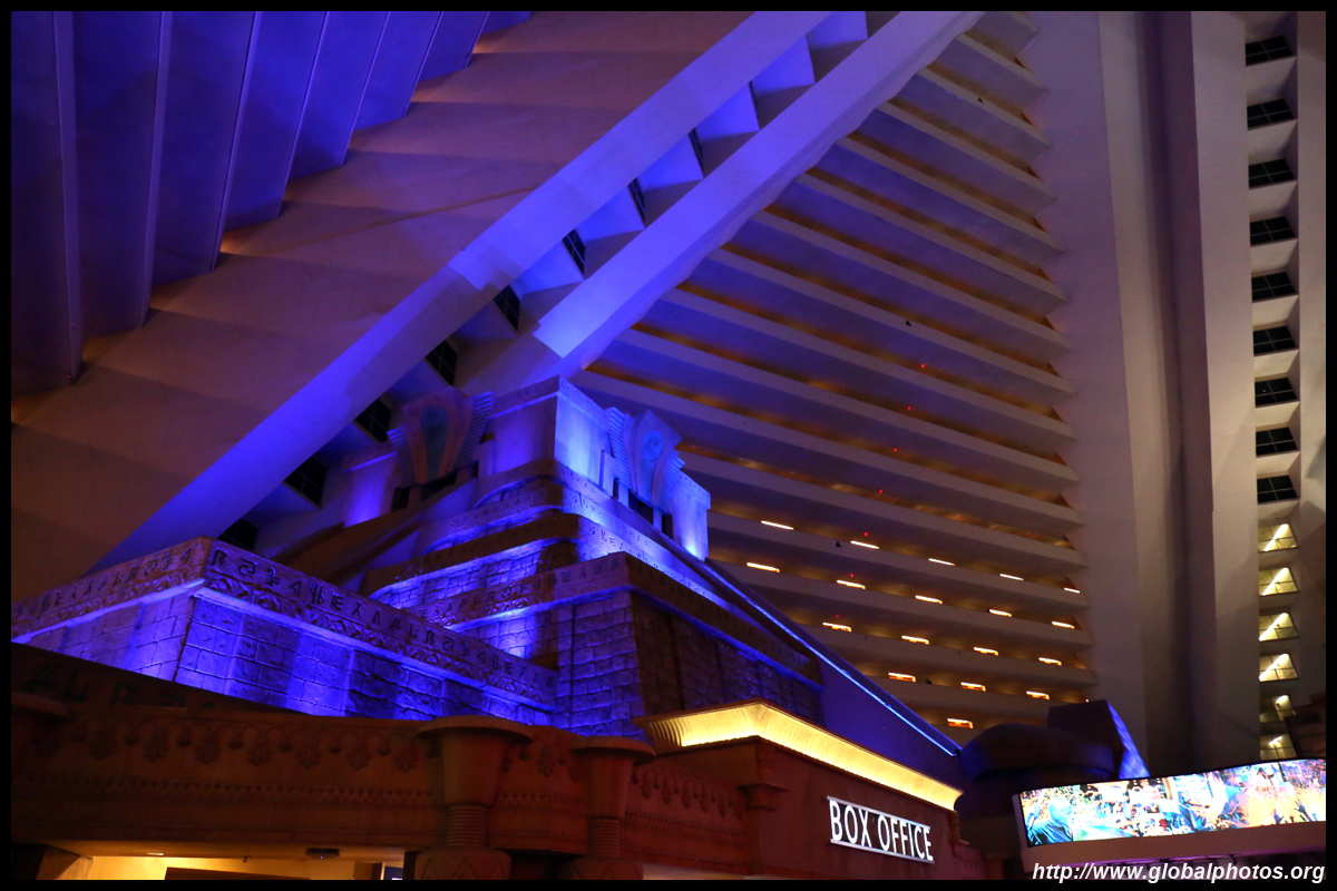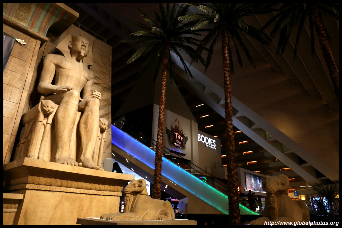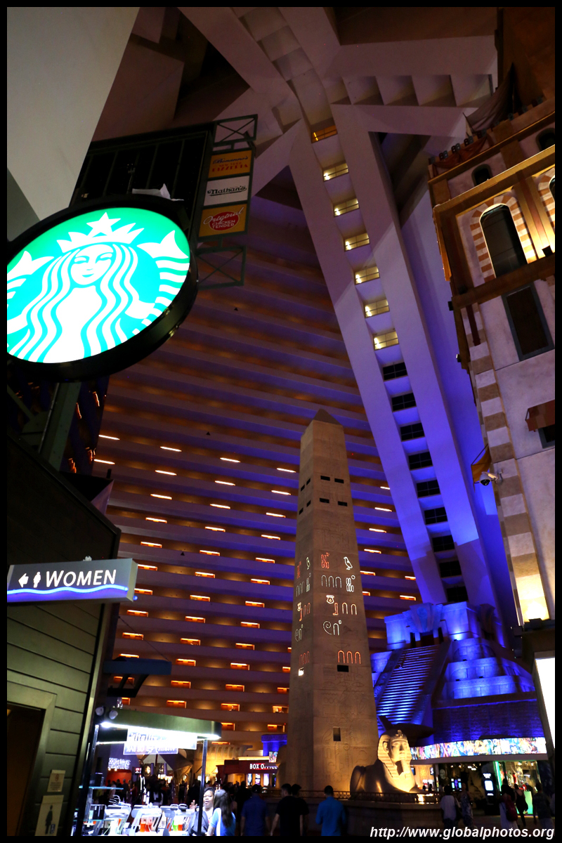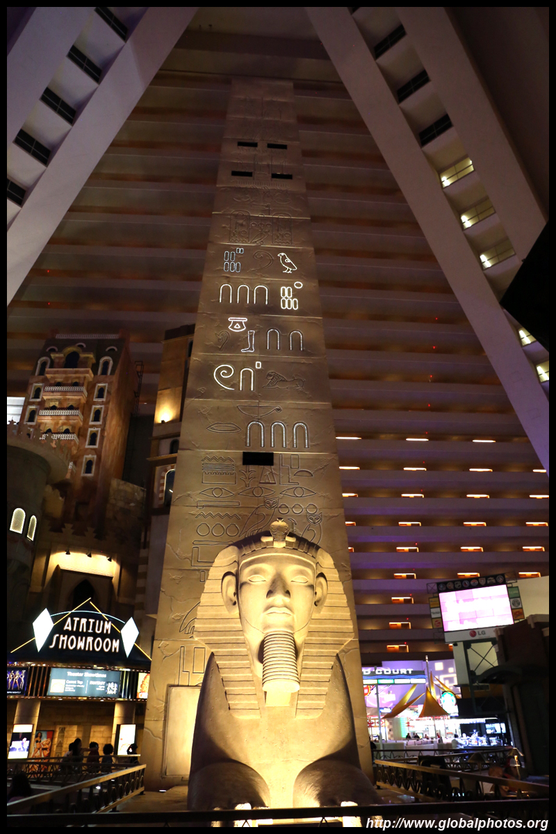 Next door, you have arrived in Egypt. The Luxor was built in 1993 with the world's largest open atrium inside. Elevators are slanted as they run parallel to the pyramid structure.