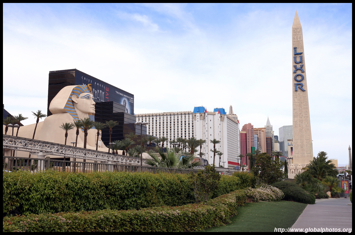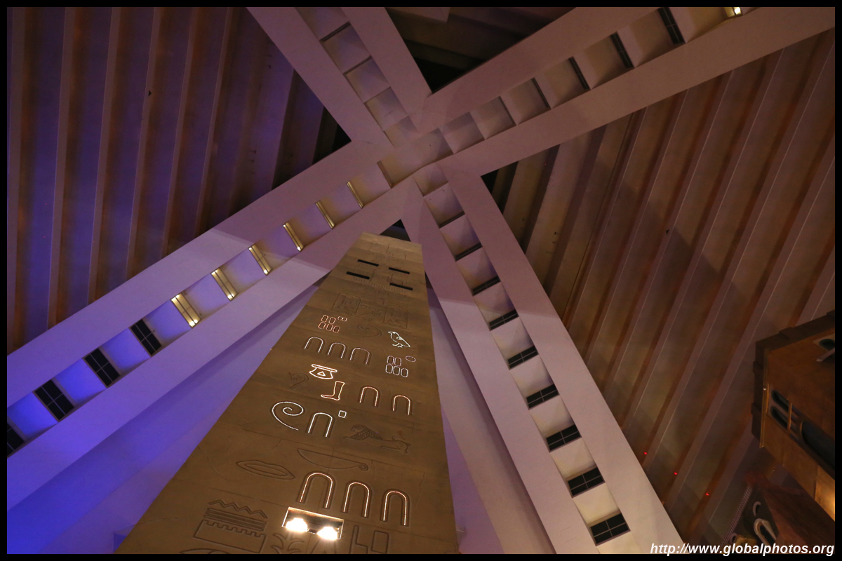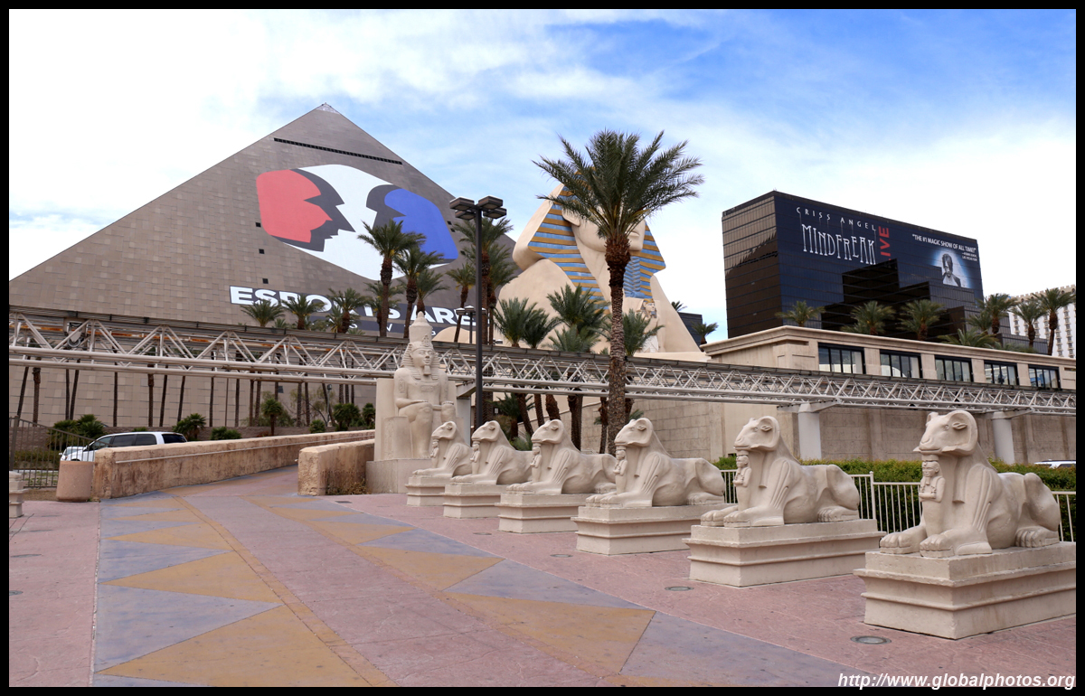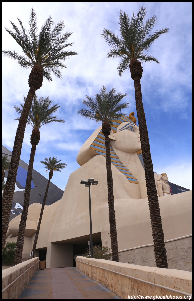 Next door, you have arrived in Egypt. The Luxor was built in 1993 with the world's largest open atrium inside. Elevators are slanted as they run parallel to the pyramid structure.