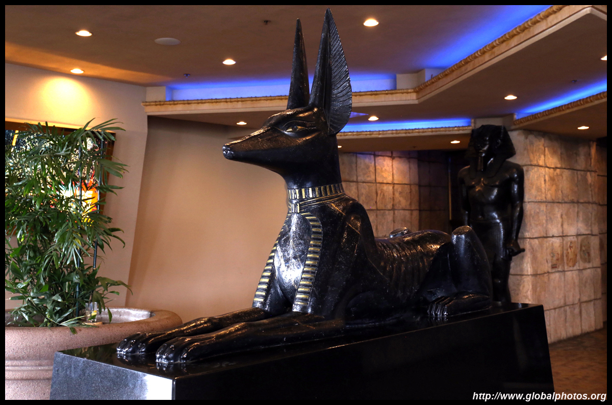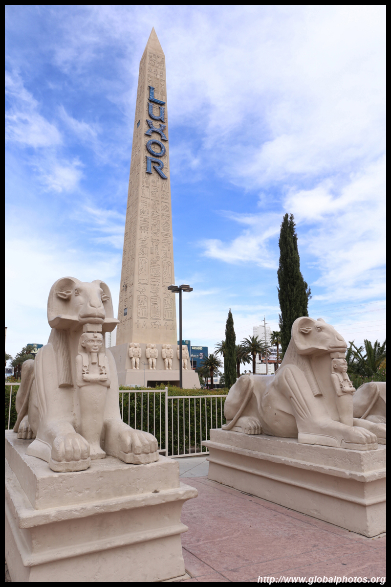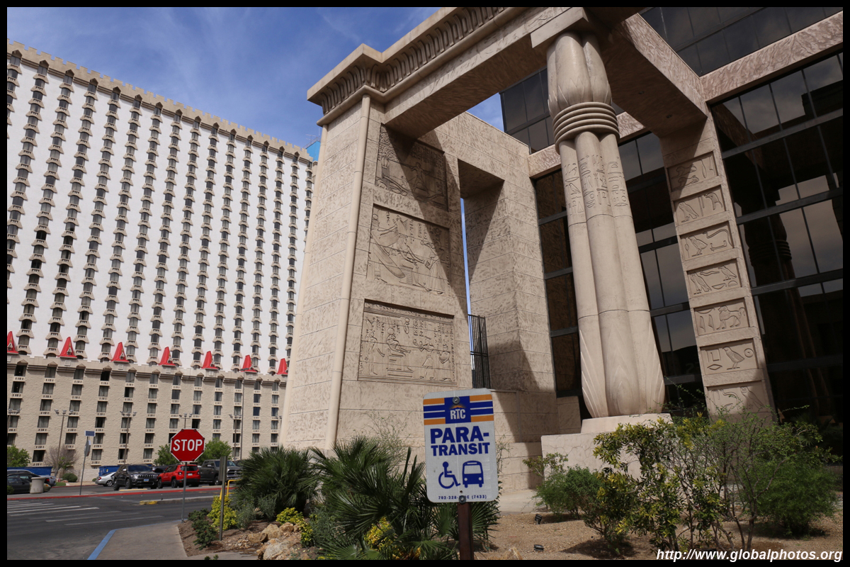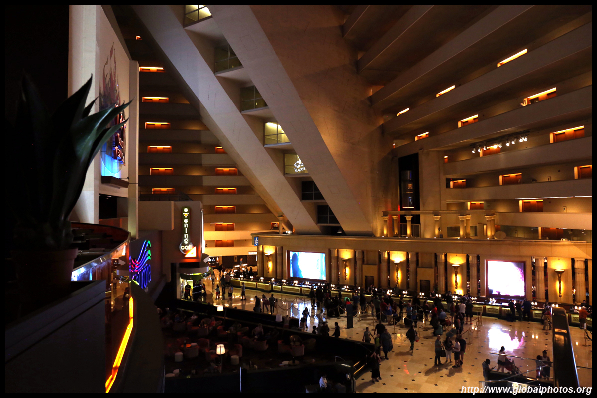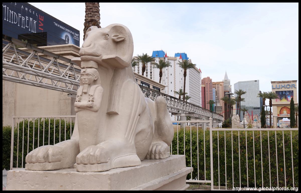 Next door, you have arrived in Egypt. The Luxor was built in 1993 with the world's largest open atrium inside. Elevators are slanted as they run parallel to the pyramid structure.