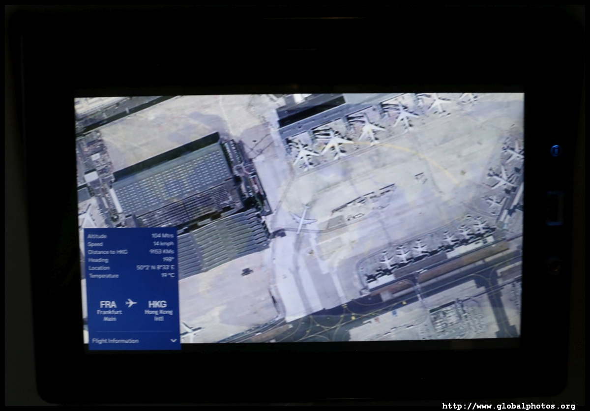 Boarding finished at 8:51pm and we pushed back at 9:13pm. It is interesting to see Lufthansa staffs this flight with a few Mandarin-speaking flight attendants even though local Hong Kongers don't speak Mandarin but Cantonese. Even the flight map would display in Simplified Chinese at times but we use Traditional Chinese. However, there were a number of Mandarin-speaking passengers on board. Flights to China are also severely restricted due to an even more onerous COVID-zero strategy so they would have to endure 2 sets of quarantine in Hong Kong and in China to get home. With a timely departure and a bit tired from the long ordeal that started in London, I breathed a sigh of relief and tried to enjoy this long flight. Interestingly, the crew announced there were 3 empty seats up in Premium Economy and Business and to contact them if anyone wants to pay for an upgrade. That's the first time I heard of on-board upgrades. While the moving map cannot be customized but various views rotate regularly, I was impressed by how detailed the satellite positioning can get, tracking us from a very exact location on the airport grounds and moving across the tarmac.